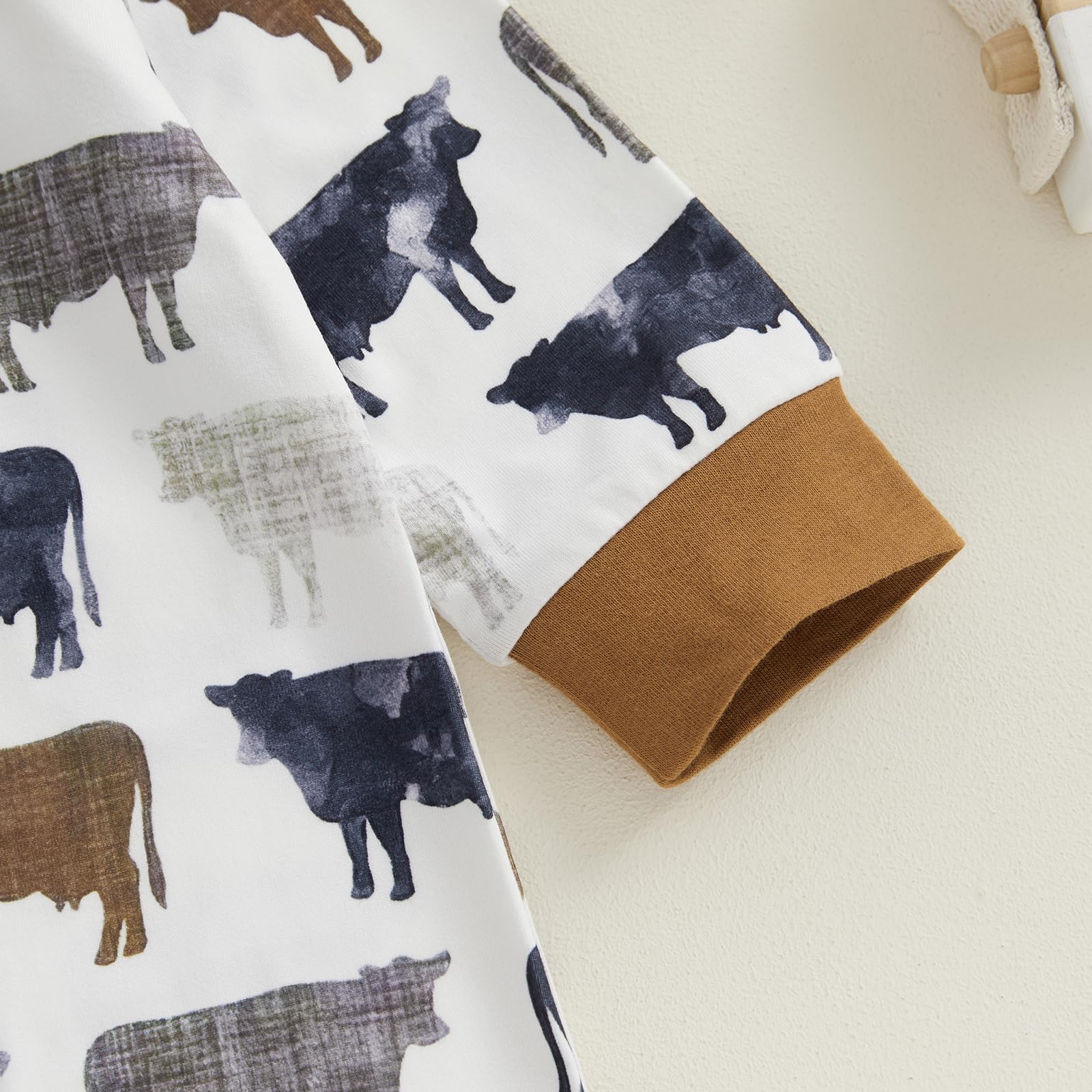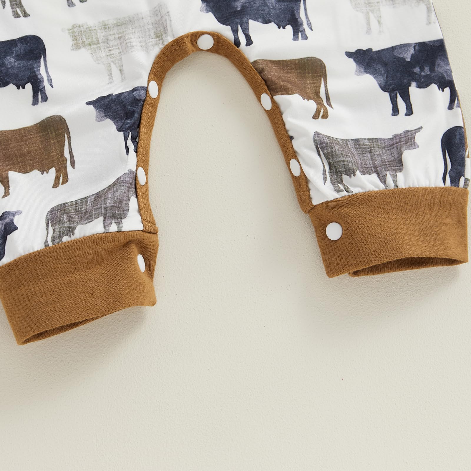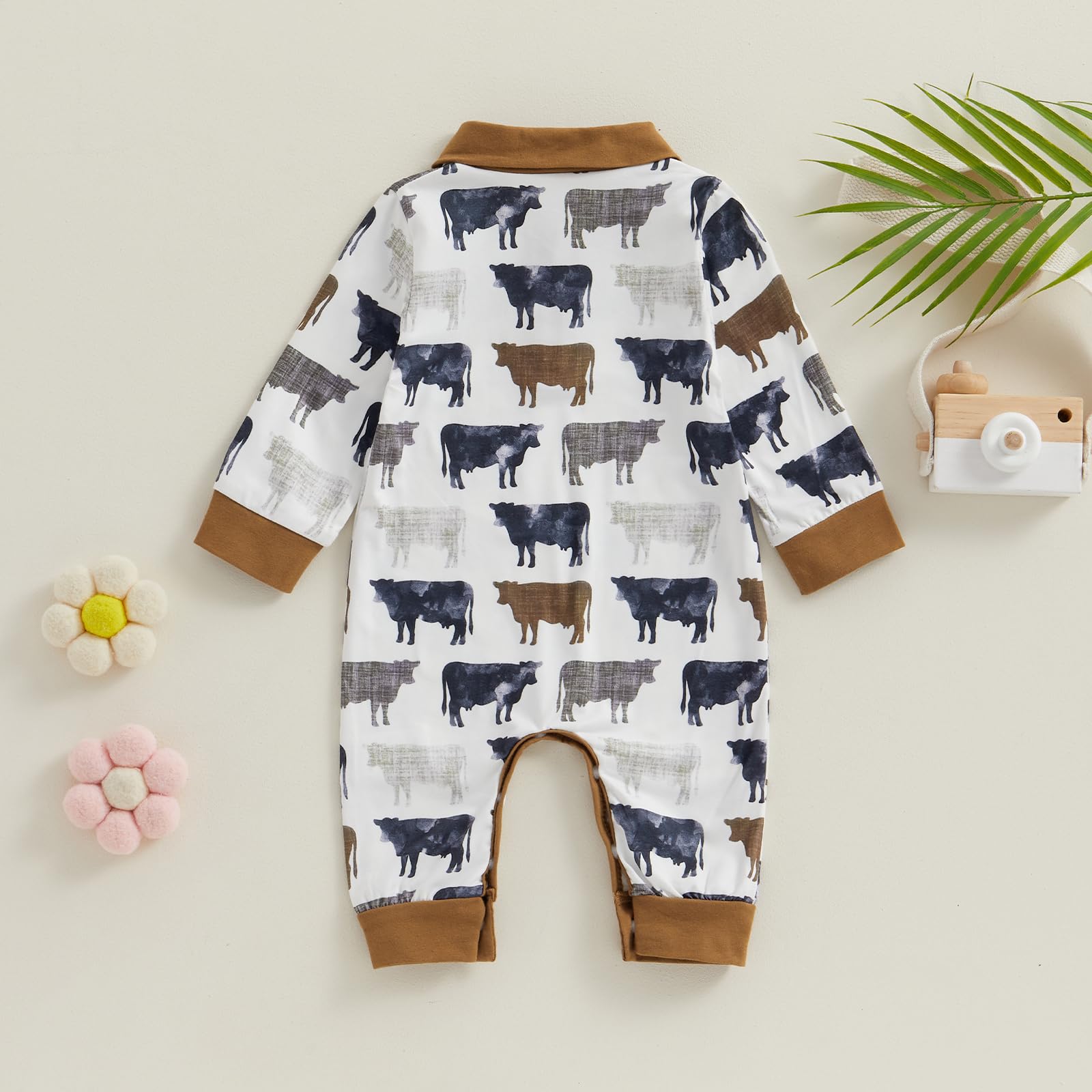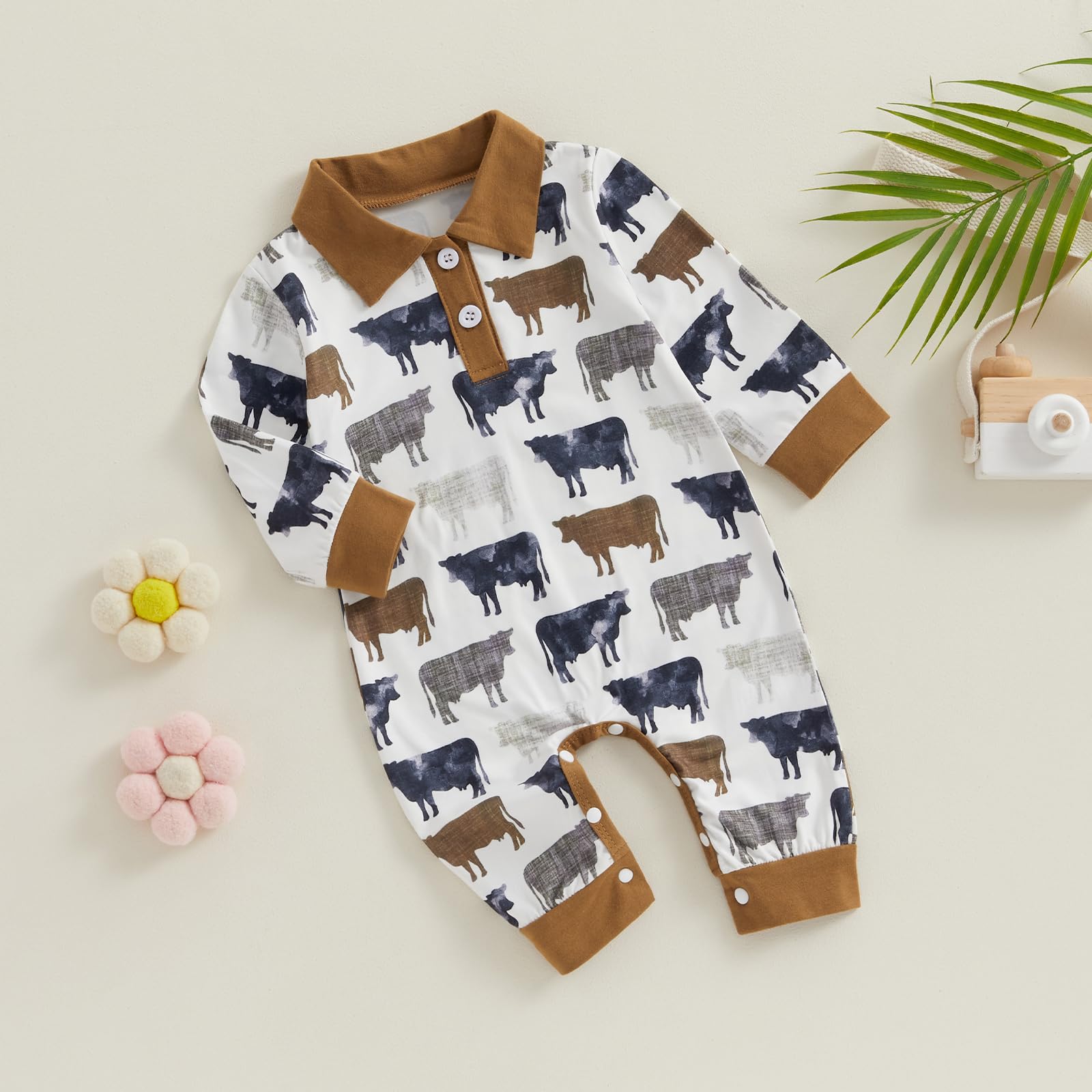Feature: Cotton infant newborn cute western baby boy fall clothes, highland cow print polo romper jumpsuit one piece outfits, cowboy country clothing.Newborn boy romper with long sleeve, lapel collar, cow print, button down, loose fit design, cute and stylish. Let your baby shine in the audience.