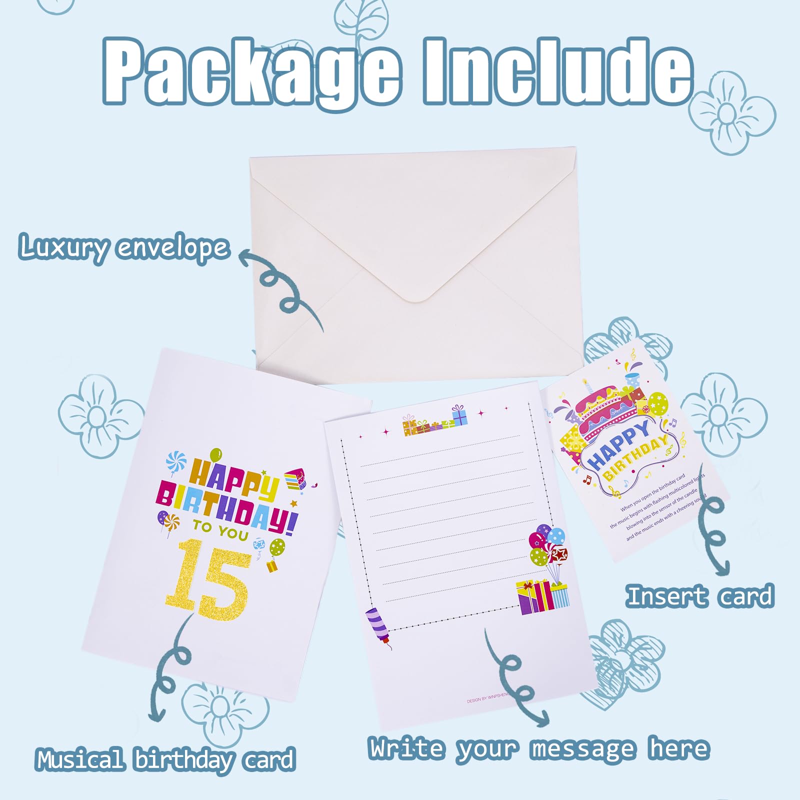 Lasting Memories on 15TH Birthday: This music card features several flashing modes and colors, and multicolored sparkling lights glow in sync with the birthday song. Combination of audio and visual technology definitely creates a little happy birthday time or send best wishes to girls, boys, daughter, son or other relatives and friends. Classic luxury envelope that is sealable for easy mailing. Also, there is a blank space on the back of the card for you to write your blessing message freely
