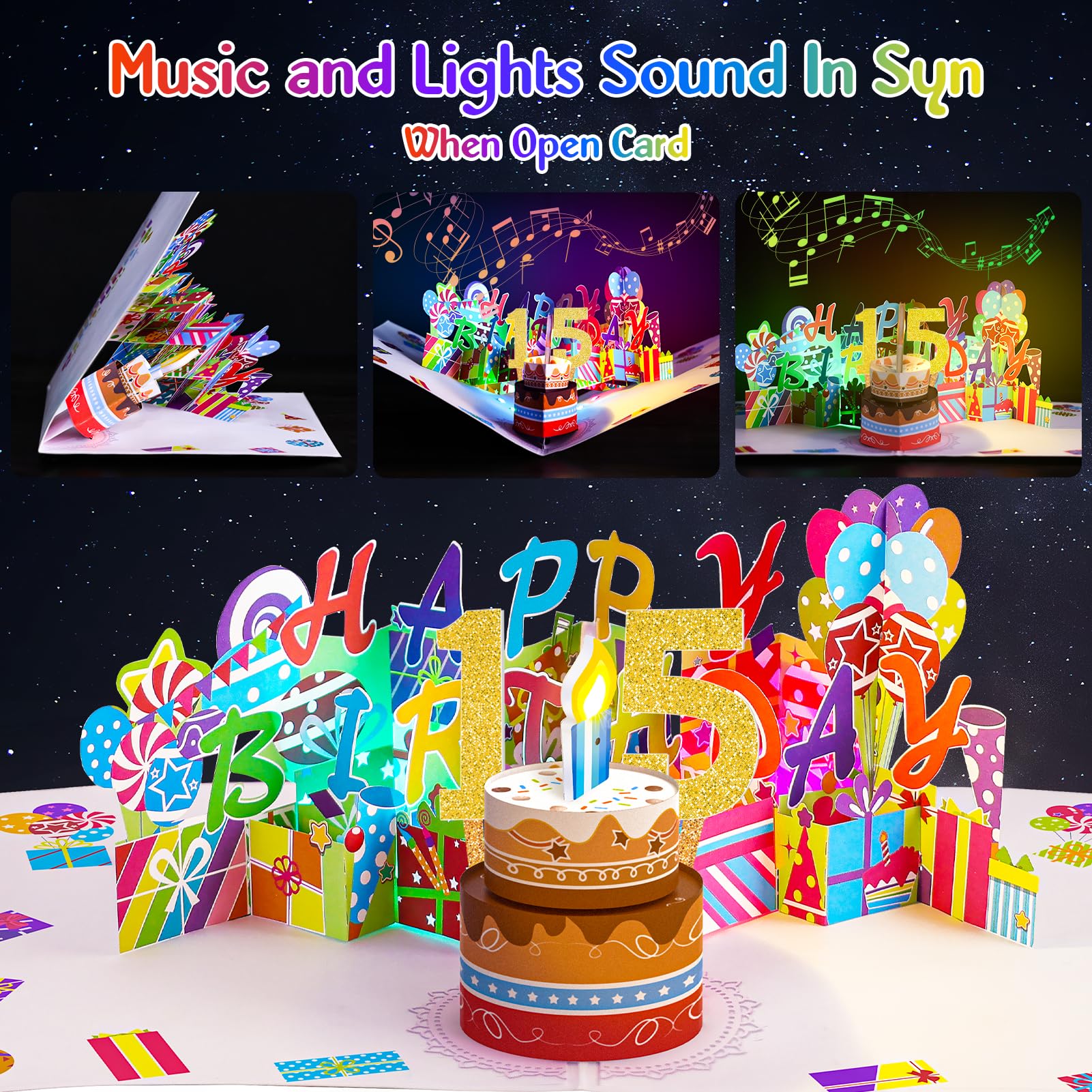 Truly Magical 15TH BirthdayGifts w/ Lights & Music: Present this 3D pop-up Happy Birthday card to that special girls or boys, celebrate her/his 15 years old birthday with a truly memorable birthday greeting with lights & music. They'll be all smiles when they open this cute card, greeted by classic birthday song, in sync with color-changing lights. More amazingly, our greeting card ends with a cheering sound after she/he blows the candle