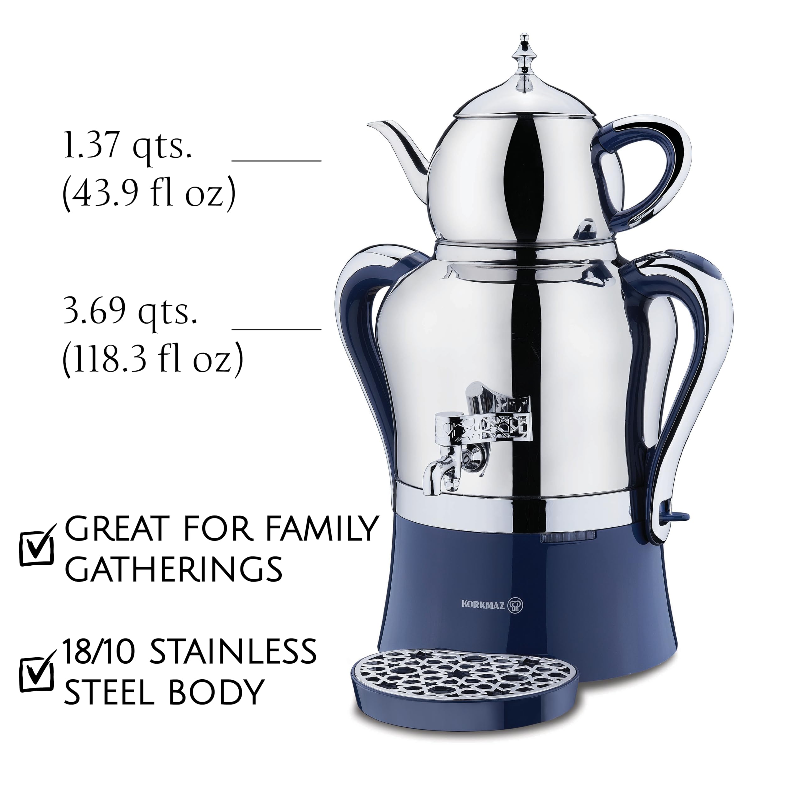 ✅ Samovar Style: With two pots, with capacities of 1.3L (43.9 ounces) for the upper pot and 3.5L (118.3 ounces) for the bottom pot, Korkmaz Hanedan Stainless Steel Samovar allows the serving of at least 50 classic Turkish tea glasses. A plate under the tap is included.
