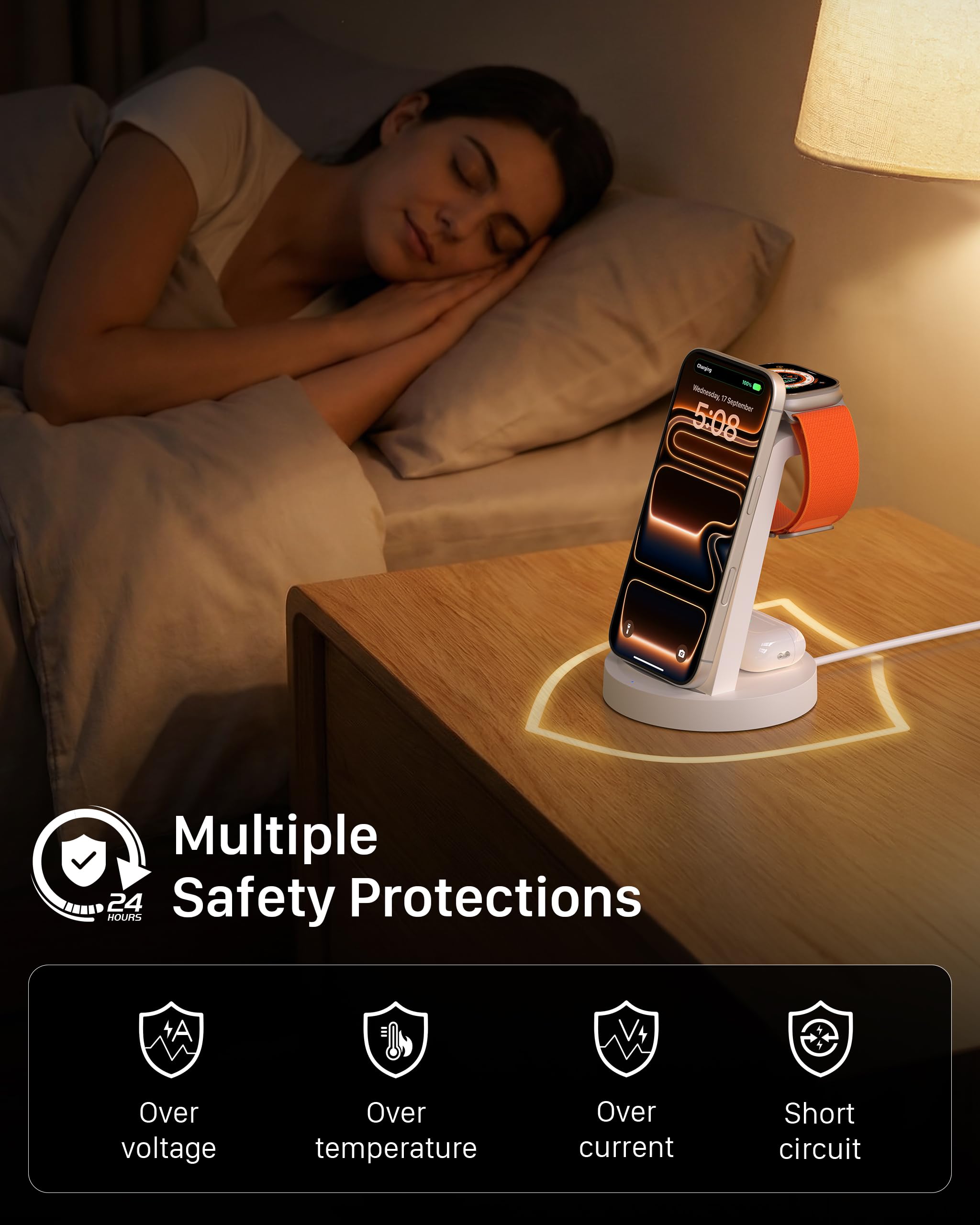 Wide Compatibility + What You Get:Works with iPhone 17/16e/16/15/14/13/12/11/XS/XR/X/8, Apple Watch Ultra 2/1 & Series 10/9/8/7/6/5/4/3/2/SE, and AirPods Pro/4/3/2 with a wireless (MagSafe) charging case. In the box: charging station, 18W adapter, 3.3ft USB-C cable, user manual, and support.