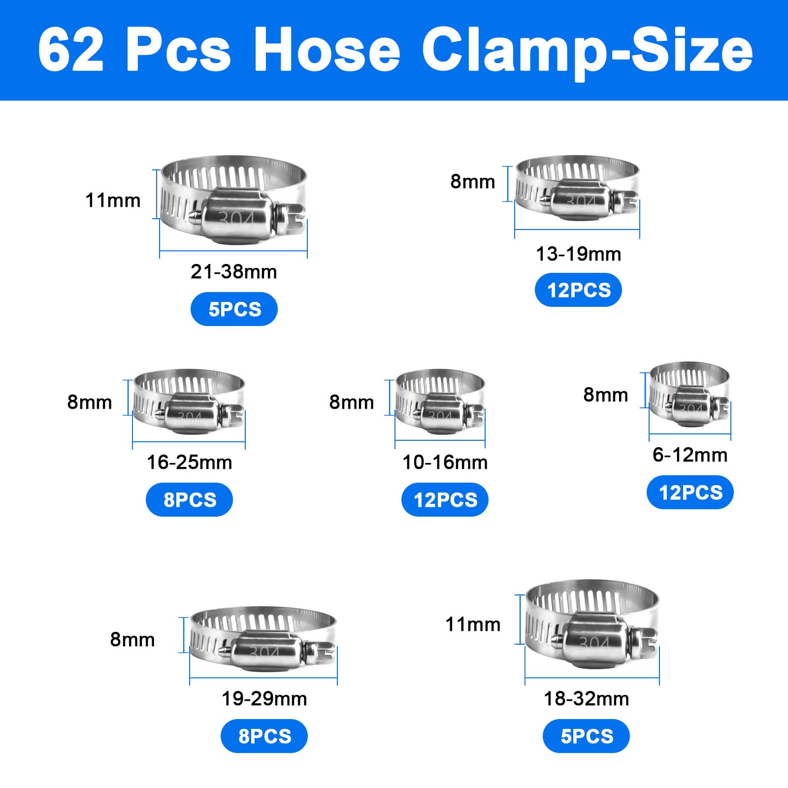 Perfect Hose Clips Set: The automotive hose clamps kit is flexible and ductile with a wide adjustable size range from 6 to 38mm. Contains 7 different sizes: 6-12mm, 10-16mm,13-19mm,16-25mm, 19-29mm,18-32mm,21-38mm,62 pcs in total, enough for your spare and replacement in daily life.