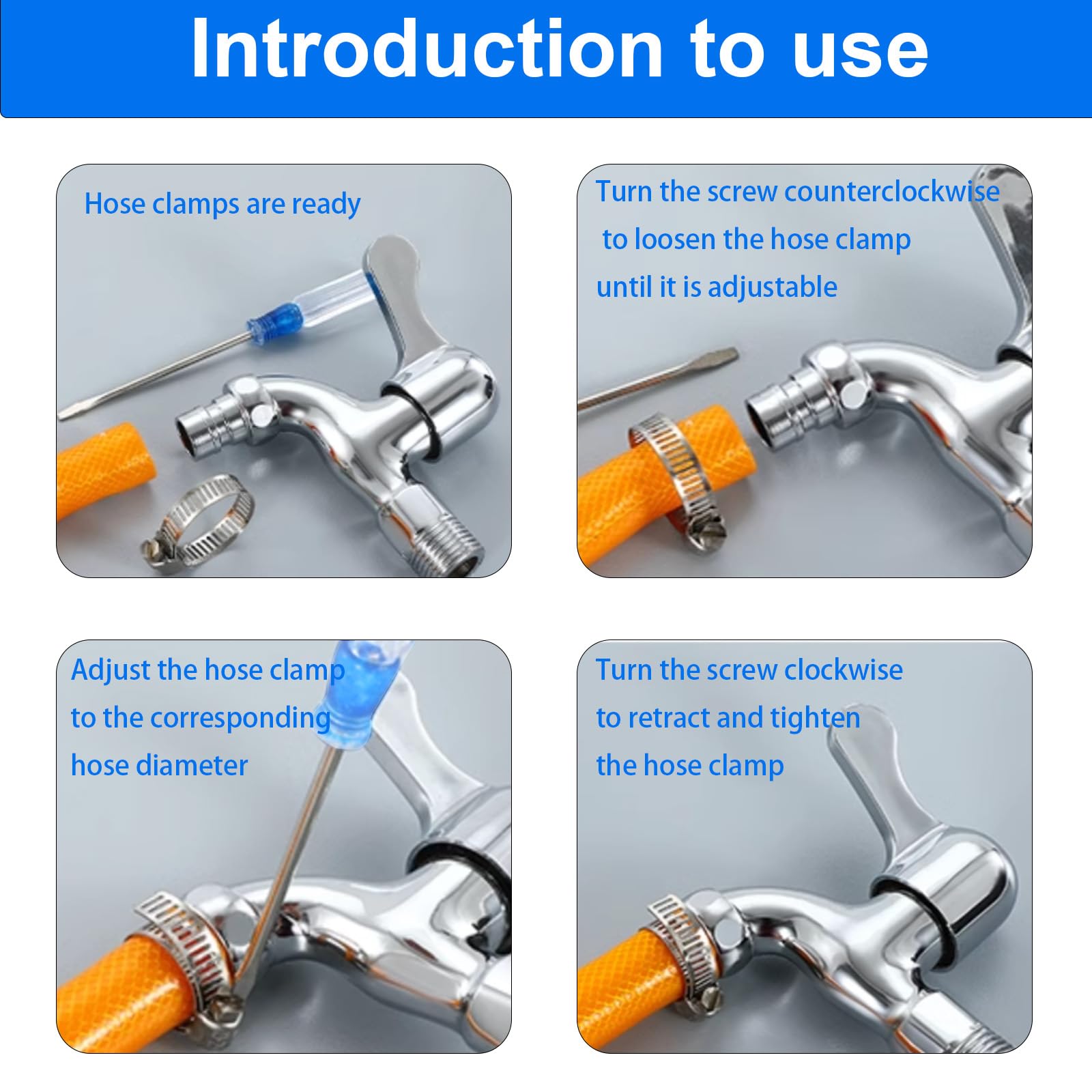 Easy to Use: The stainless steel pipe clamp adjustable hose clip kit is easy to use. Easy to loosen the screw of hose clamp by a screwdriver, then thread the pipe through the hose clamp and adjust the fit size, tighten the screw, also easy for beginners.