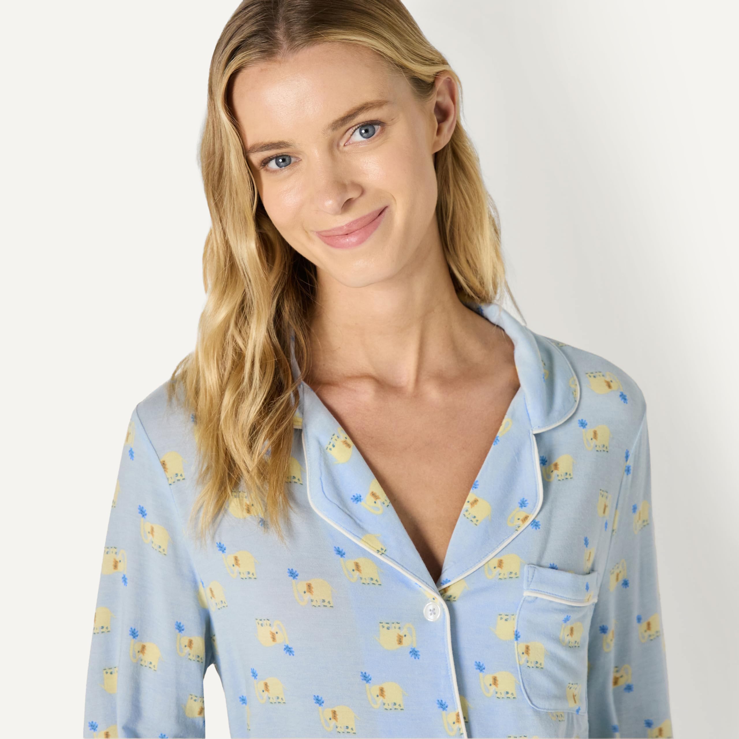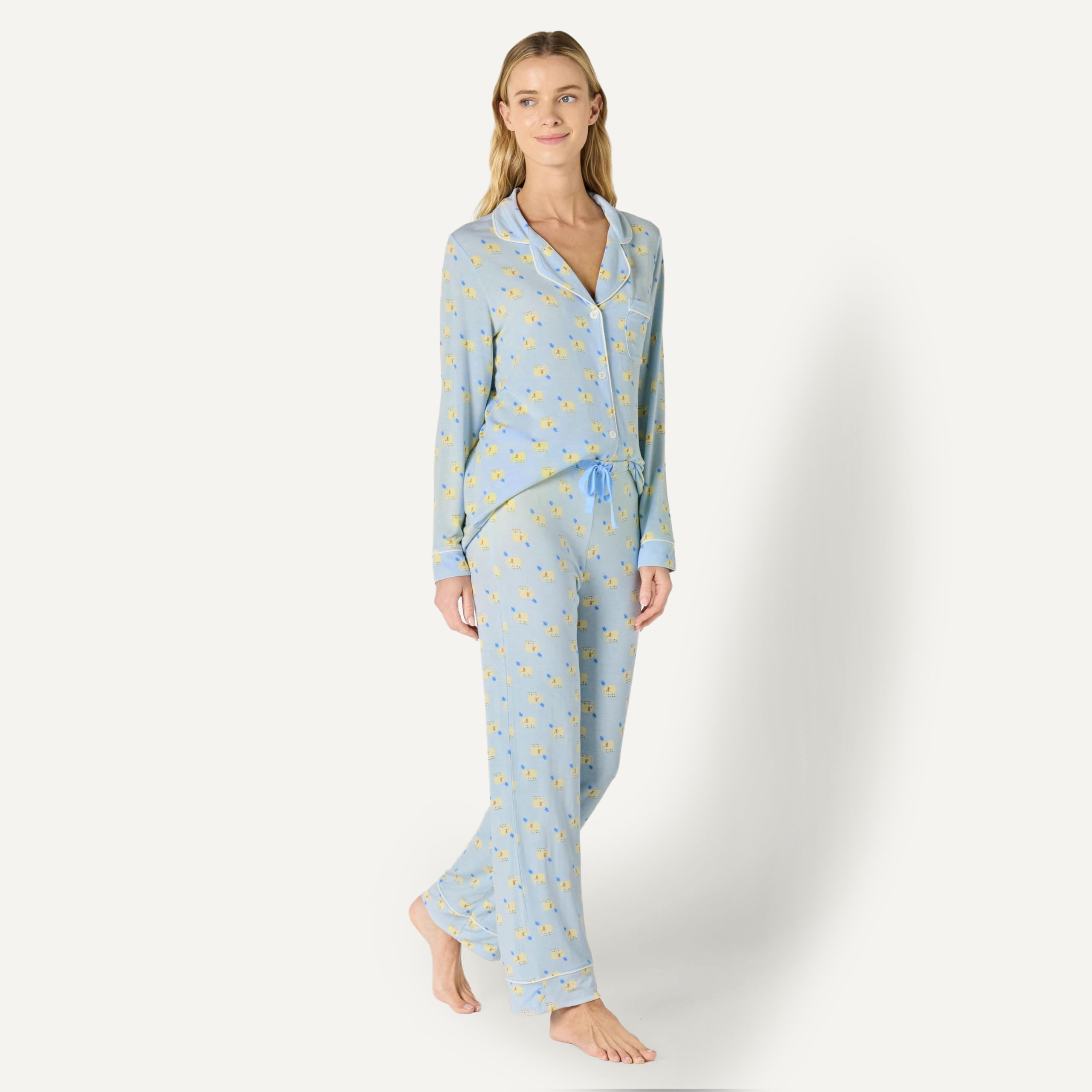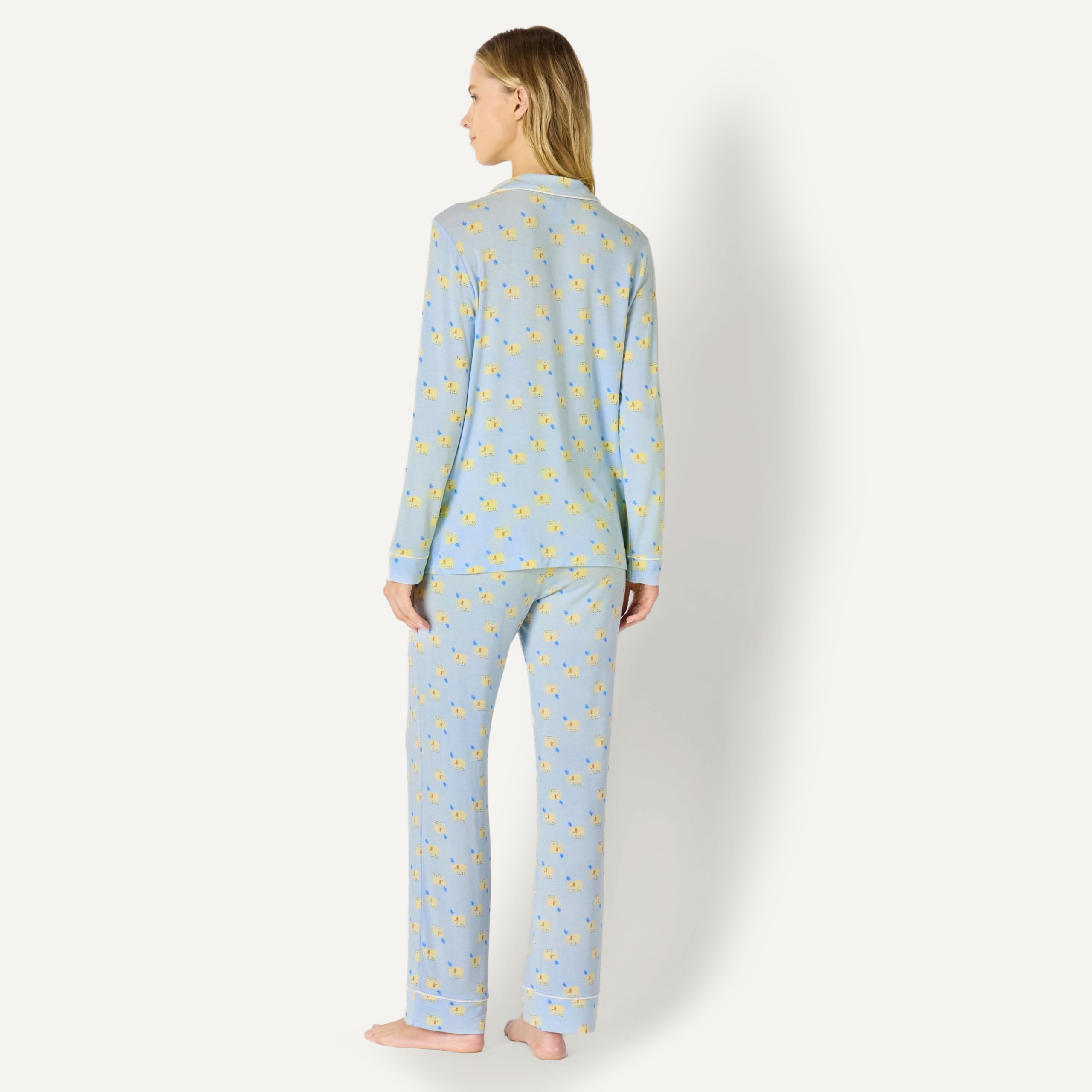 DETAILS: This set features a button-front long sleeve top with classic notch collar and single patch pocket. The pant is designed with an elasticated waistband. Modern framing with delicate contrast piping at sleeve and leg cuffs