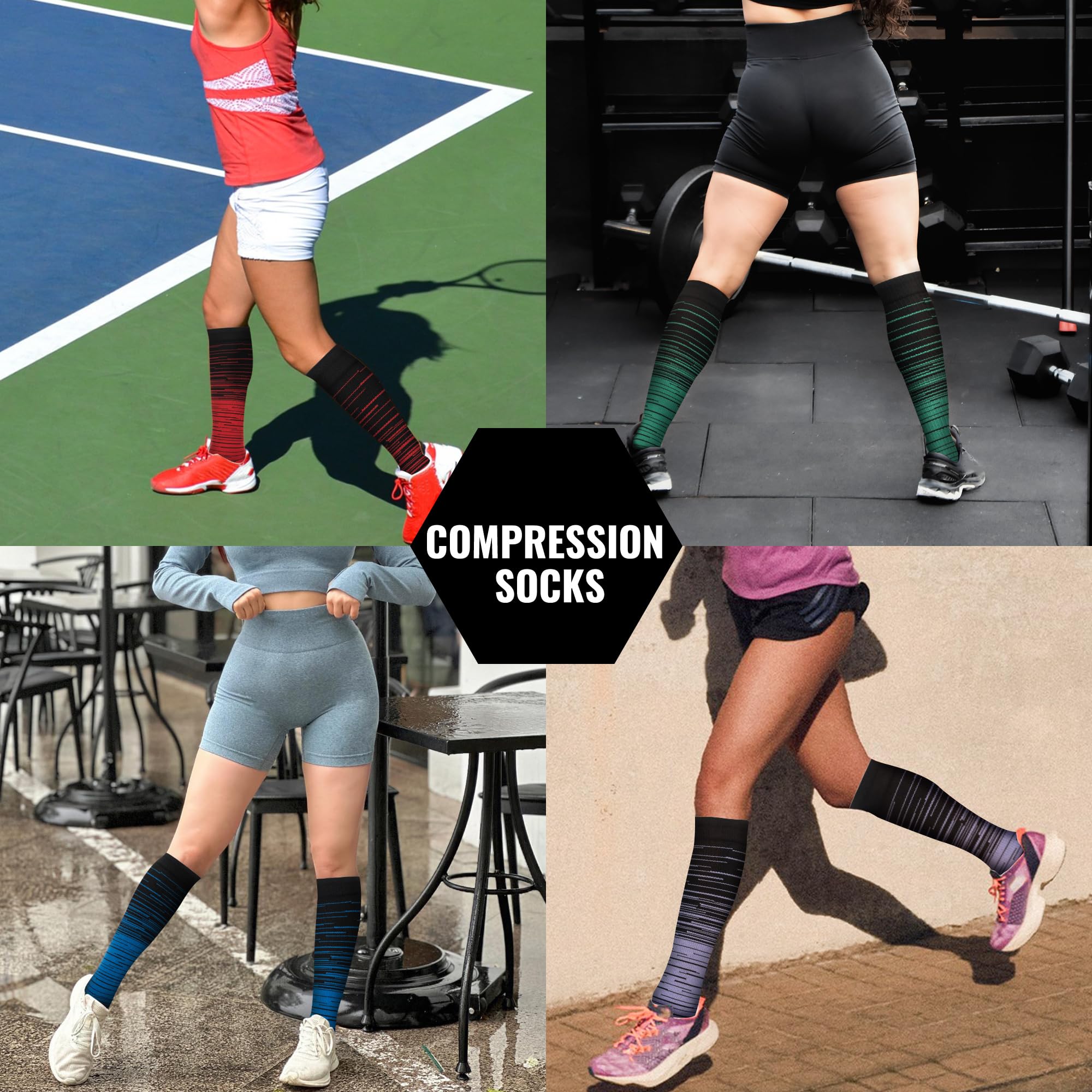 VERSATILE STYLE FOR ALL OCCASIONS: Our compression socks for men and women fit various lifestyles. Whether you're running, traveling, nursing, flying, pregnant, or need muscle support, these long compression socks men have you covered with high-quality performance. Suitable for all sports, cycling, skiing, mountain climbing, football, hiking, jogging, tennis, marathon, hockey, soccer, basketball, golf, etc. From daily wear to special occasions, experience lasting comfort.