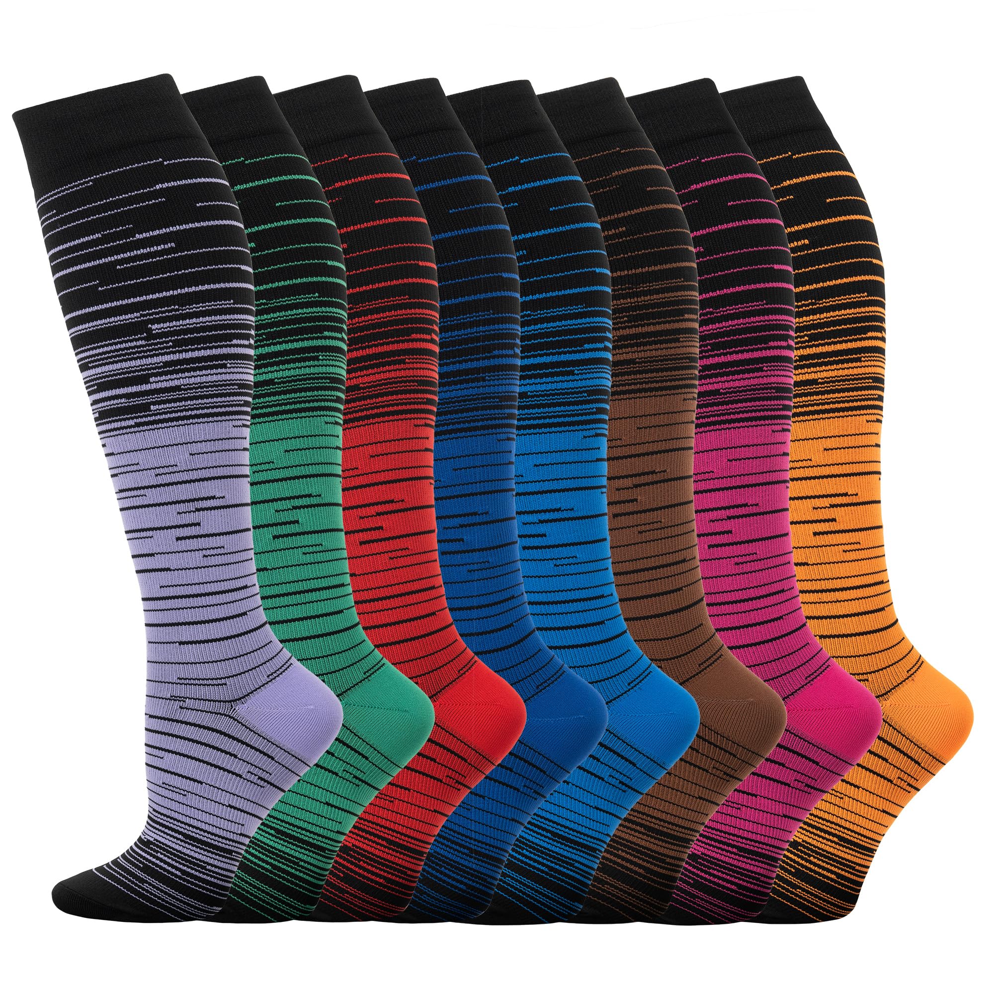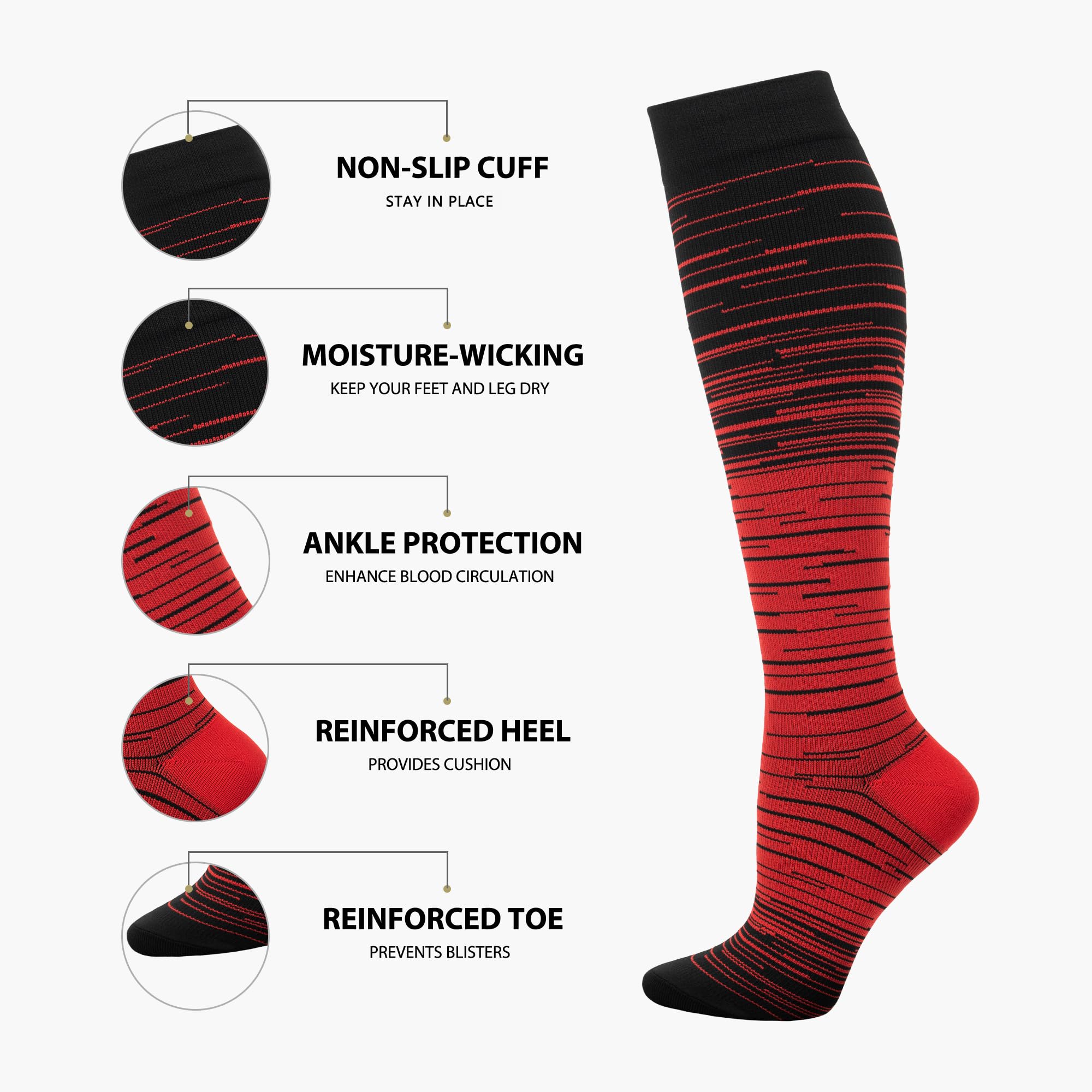 GRADUATED COMPRESSION: Our compression socks for women & men provide graduated medium compression. As the fabric moves up the leg, the compression level gradually decreases. This design works to apply specific levels of compression on certain points of your feet, ankles, and calves. You can benefit a lot from our knee high compression socks because increased circulation is always a good thing.