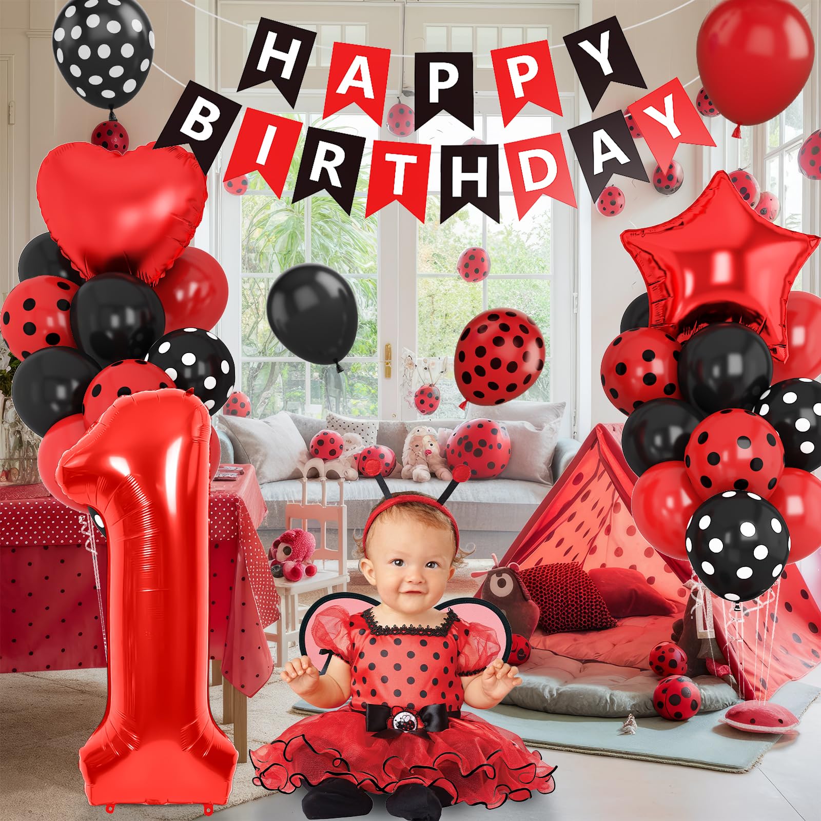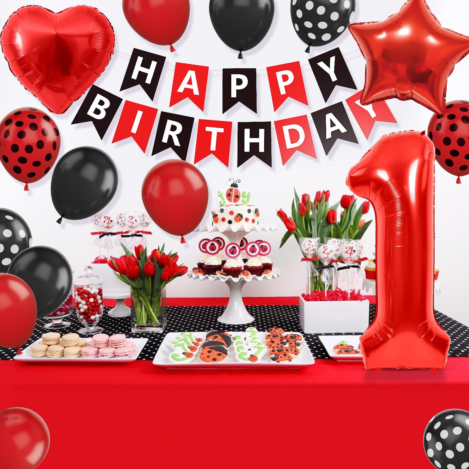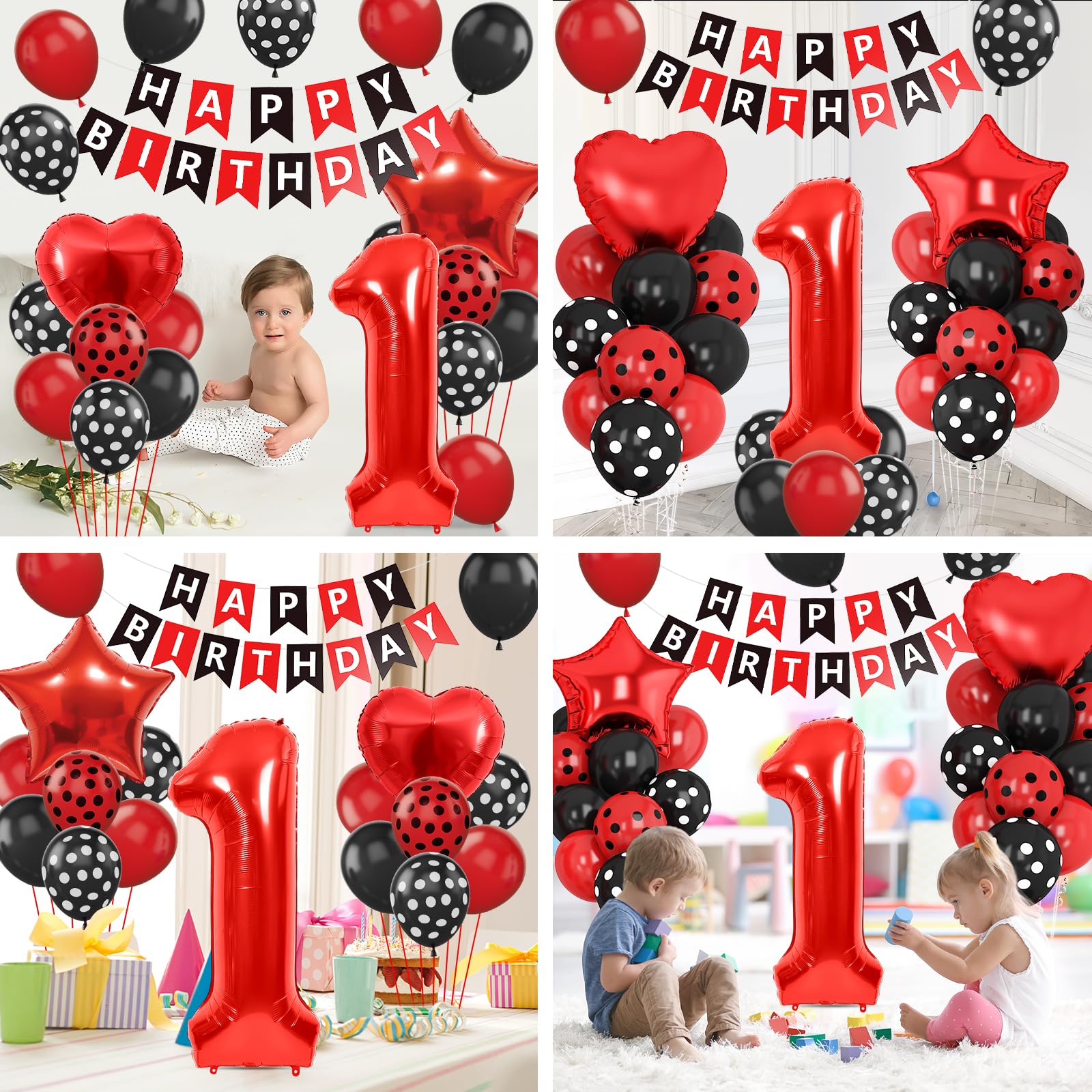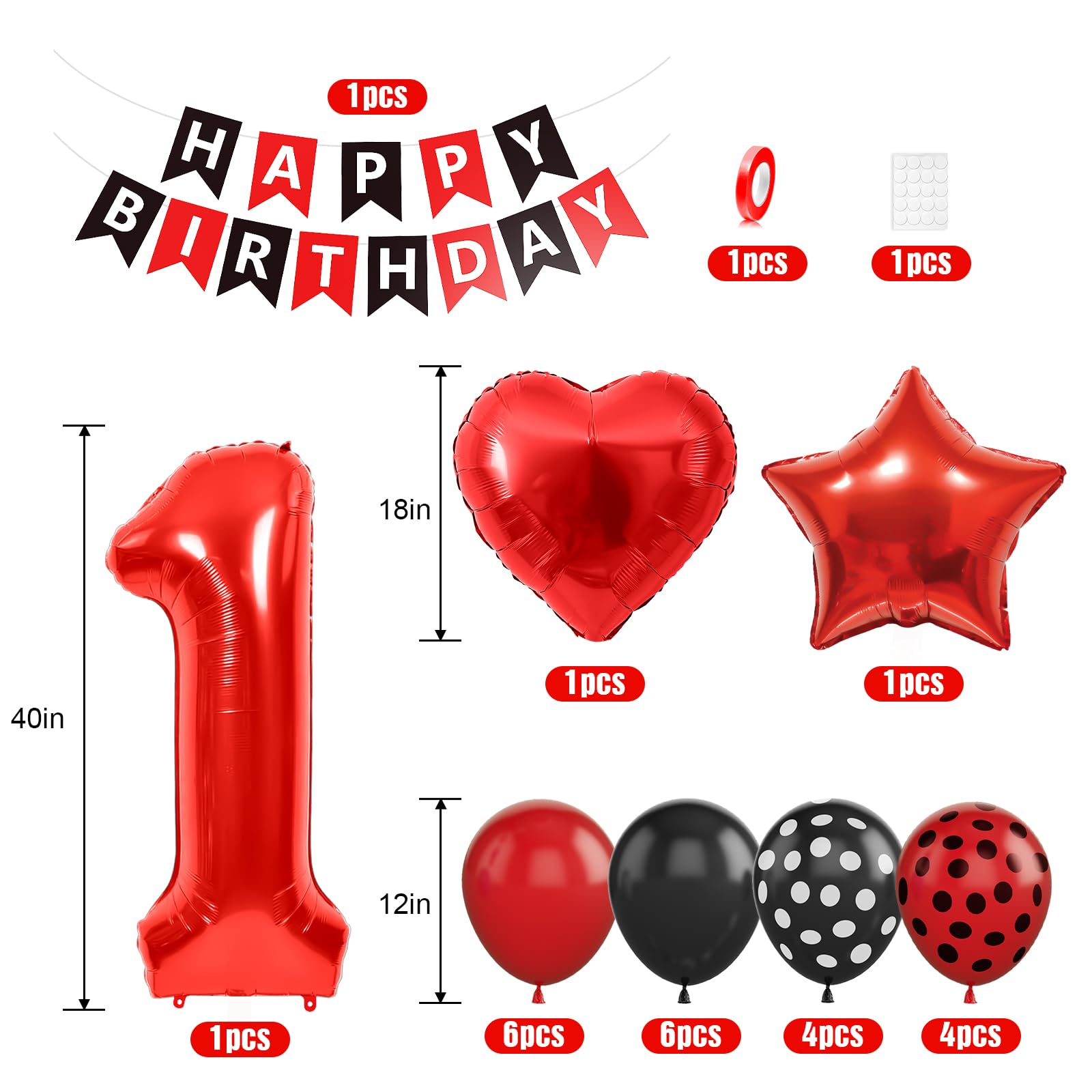 1st Birthday Decorations: You will get 1 x red black HAPPY BIRTHDAY banner, 1 x 40 inch number 1 foil balloon, 1 x 18 inch red star foil balloons, 1 x 18 inch red heart foil balloons, 20 x 12 inch balloons (black polka white dots x 4, red polka black dots x 4, black x 6, red x 6), 1 x red ribbon, black red balloons can match your wonderful party theme. The color combination meets all your party imagination.
