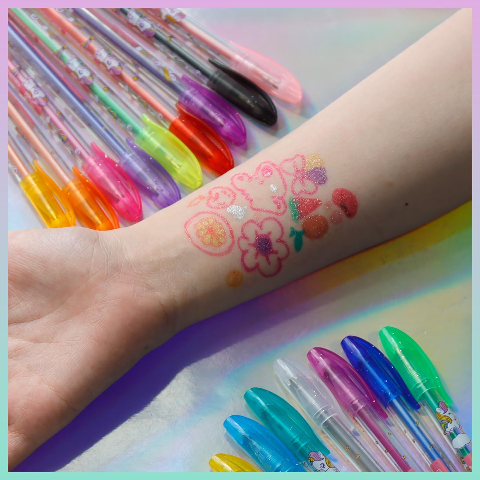 Unicorn-Themed Vibrant Colors: Our 16-pack of glitter gel pens not only offers an array of dazzling colors but does so with adorable unicorn-themed designs on each pen. Perfect for adding a sparkling touch to your everyday look. It can create fun and creative temporary body art, but can also be used to enhance artwork, journals, DIY projects, and more. These pens bring your creative ideas to life.