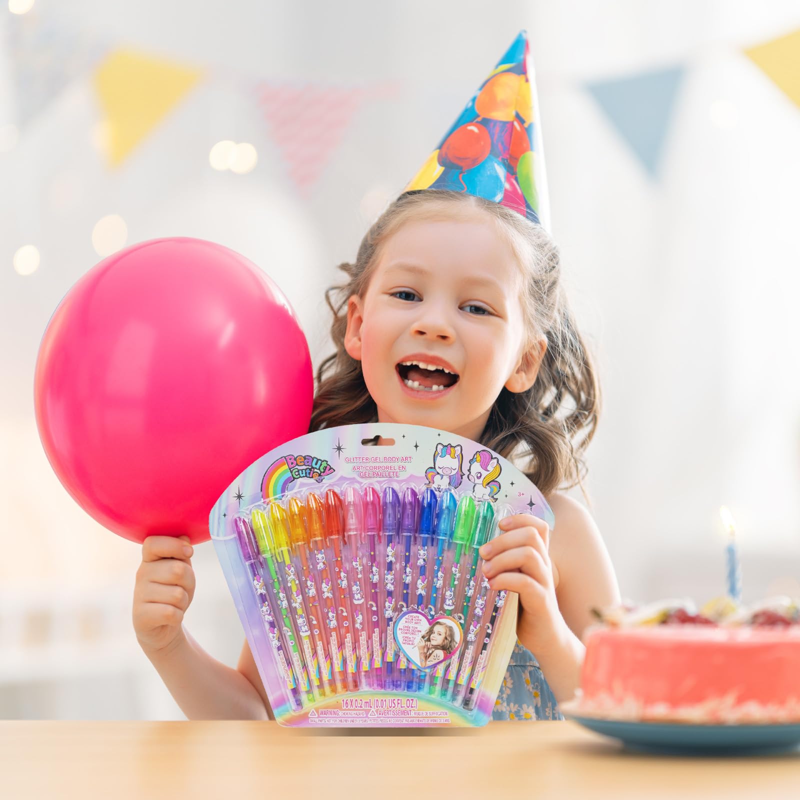 KIT INCLUDES: 16 glitter body gel pens. Colors include various shades of pink, green, blue, red, black, gold, silver, and more. All the colors your little one needs to create a work of art!