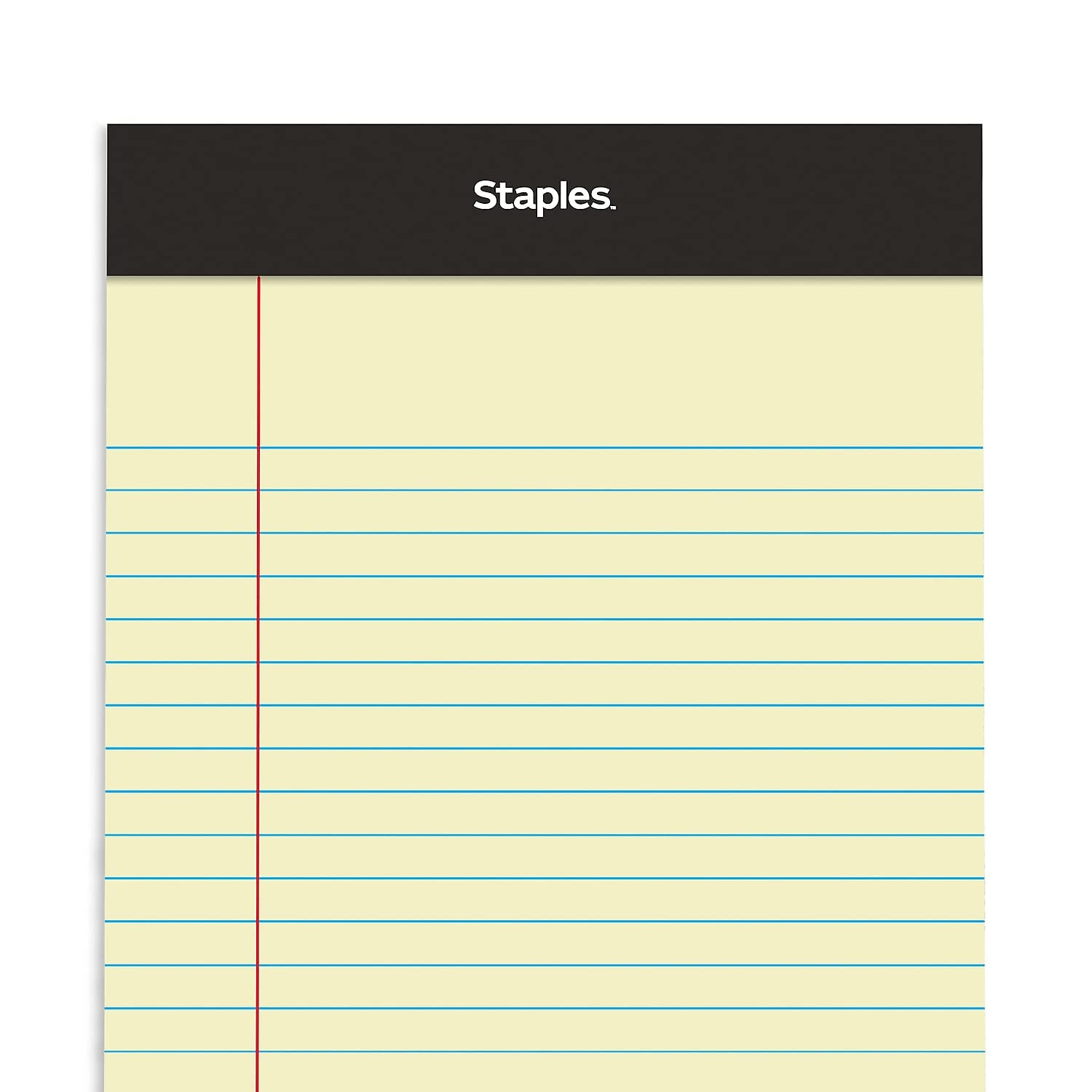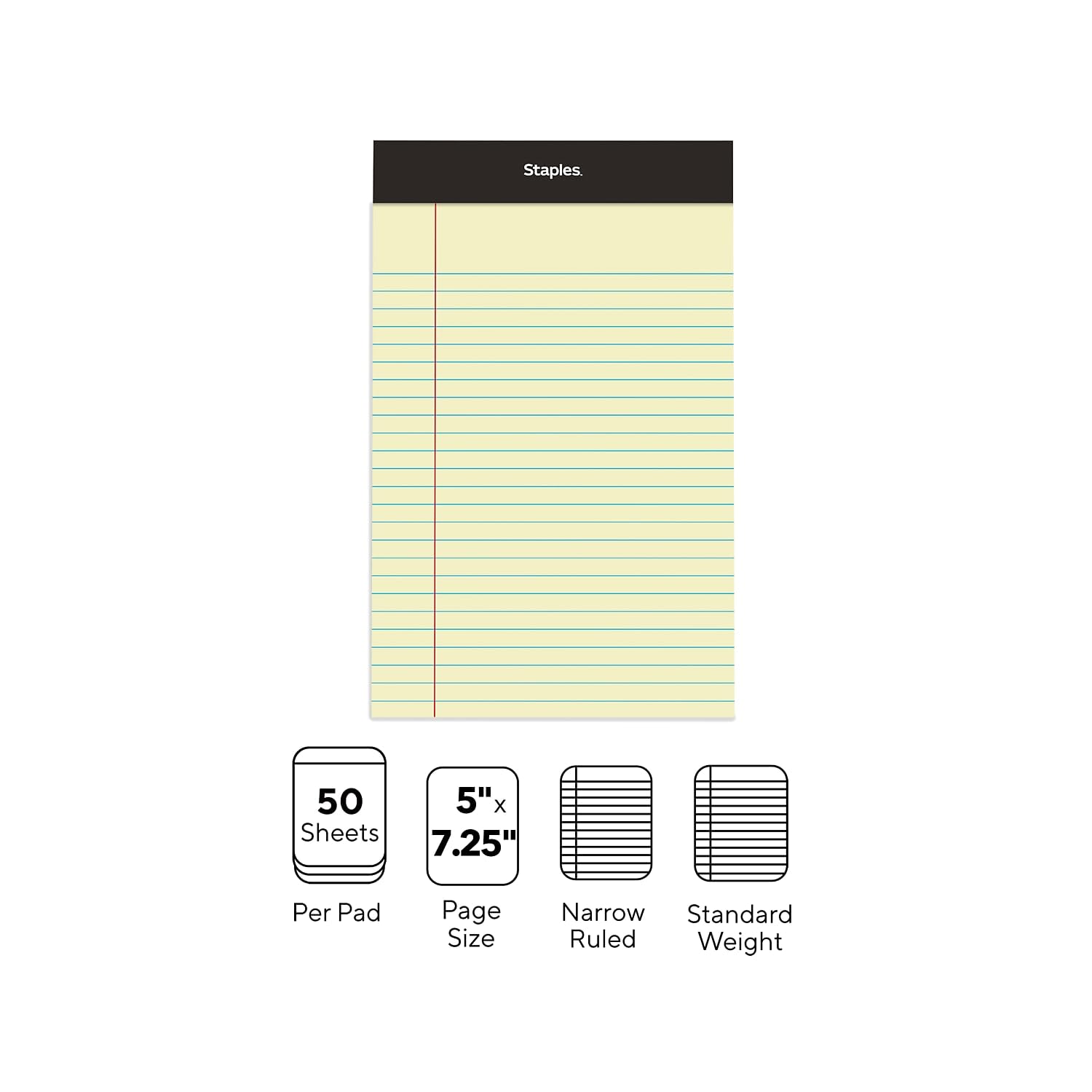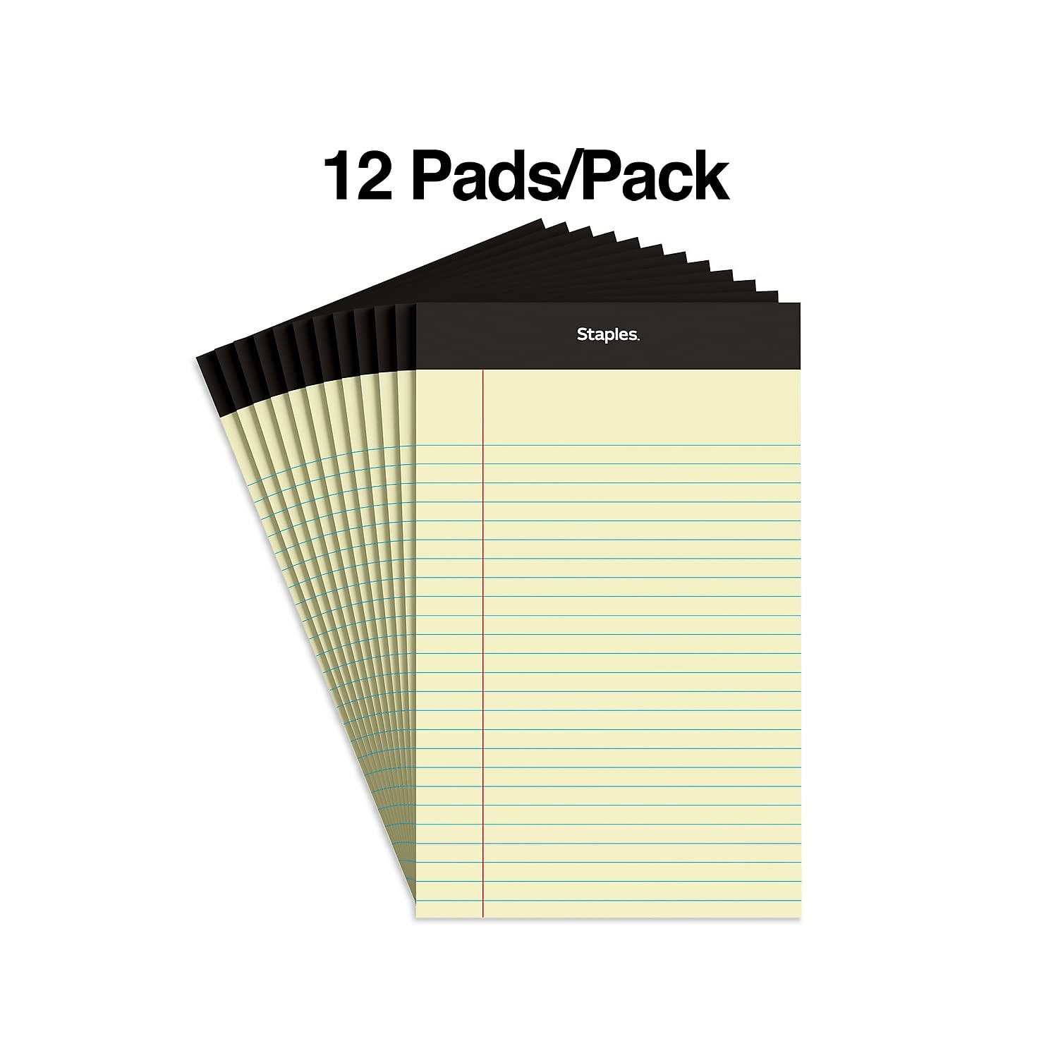 STAPLES NOTEPAD: Smaller sized canary yellow paper notepads fit easily into your bag, desk drawer, or briefcase for portability and our bulk 12-pack helps to keep your department or office setting stocked with writing supplies (Sold as 1 Each/Pack, 50 sheets per pad)