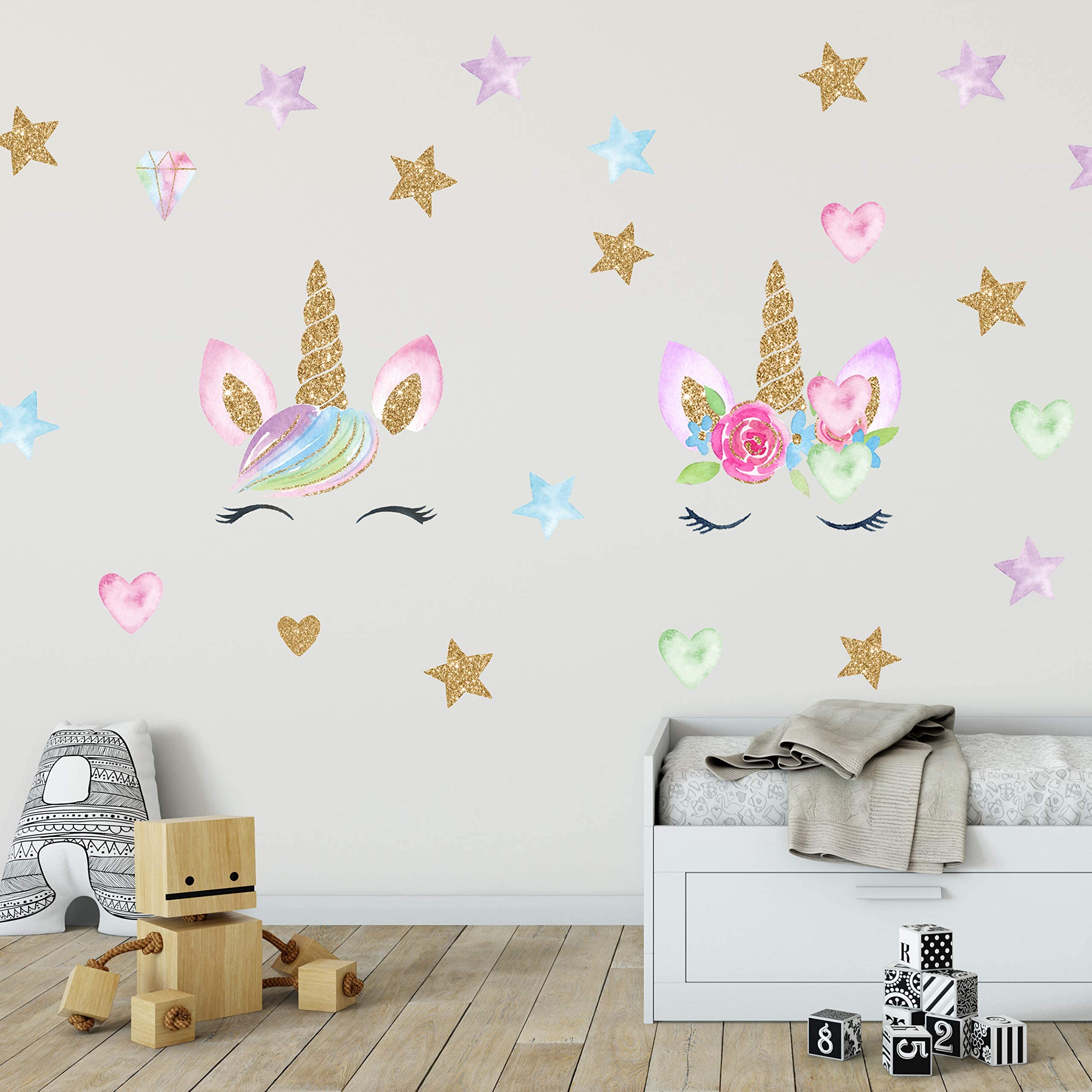 š¦ćBEAUTIFUL UNICORN DESIGNć-- Our Unicorn wall stickers decors for girls room contain a variety of elements suitable for home decoration.Watercolor style Designed Printed with cute colorful Heart and star Diamond, Larger Size beautiful unicron heads with flower.Decorate your girl's magic dream unicorn space!
