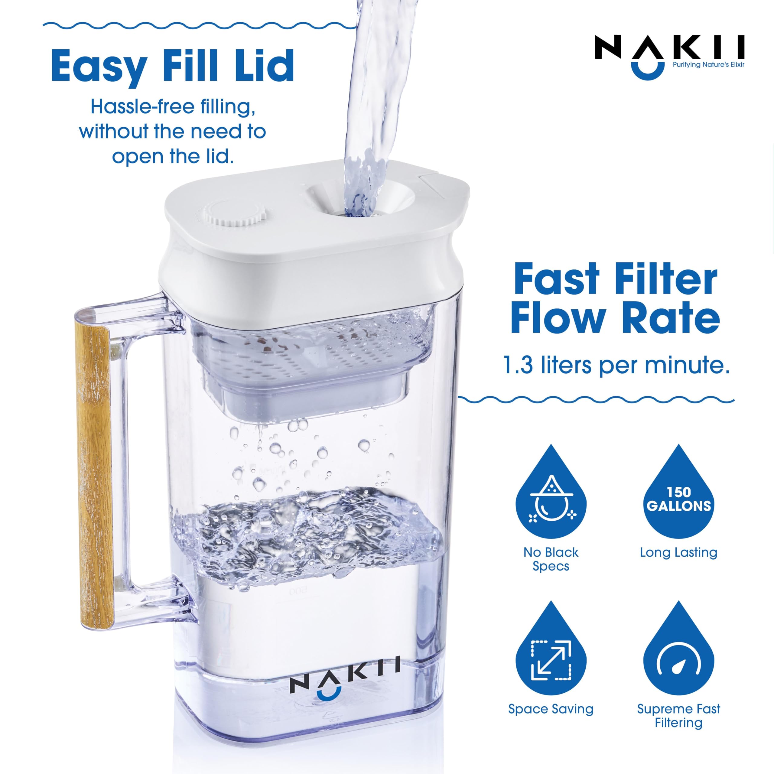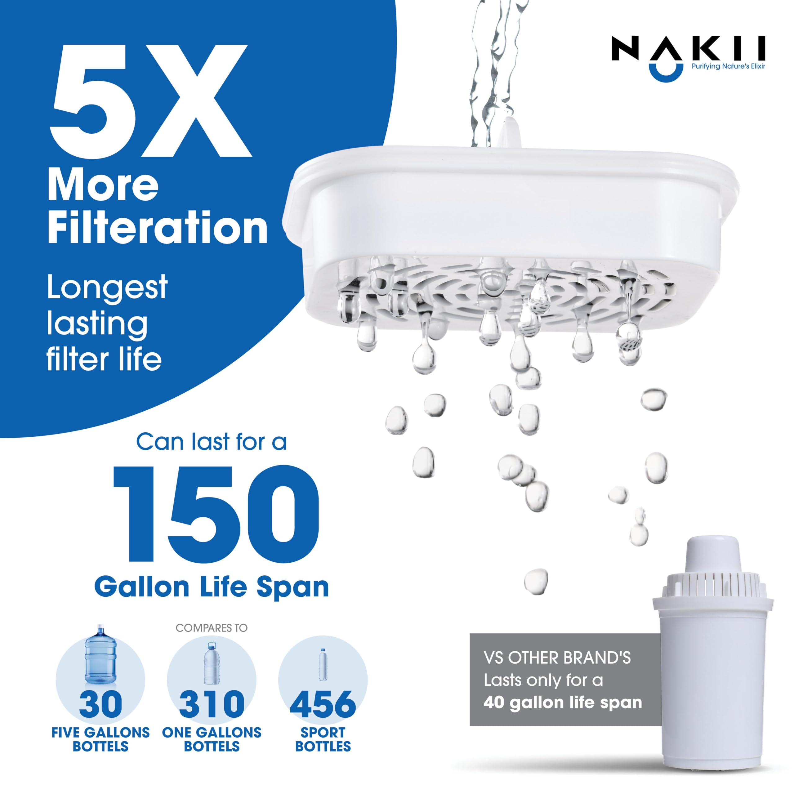 LONGEST LASTING – 150 GALLONS – 4 TIMES MORE THAN OTHERS! The NAKII pitcher filter is created with high quality material that handle water contaminants on a higher level hardly comparable that's why it has a lifespan of 150 gallons 4 times more than brita and any other brand in the market