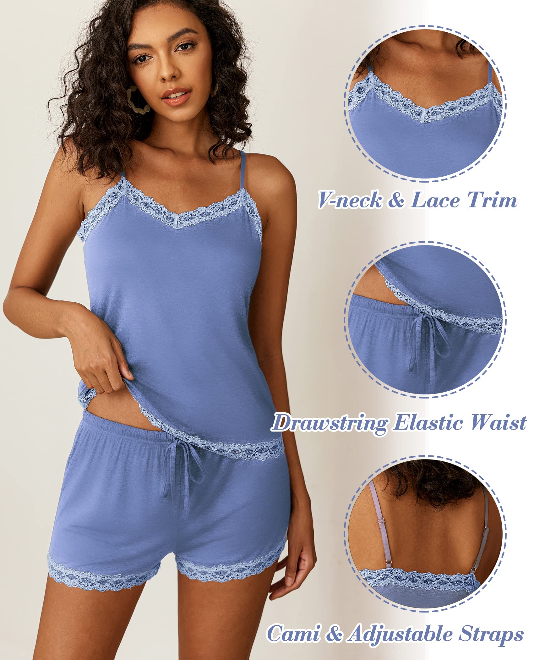 Cami pajama set women shorts featuring a plunging v neck, decent lace trim and adjustable shoulder straps, simple and stylish, shows off your body curves in nice coverage way