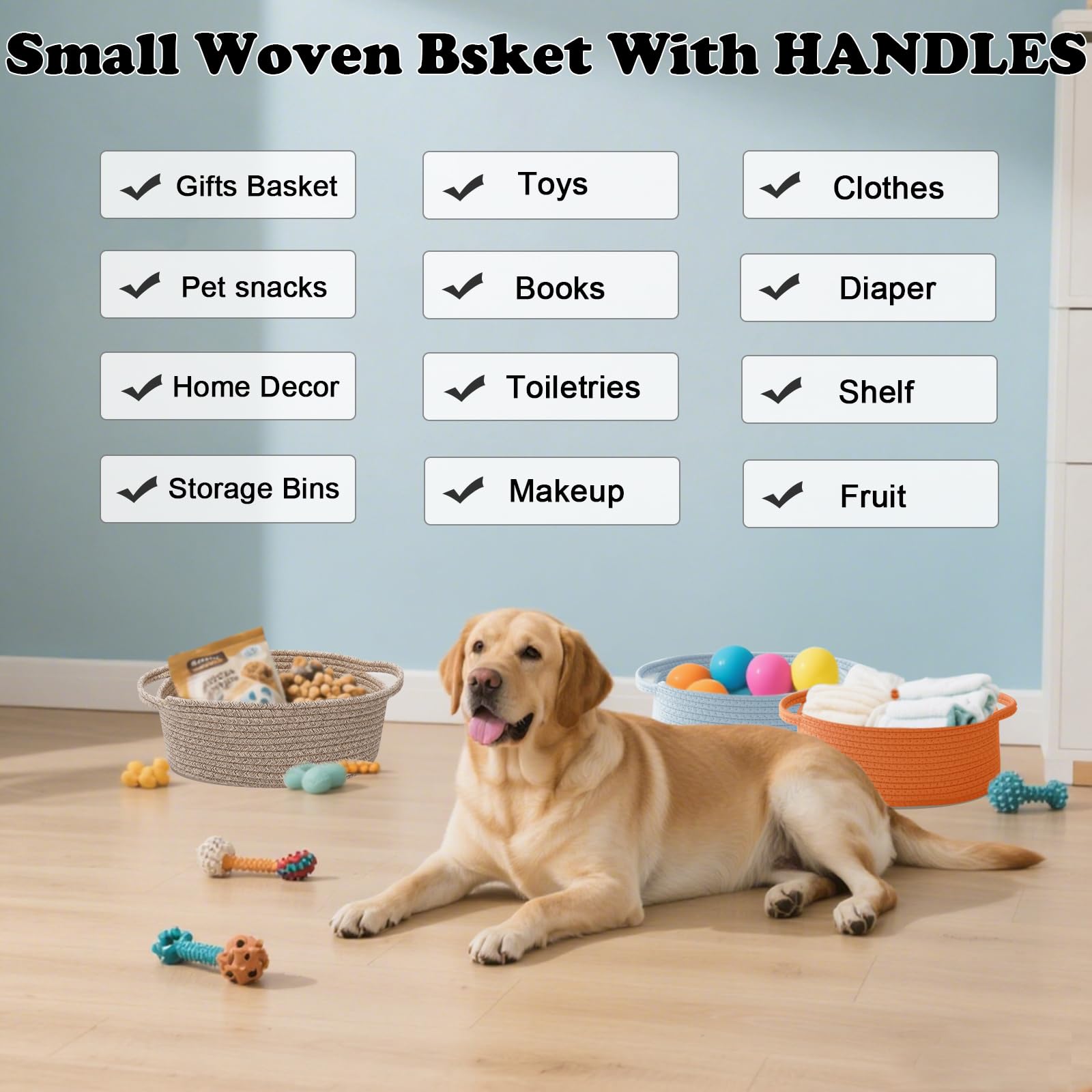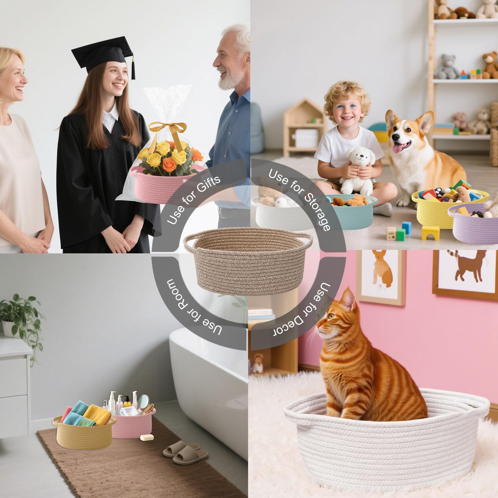 【Multi-Purpose Storage】Woven baskets for storage,bathroom organization, shelf styling,storage basket for organizing snacks, dog cat, magazine, shoes, remotes, books, towels, toiletries, keys and more.Widely used in living room,bedrooms,bathrooms,kids room,and Kitchen