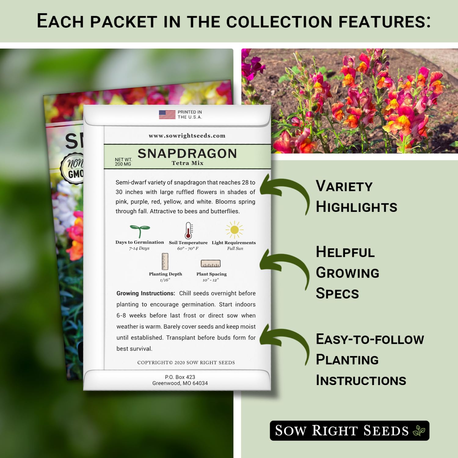 Beautiful - Large premium packets of Tetra Mix, Large Mixed, and White Snapdragon (Antirrhinum majus) seeds. Make a bold statement with minimal effort by planting these colorful and whimsical flowers in your garden. Perfect for a cottage garden look, these flowers come in a range of sizes and colors that create a serene environment while attracting pollinators.