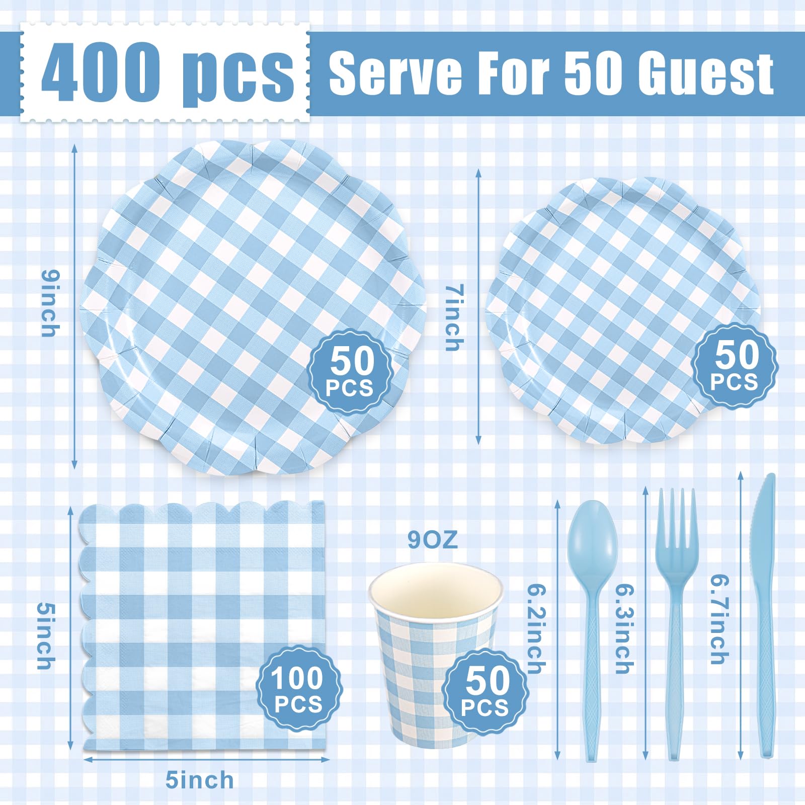 Sufficient Quantity: the gingham party supplies include 50 plaid paper plates (9 inches), 50 dessert paper plates (7 inches), 50 knives, 50 forks, 50 spoons, 50 paper cups (9 oz), 100 gingham napkins (13 x 13 inches), a total of 400 pieces, which is enough to meet your party or daily needs, allowing you to serve 50 guests at a time