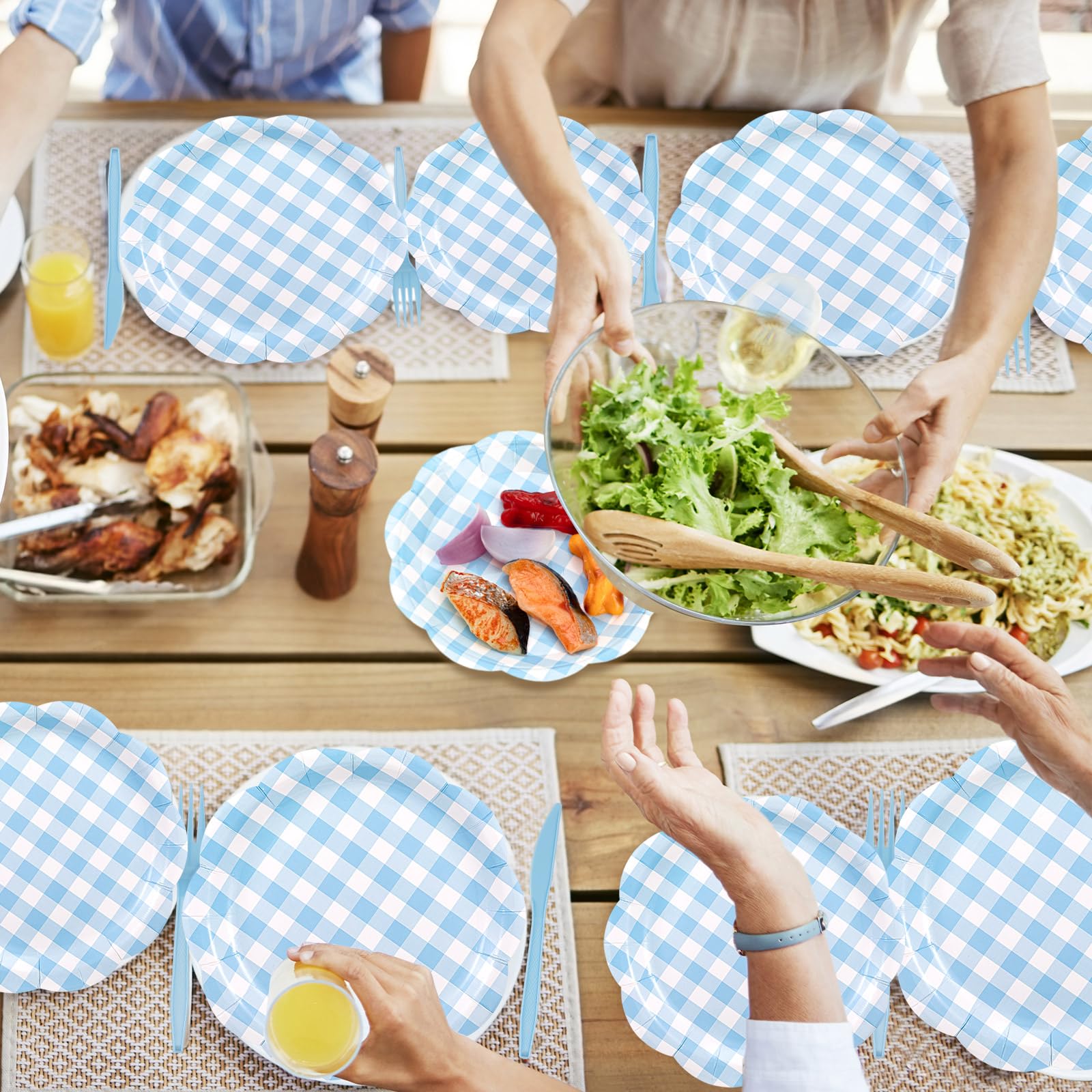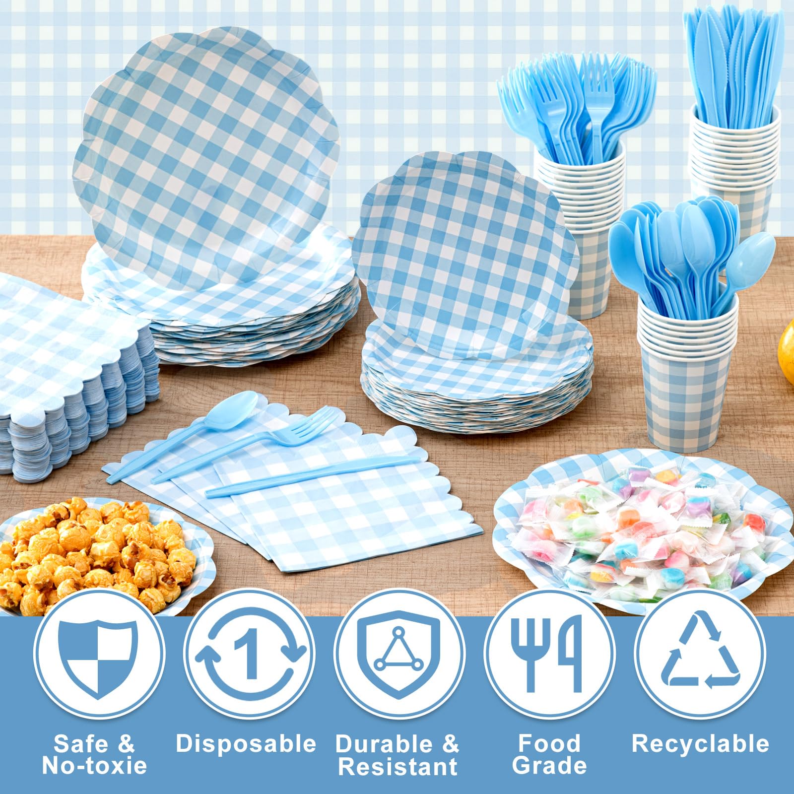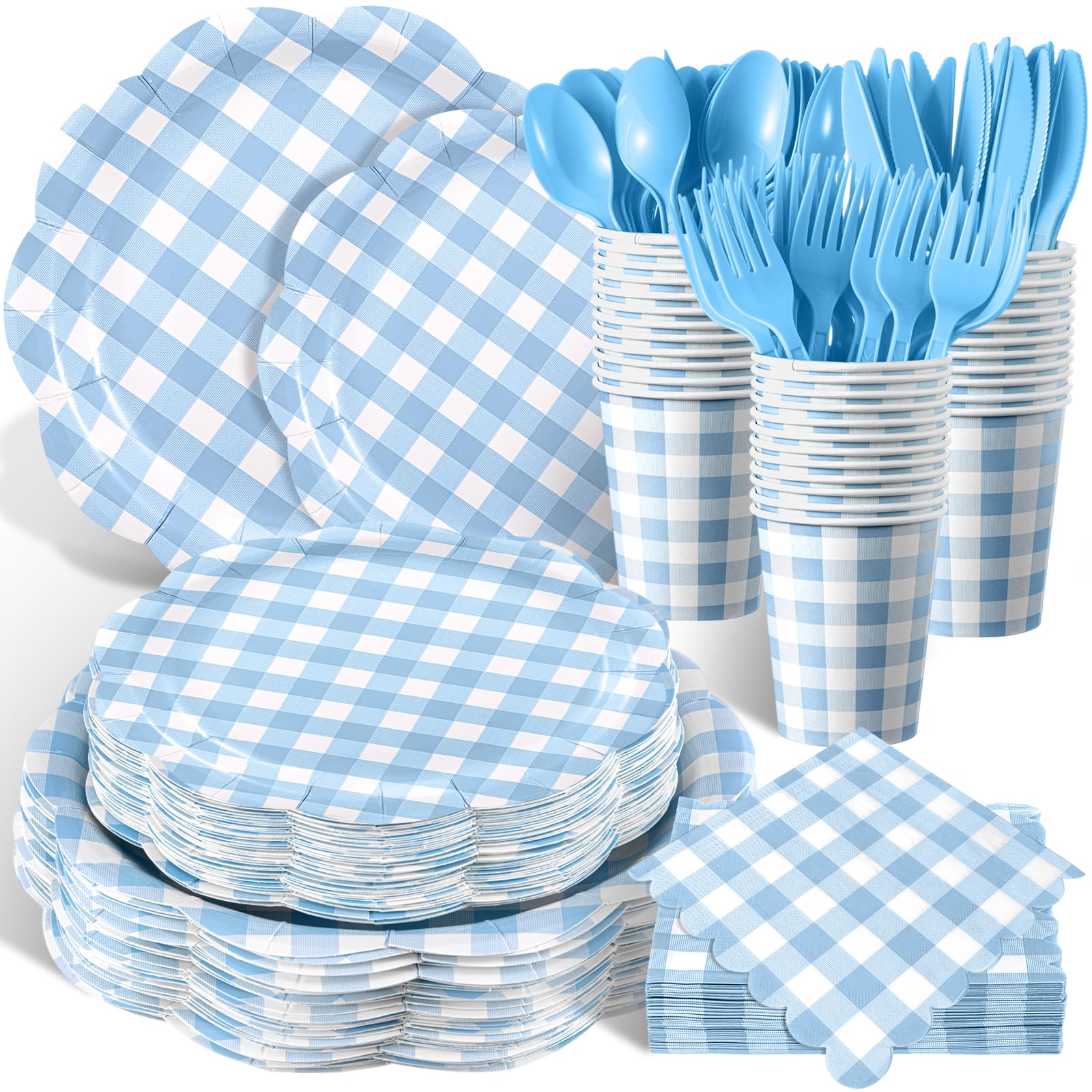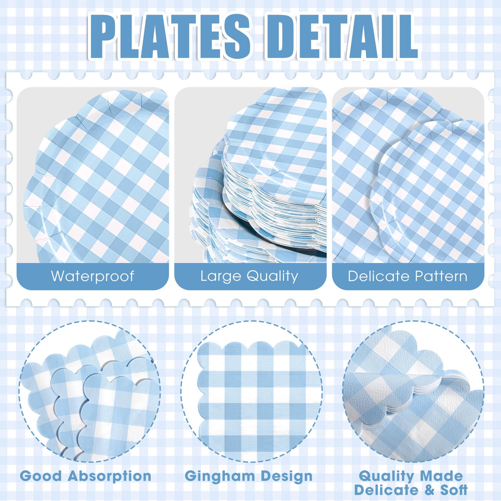Plaid Design: the party plates and napkins are all in a gingham design with scalloped edge, and the cups are also in a gingham design, which is very suitable for various holiday parties, baby showers, weddings, picnics, etc. The colors are fresh and bring charm to your activities
