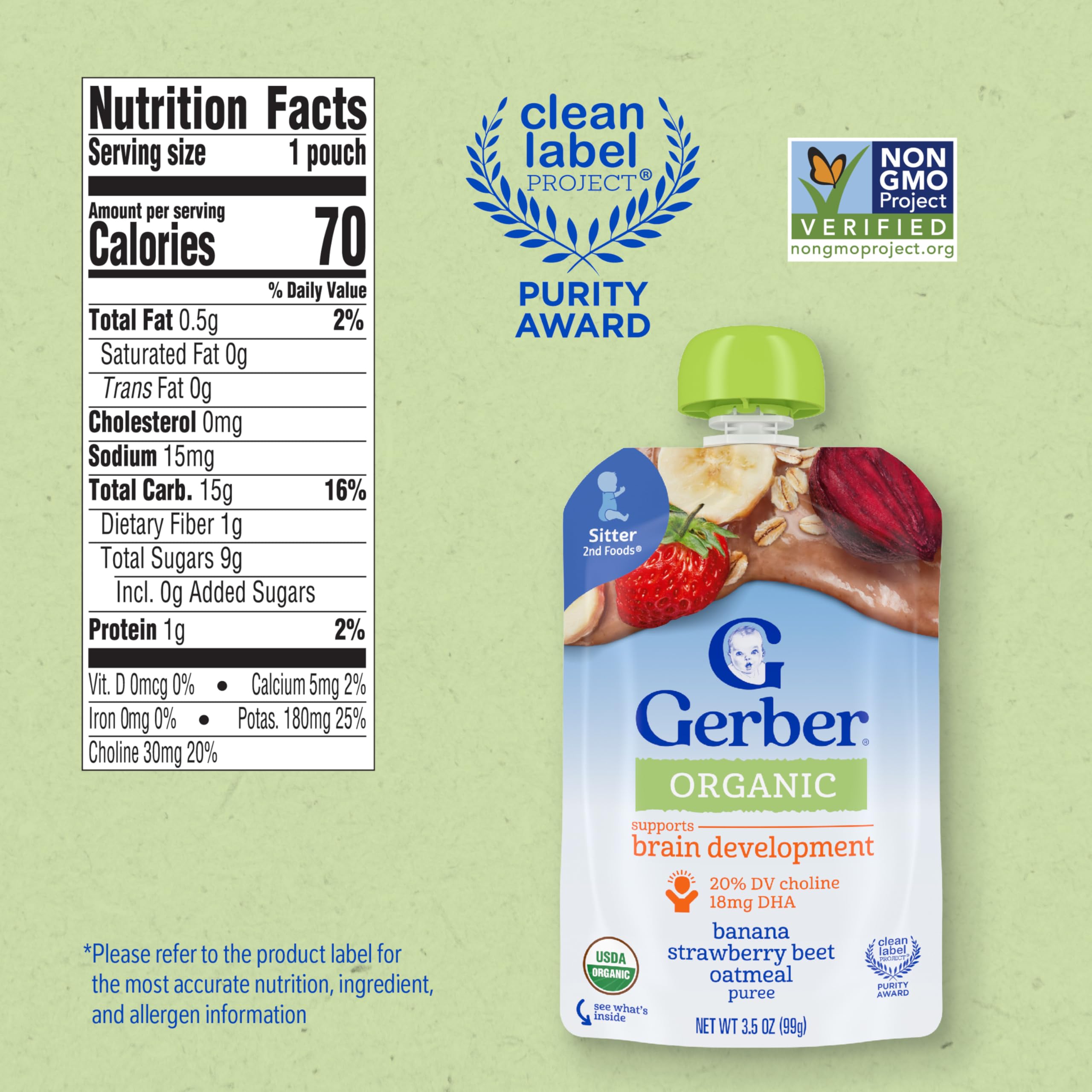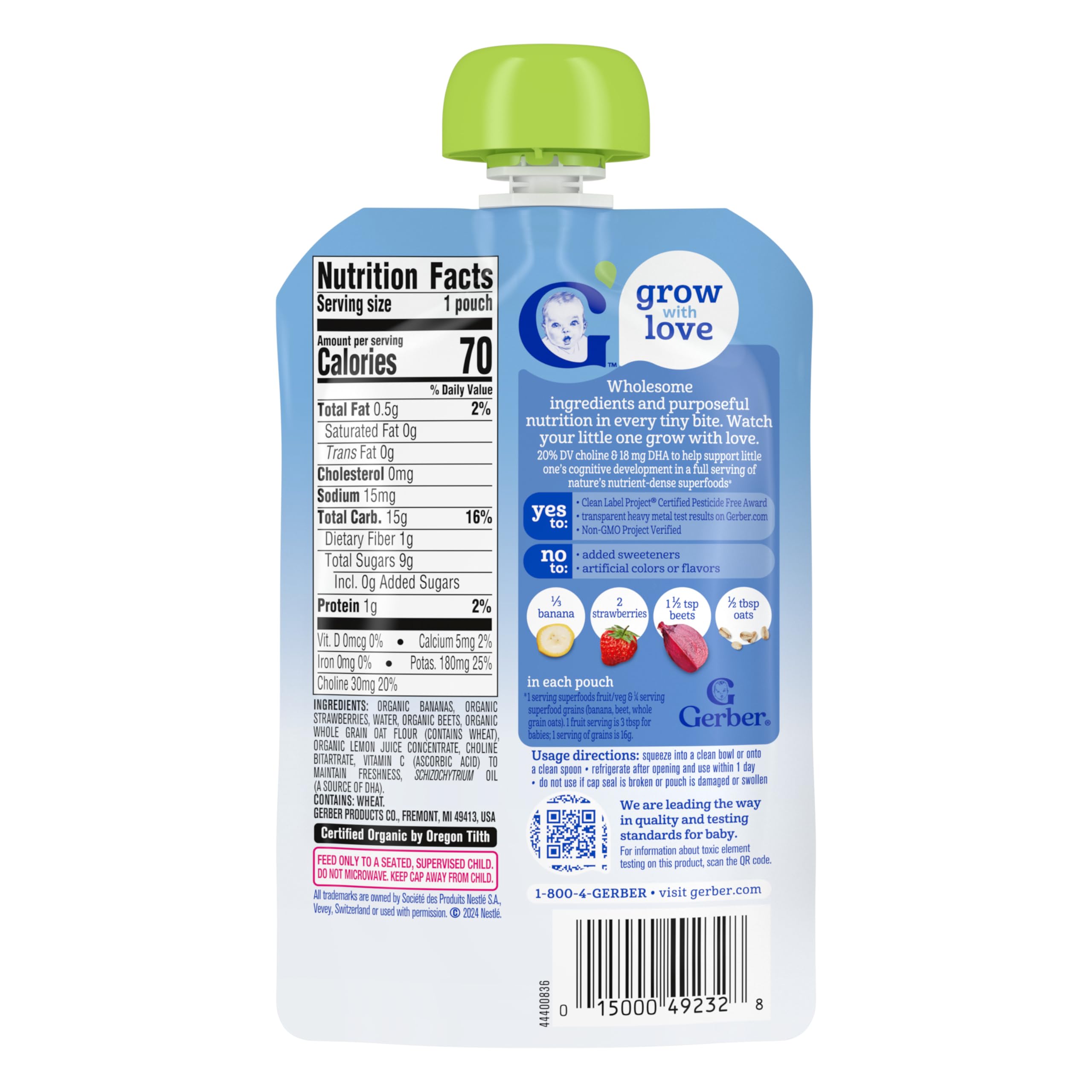 Gerber Organic Banana Strawberry Beet Oatmeal Baby Pouches are designed for busy parents seeking a nutritious and convenient solution. Gerber Pouches are crafted with wholesome ingredients, and strict quality standards, making them a premium choice for your little one. These baby food pouches are made for stage 2 sitters and have Choline and Dha. Gerber understands the importance of providing wholesome ingredients and purposeful nutrition as your baby grows and develops, thatβs why our baby pouches are an ideal choice for parents who seek quality in their baby's diet. Our baby pouches are a trusted choice for countless families.