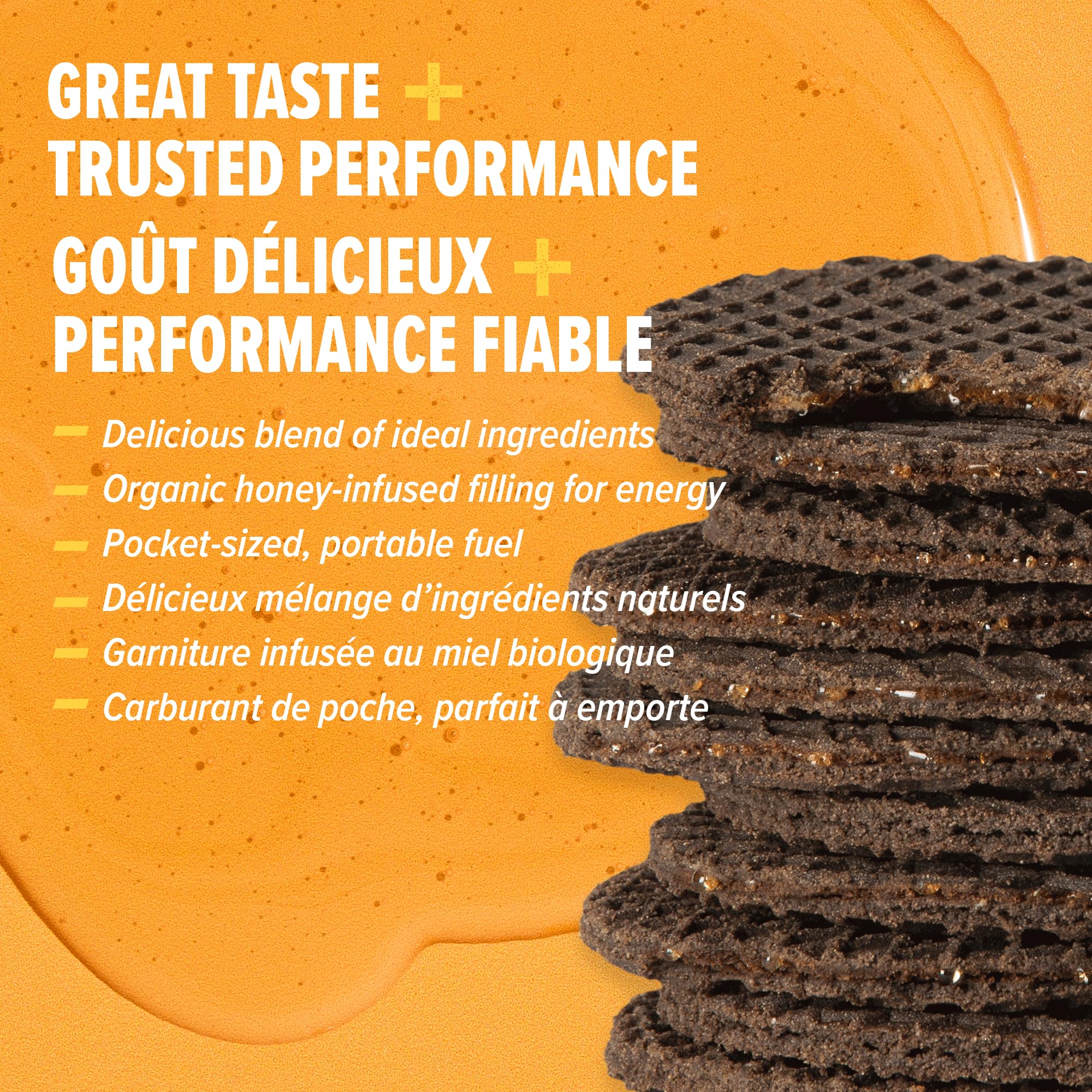 RACE-READY The waffle designed for performance. Both portable and easy to digest, it’s the perfect snack to throw in your gym bag or take with you while running and biking, or to scale up your home gym workouts