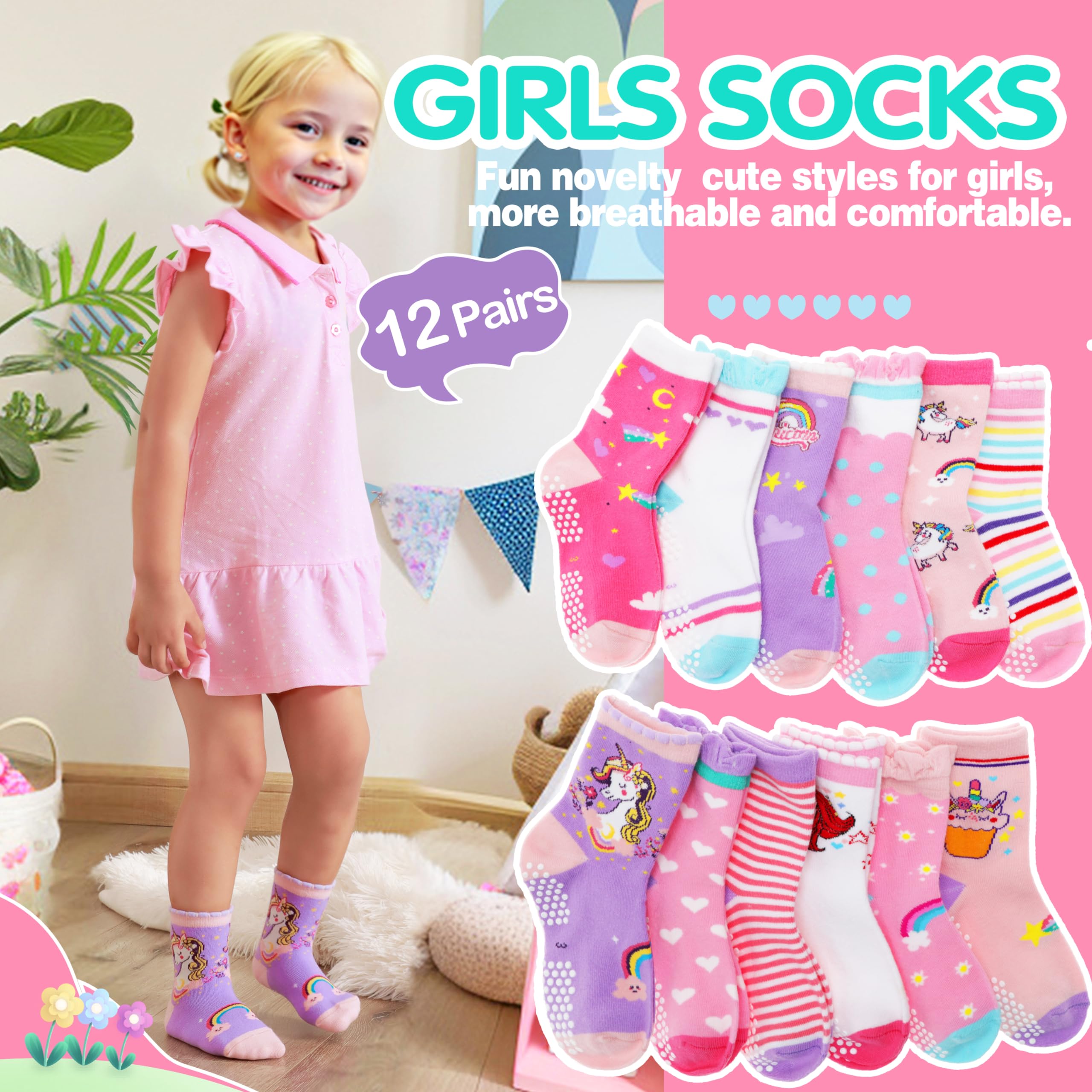 【High Quality Material】These baby girls girps fun socks are made of 90% cotton, 8% polyester, 2% spandex. They are breathable and keep kid’s feet dry all the day.
