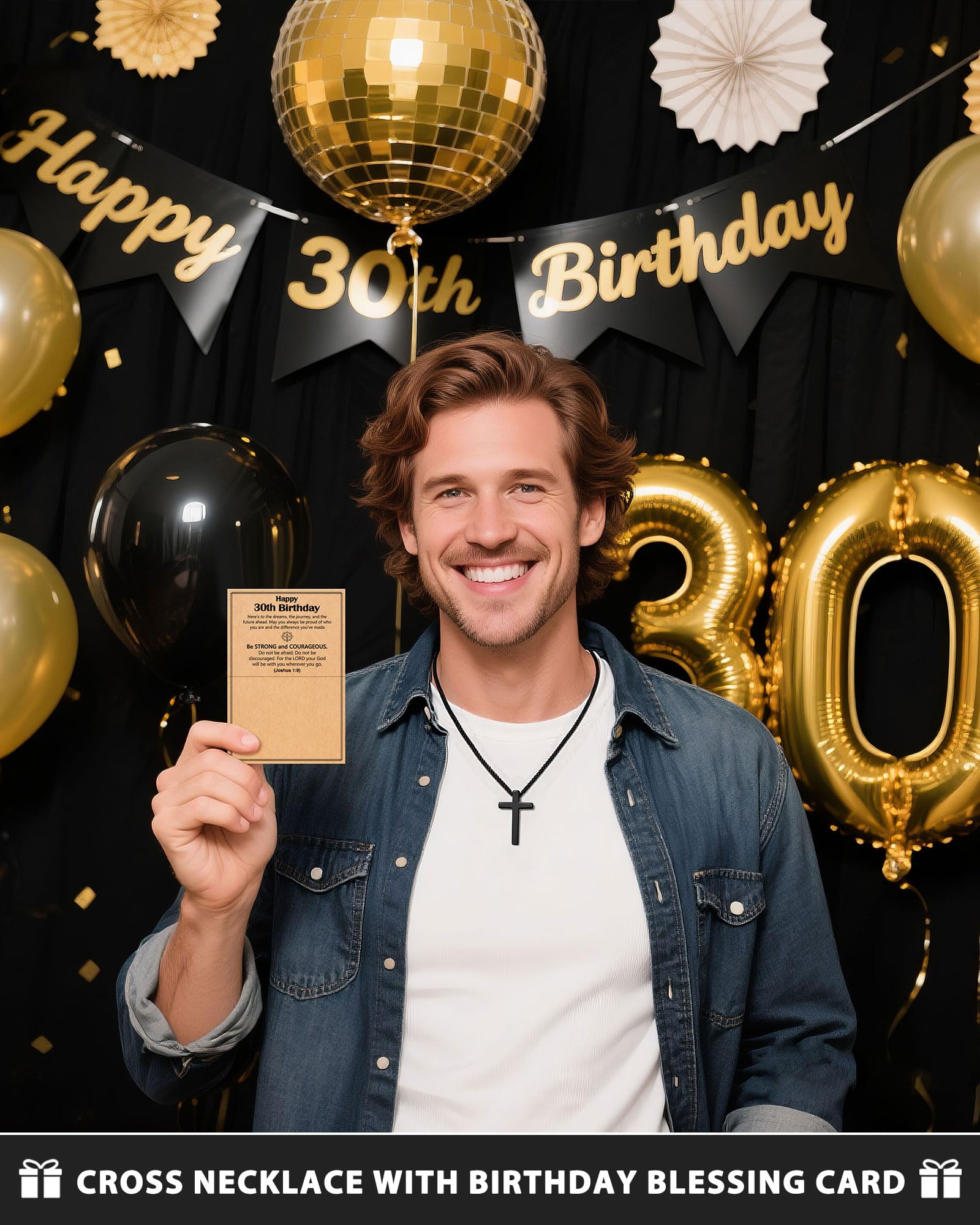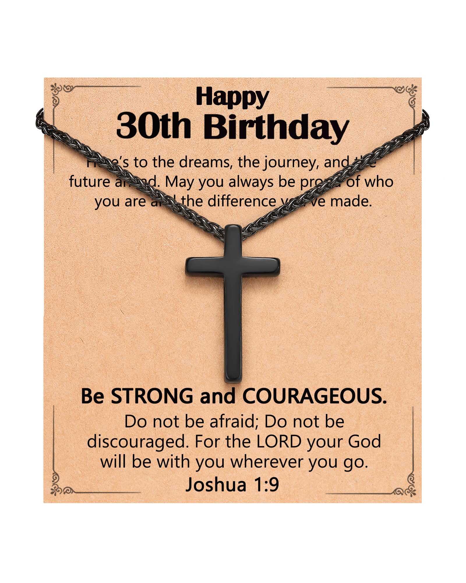 HAPPY BIRTHDAY CROSS NECKLACE: Celebrate his birthday with a heartfelt Christian present. This black cross necklace carries a powerful blessing of courage, strength, and God's love