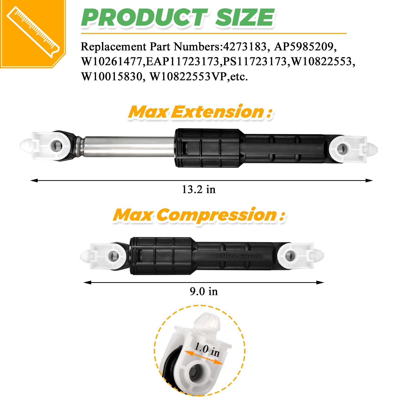 ✔✔【W10822553 WASHER SHOCK ABSORBER】: W10822553 whirlpool washer shock absorber prevent washer displacement by reducing the vibration of washing tub. 8182812 washer shock absorber is made of high quality rubber and metal material, and its internal metal piston has a layer of oily material attached to its surface, can effectively prevent rust. W10822553 washer shock absorber has good toughness, strong oil resistance, very resistant to weak acids and alkalis, prolongs the service life