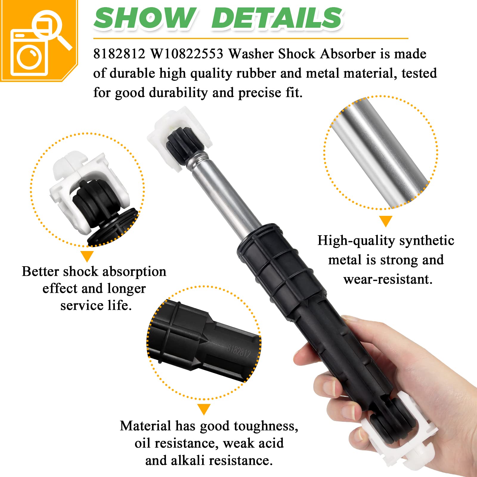 ✔✔【4PACKS W10822553 WASHER SHOCK ABSORBER】: Package Includes 4 x 8182812 W10822553 Washing Machine Shock Absorbers. W10822553 washer shock absorbers are used in the front load washing machine to buffer unbalanced loads. The 8182812 washer shock absorber is made of high quality rubber and metal material, sturdy and resistant, effectively solve the problem of washer shaking and rattling