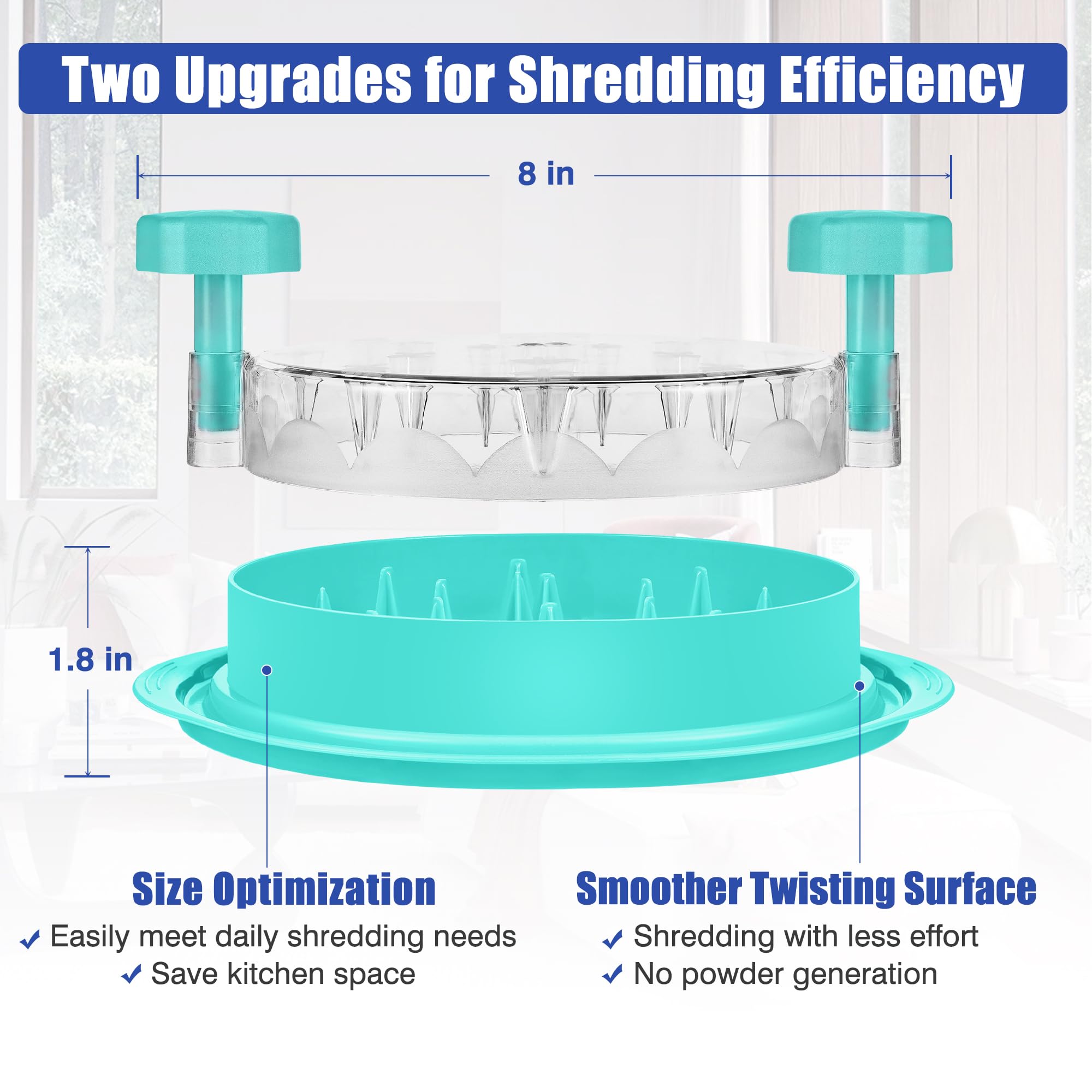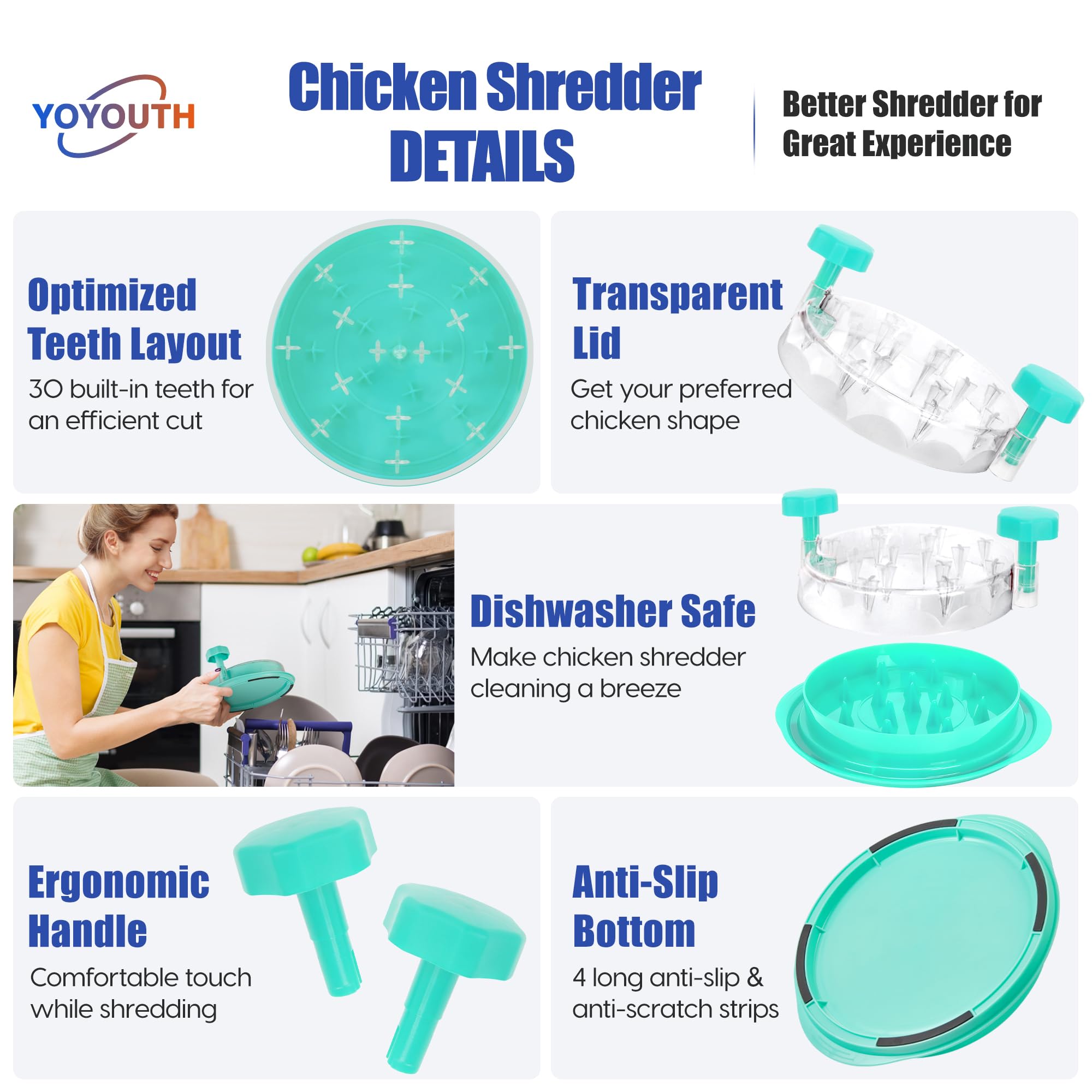 【33% Up in Shredding Efficiency】: With optimized layout, our chicken shredder's built-in teeth cover the entire area, and the extra spikes on the edges of the lid help gather shredded food in the middle for an even & efficient cut