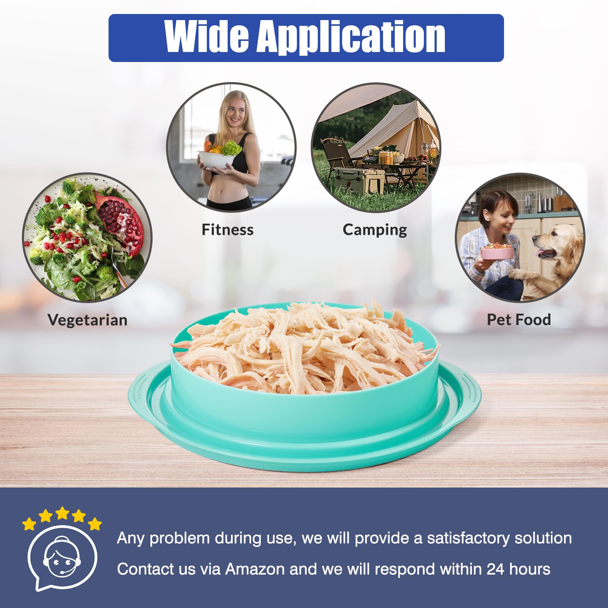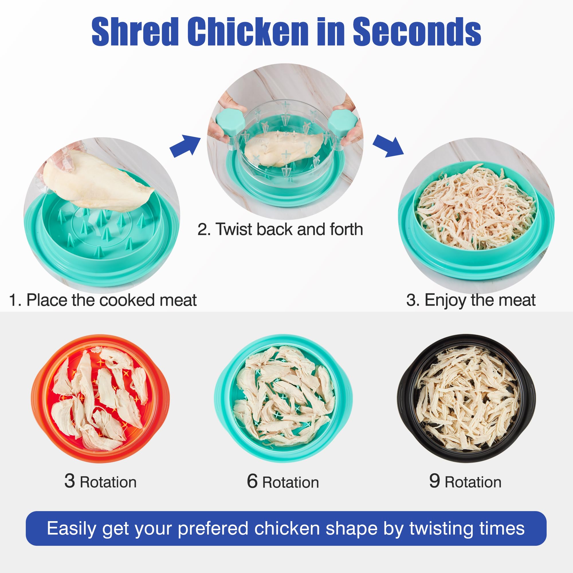 【Easy to Use】: ① Place the cooked meat into the chicken shredder; ② Cover with the lid and twist back and forth several times; ③ Open the lid to enjoy the shredded meat. Tip: You can see the meat state via the transparent lid, enabling you to adjust the times you twist to get your preferred meet shape