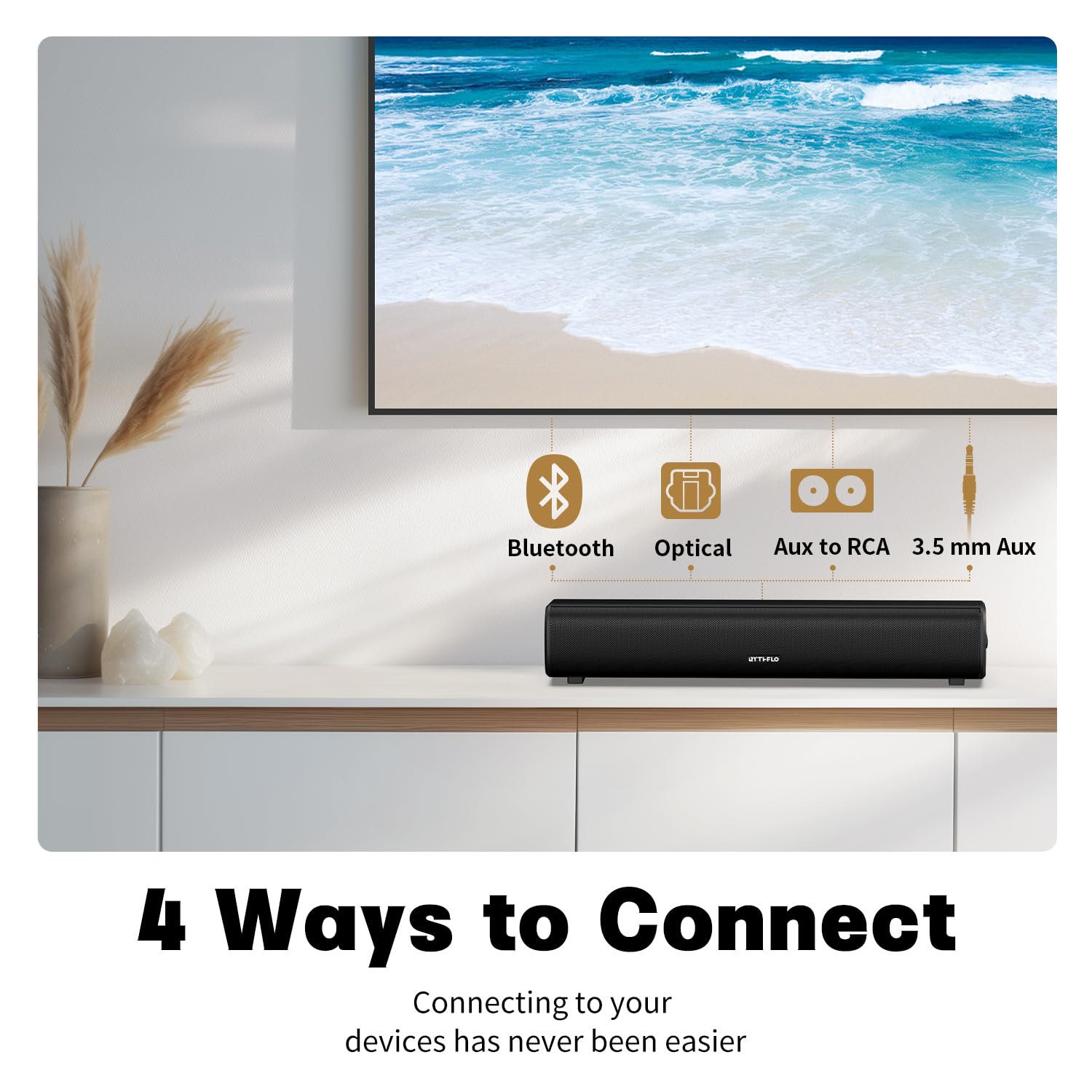 【4 Ways To Connect】Rythflo soundbar for TV provide multiple ways to connect: Bluetooth, Optical, 3.5 mm Aux, 3.5 mm Aux to RCA(Included). Connection has never been this easier.