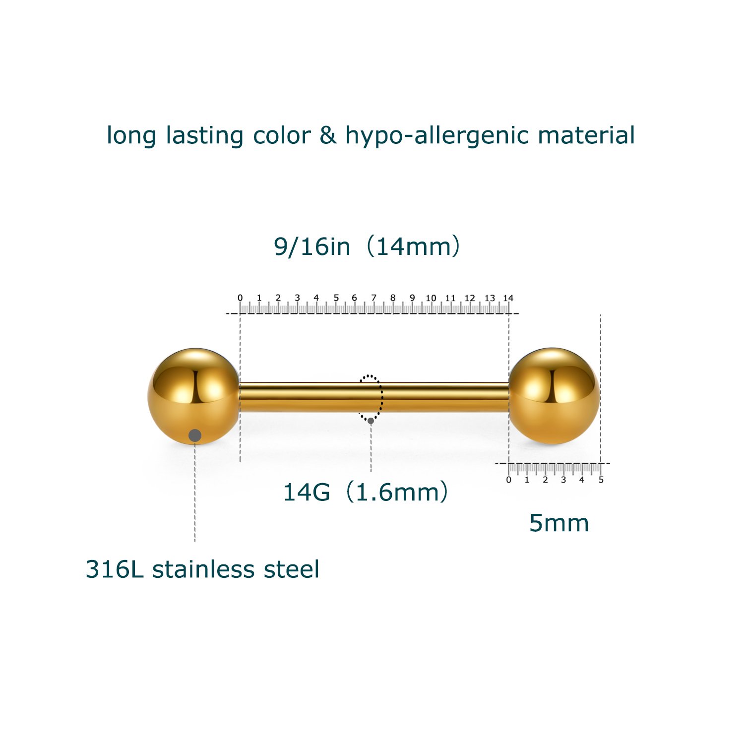 Size: 14G gauge (1.6mm), Bar length: 14mm (9/16 inch), Ball diameter: 5mm