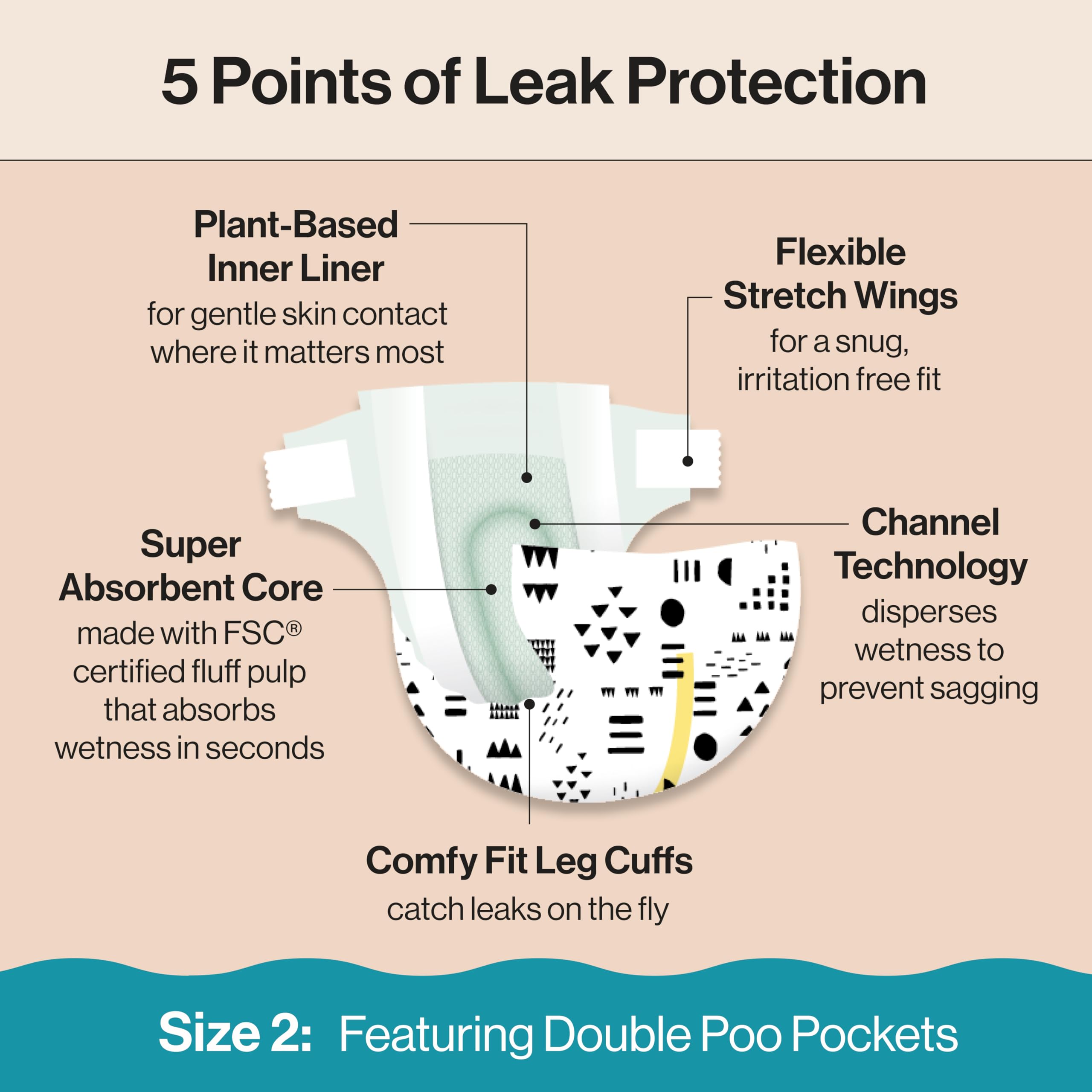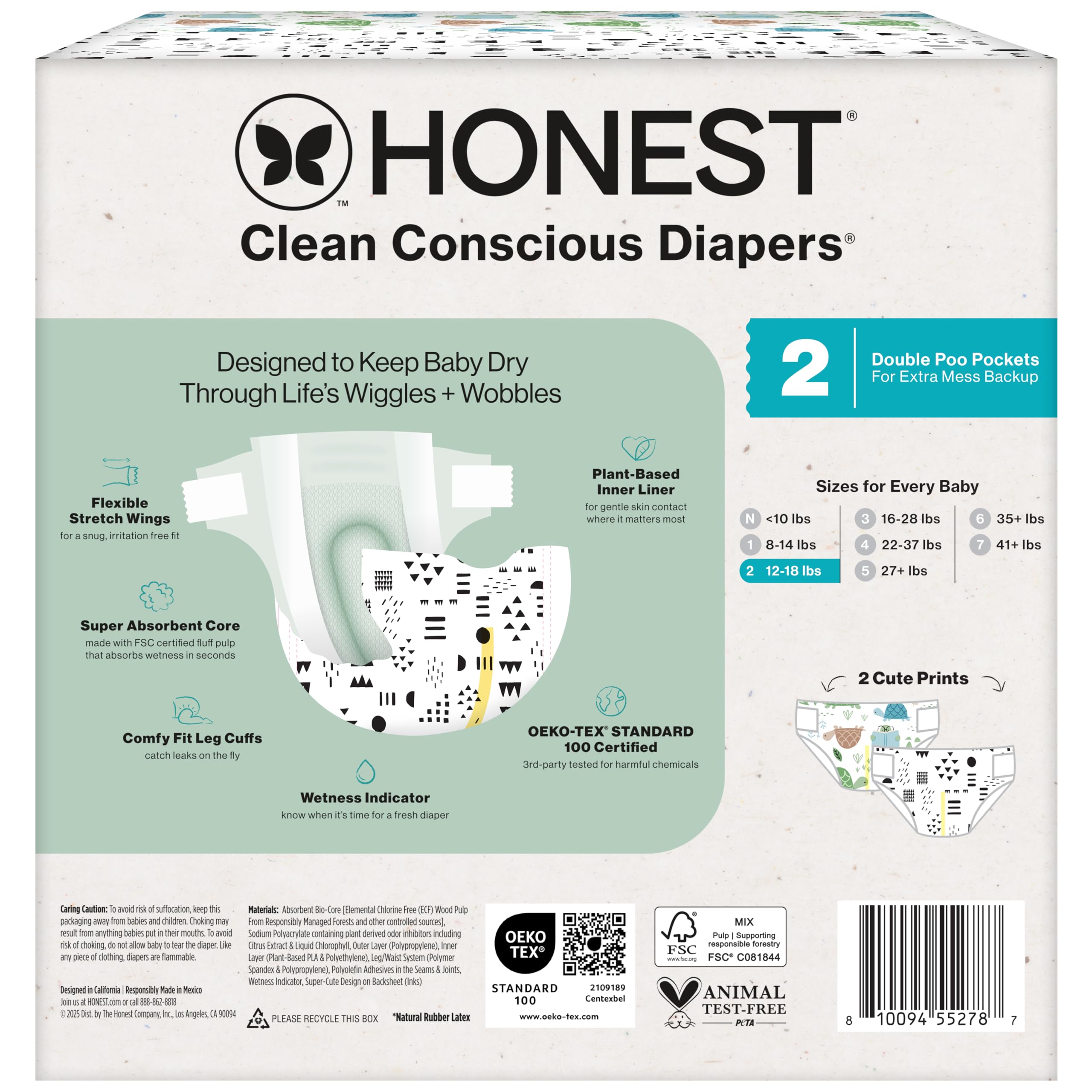 Designed to protect delicate skin, Honest Clean Conscious Diapers keep baby comfortable and dry through all the wiggles and wobbles Our softest diaper yet delivers up to 100% leak protection with Comfort Dry Technology. The hypoallergenic, plant based inner liner, flexible stretch wings, super absorbent core, and channel technology provide a comfy, secure fit for all ages and stages. Because safety is top priority, these diapers are OEKO-TEX STANDARD 100 Certified, a 3rd party that tests for 350 harmful chemicals, and made with FSC Certified Fluff Pulp and other controlled materials. And for cuteness overload, each diaper features a super cute print.