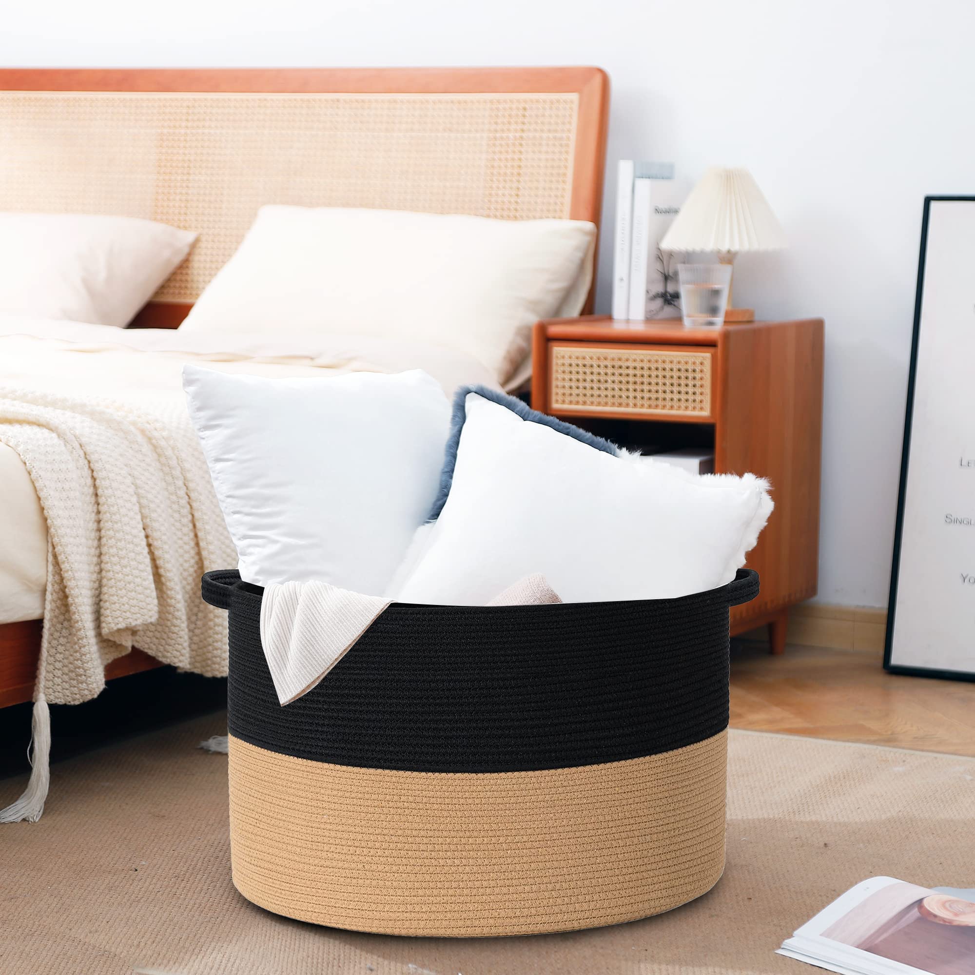 Modern Two-toned Neutral Color Appearance Bin: A neutral toned woven baskets double not only as a storage bin, but also as a large fabric decorative storage basket. Blend boho, Scandinavian, farmhouse, modern, rustic, coastal and classic decor perfectly in the house. Our big blanket holder is a professional organizer in family room.
