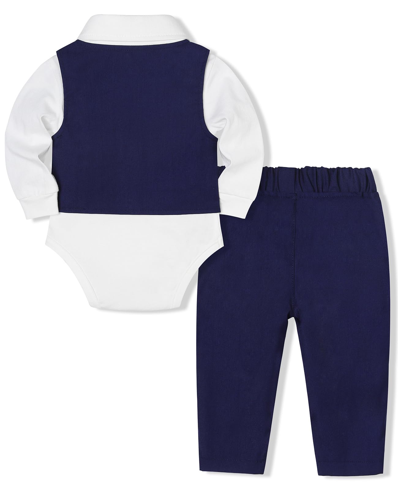 Package Includes: 1x Dress Shirt with Bow Tie, 1x Vest, 1x Pair of Pants. This set offers your baby boy the perfect balance of comfort and style for daily wear or any special event, whether it's a holiday, family gathering, or celebration.