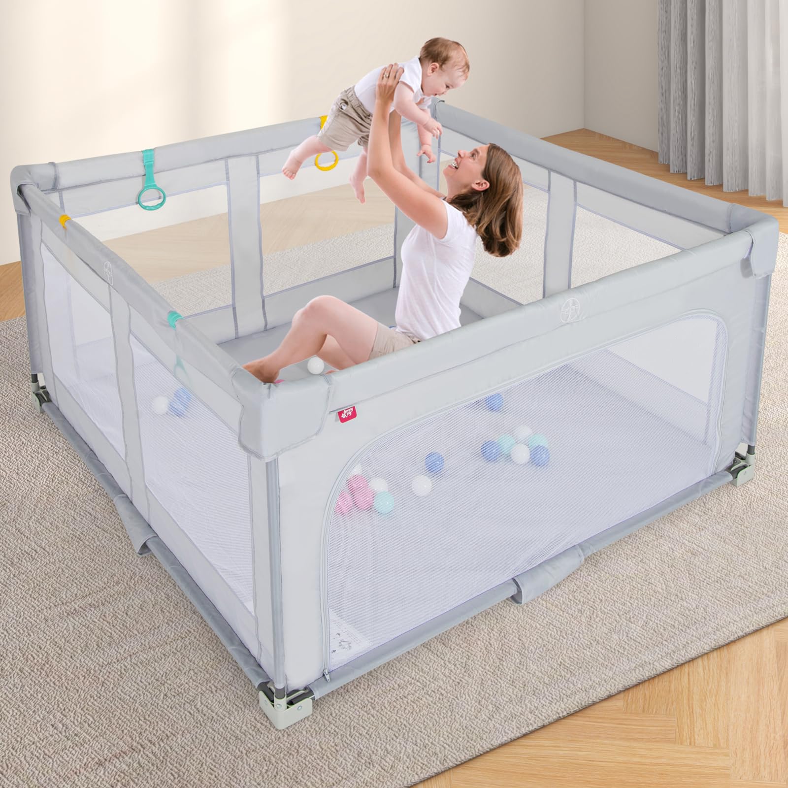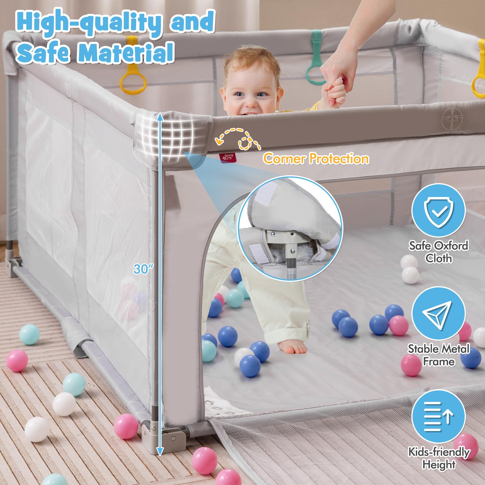 Description: Our spacious baby playpen is designed for children up to 3 years old. With dimensions of 59" x 59", this playpen offers a considerable area for your baby to safely crawl, walk, stand, and enjoy playtime. For added convenience and fun, the playpen includes a zip-open side door for easy access, 50 colorful ocean balls, and 4 pull-up rings that help in developing your child's physical activity and motor skills. 360° see-through mesh cloth not only enhances durability but also allows for continuous interaction and visual contact. Moreover, the playpen is foldable and comes with a carry bag, making it easy to set up, fold down, and transport. When you need some free time to cook, prep, or have some alone time, you may need a secure playpen for your baby to free your hands. Our premium baby playpen is definitely a great option! Features: Safe, soft and elastic materials can give babies a comfortable touch Large playing space for baby to play, crawl and walk Breathable mesh design provides good visibility and ensures safety Height of the panel is suitable for the baby to learn to walk External double-zippers prevent the baby accidentally exiting 50 colored balls are included for added entertainment Seamless fit and anti-collision foam pads at joints Easy setup with tool-free folding and unfolding Compliant with ASTM and CPSIA standards Specifications: Color: Grey Material: Oxford Fabric + Mesh Cloth + Metal Overall Dimension: 59" x 59" x 30"/150 cm x 150 cm x 76.5 cm (L x W x H) Side Door Dimension: 47" x 21.5"/120 cm x 54 cm (L x H) Suitable Age: 0-3 years old Net Weight: 16 lbs/7 kg Package includes: 1 x Baby Playpen 50 x Ocean Balls 4 x Pull-up Rings 1 x Carry Bag 1 x User Guide