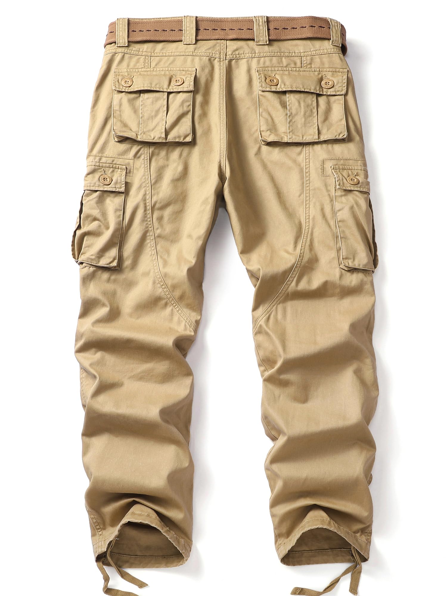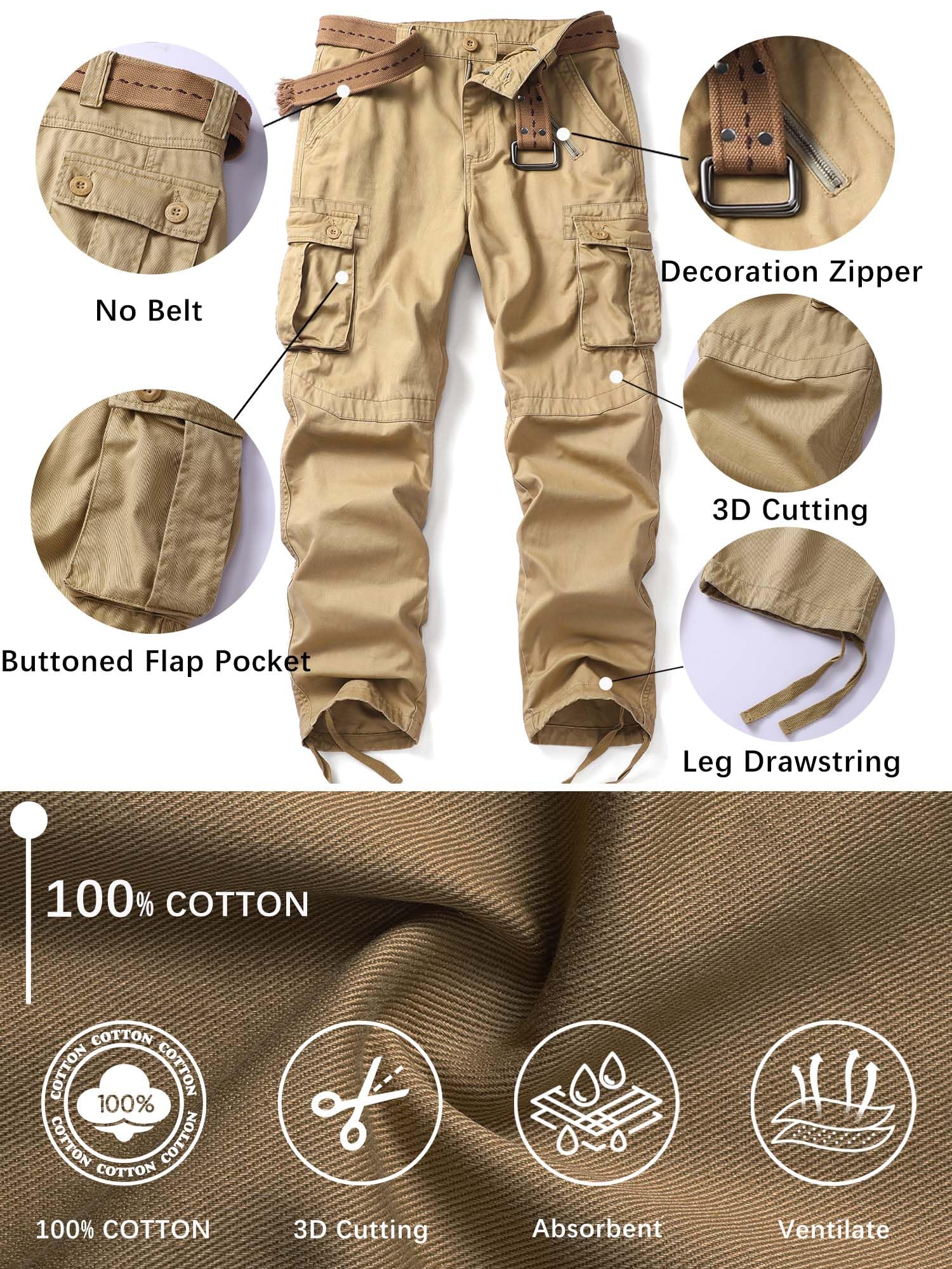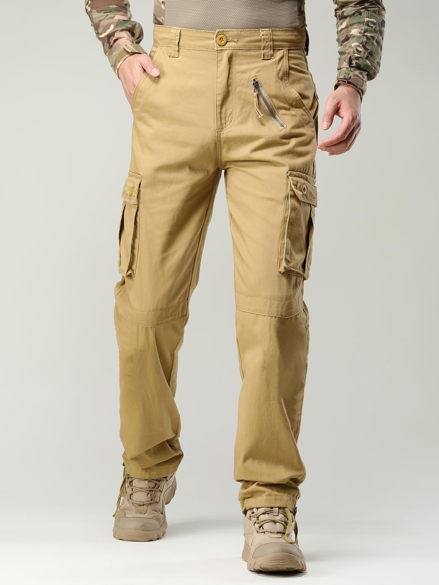 Product features: The men's cargo pants is built with fashion and comfort in mind,sits at waist,relaxed fit, the straight leg openings with drawstring tie to fit with boots, and be great for hunting pants,camping pants, working pants, tactical style, costume pants. Also,The casual work cargo pants you were wearing didn't rip even as you walked over briars because to the double-thread sewing,durability, ripstop, and scratch resistance.