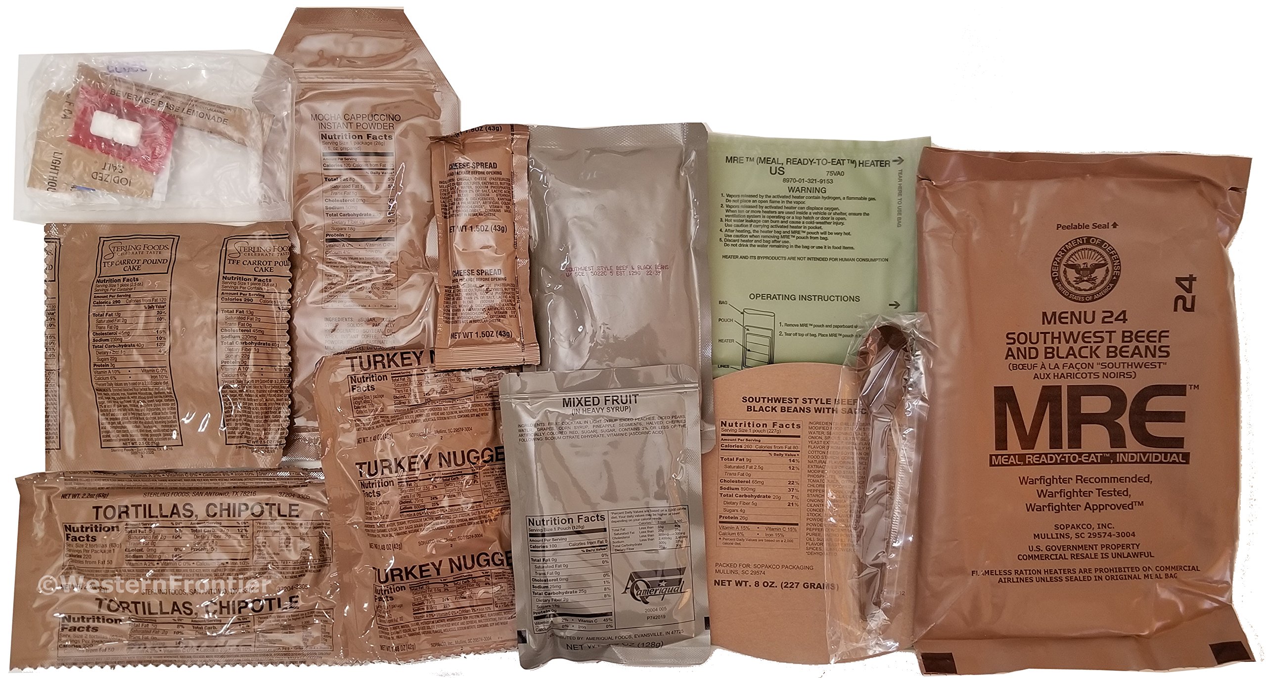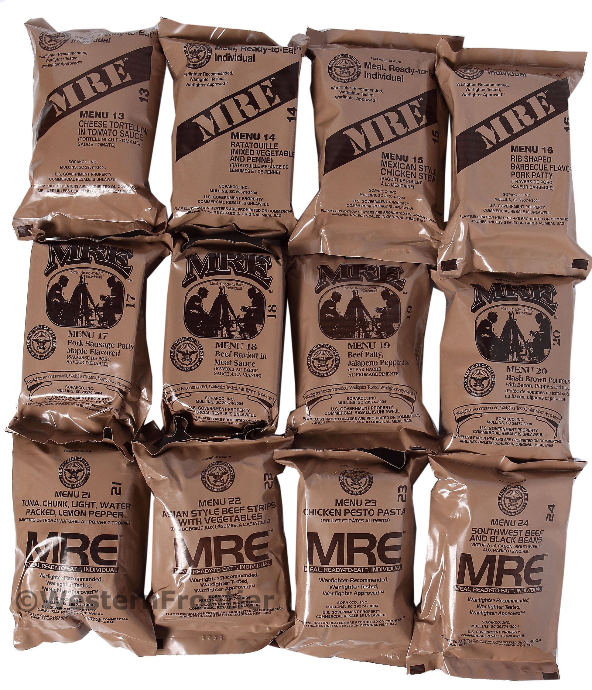 24 total Military Surplus MREs shipped in two cases. Menu Case A and Menu Case B bundled together to give a total of 24 different meal entrees. Made to sustain US Military troops in combat, these are hands-down the best MREs available anywhere. Approximately 1250 calories per meal. Meals include a variety of tasty Asian, Mexican, Italian, traditional, and vegetarian cuisine. Includes a large assortment of snacks, deserts, coffee, cappuccino, milk shakes, and hot chocolate. Only Military MREs include an accessory pack with flavor enhancing seasonings, matches, toilet paper, and other survival essentials. New meals for 2018s include Jalapeno Pepper jack Beef Patty and Garlic Chicken Breast. Also, the popular Lemon Pepper Tuna entree has returned in B-Case 2018s. SHELF LIFE: MREs do not have an expiration date. They have an inspection date and a pack date. The Inspection date is three years after the pack date, and the inspection date is the date the Military inspects the cases during long term storage to verify they are still fit for consumption. Manufacturers suggest that meal contents are good for approximately 5 or more years when stored at room temperature. Meals stored in cooler temperatures stay fresh longer. Always inspect the red Time Temperature Indicator (TTI) found on top of the case. Note: Product made by Sopako, Wornick, or Ameriqual. Contents vary from case to case and what is shown in photos. Manufacturers often substitute products and change meal numbering or entrees. There are no guarantees on packed contents. Not all meals will include flameless ration heaters. Periodically, non-mil spec candy will be packaged that does not have the same shelf life as the mil-spec contents. Please inspect and read all expiration dates of non-milspec candy products.