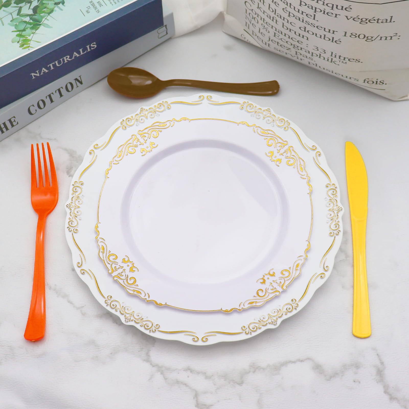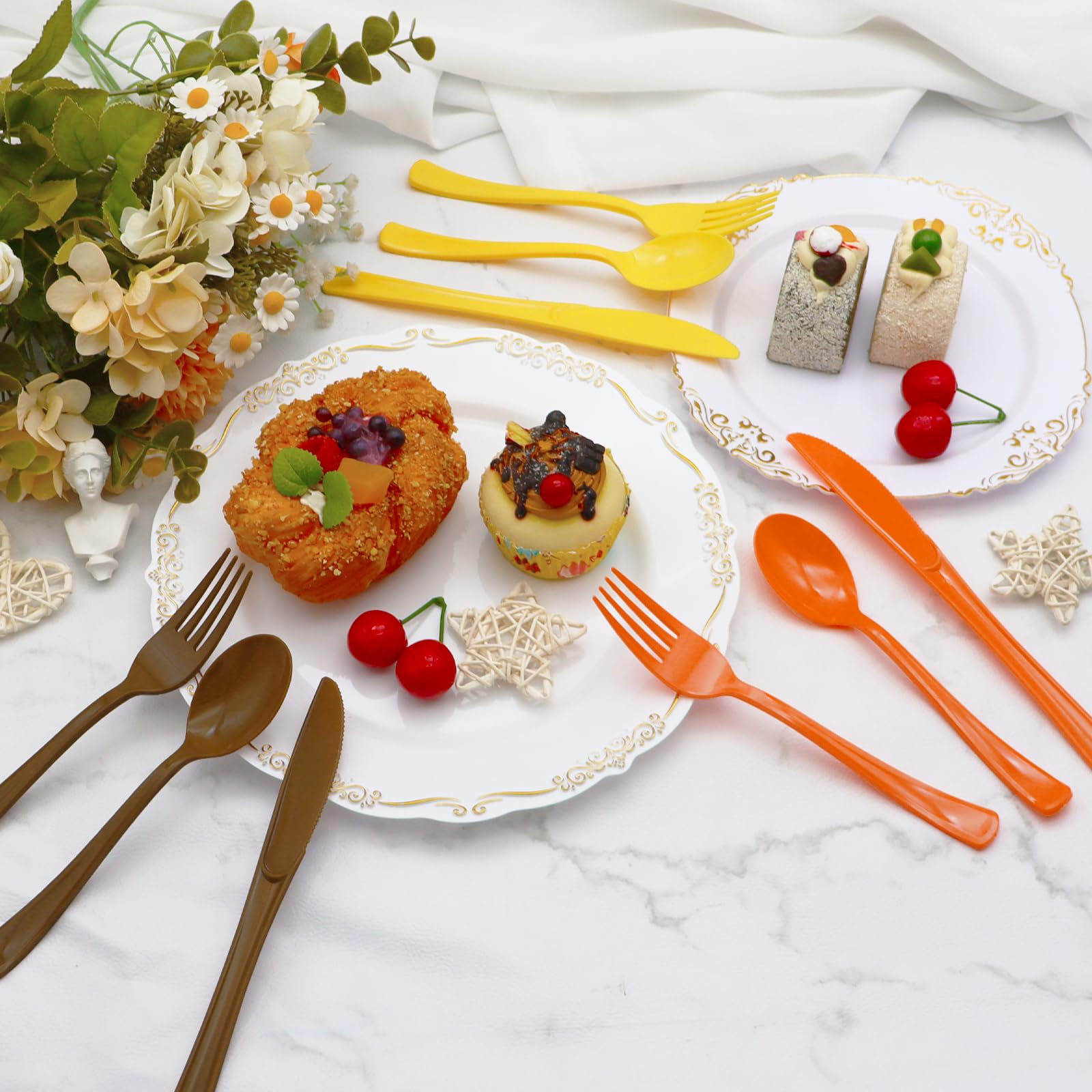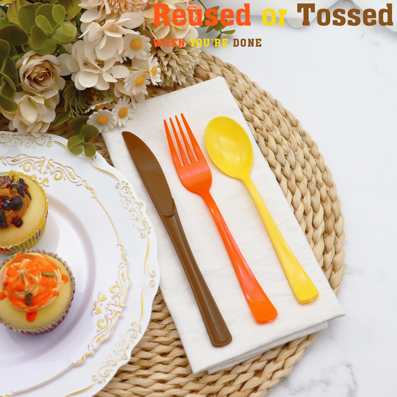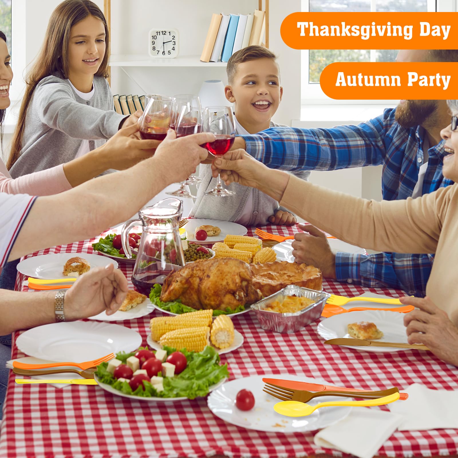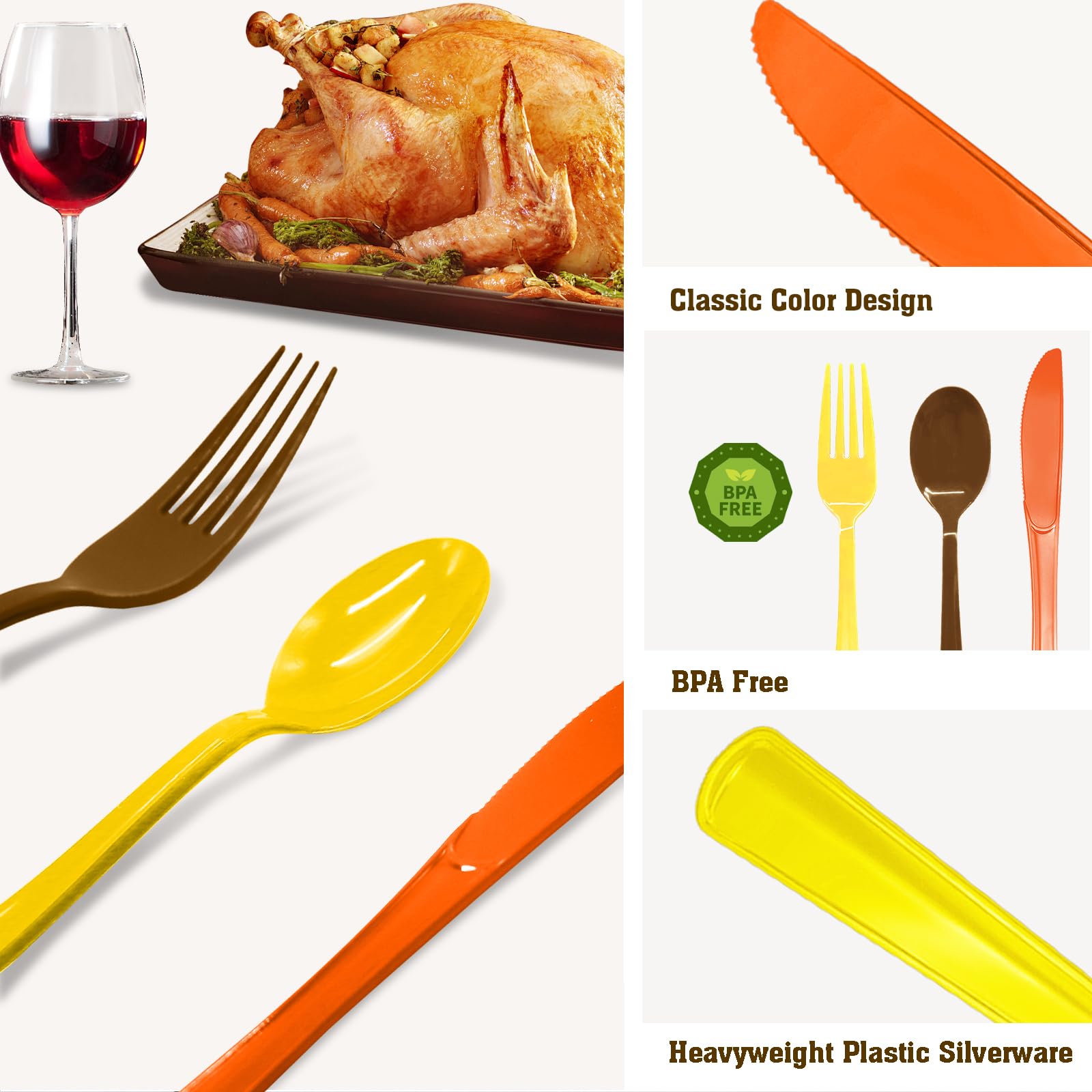 【Classic Color Combination】: Thanksgiving plastic silverware set adopts three classic Thanksgiving colors of orange, yellow and brown, which perfectly fits the festive atmosphere. Not only practical but also decorative, add beauty to your table and create a festive feeling for Thanksgiving party.
