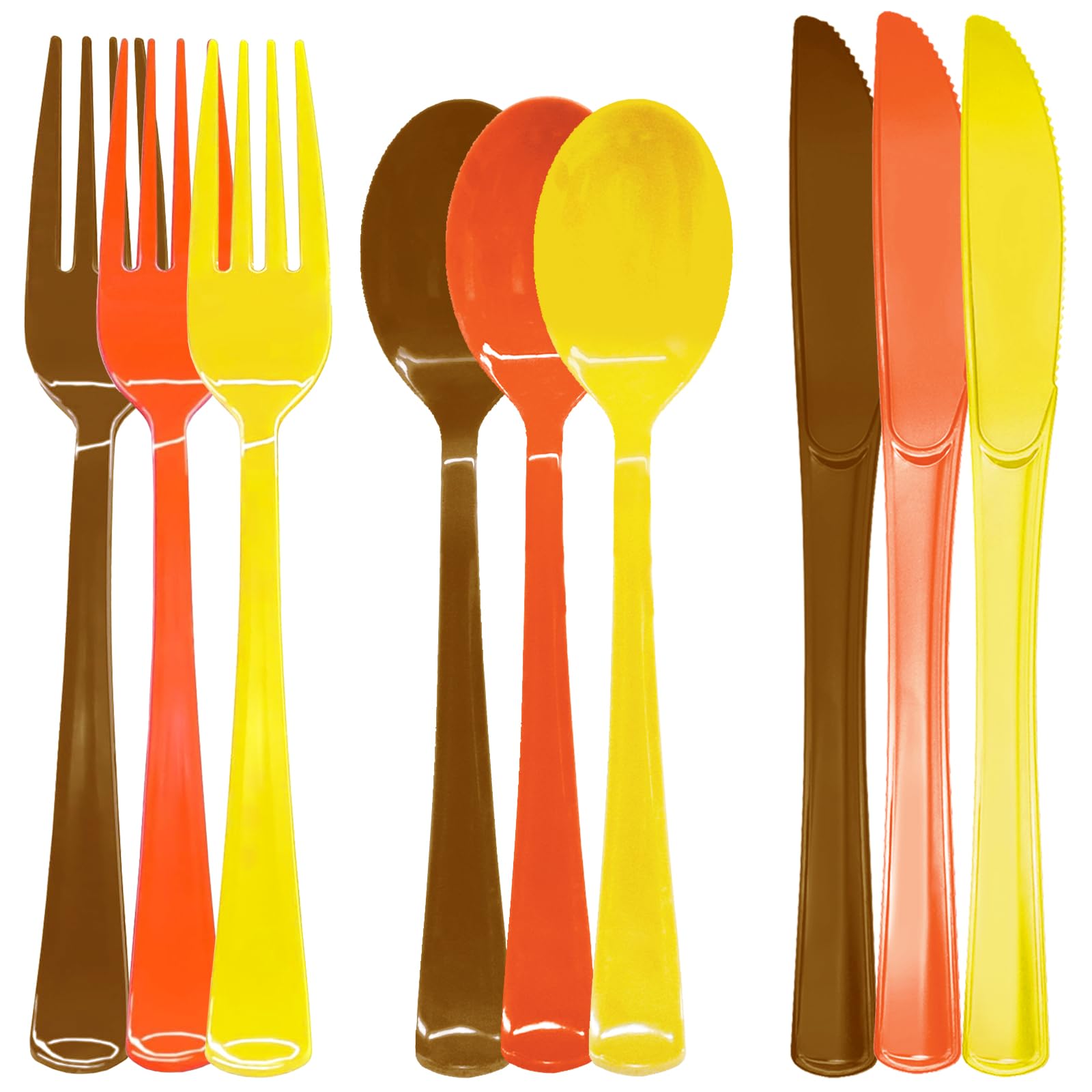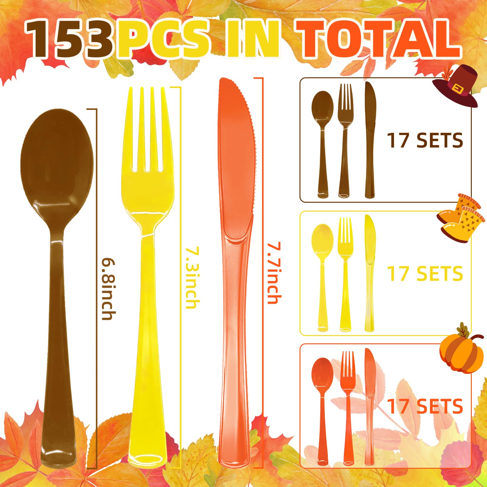 【Hight Cost-Effective】:This set of Thanksgiving cutlery Sets includes 17 sets orange plastic silverware, 17 sets yellow plastic silverware, 17 sets brown plastic silverware, can serves 51 guests at the same time. Sufficient quantity and perfect match for your Thanksgiving party needs.