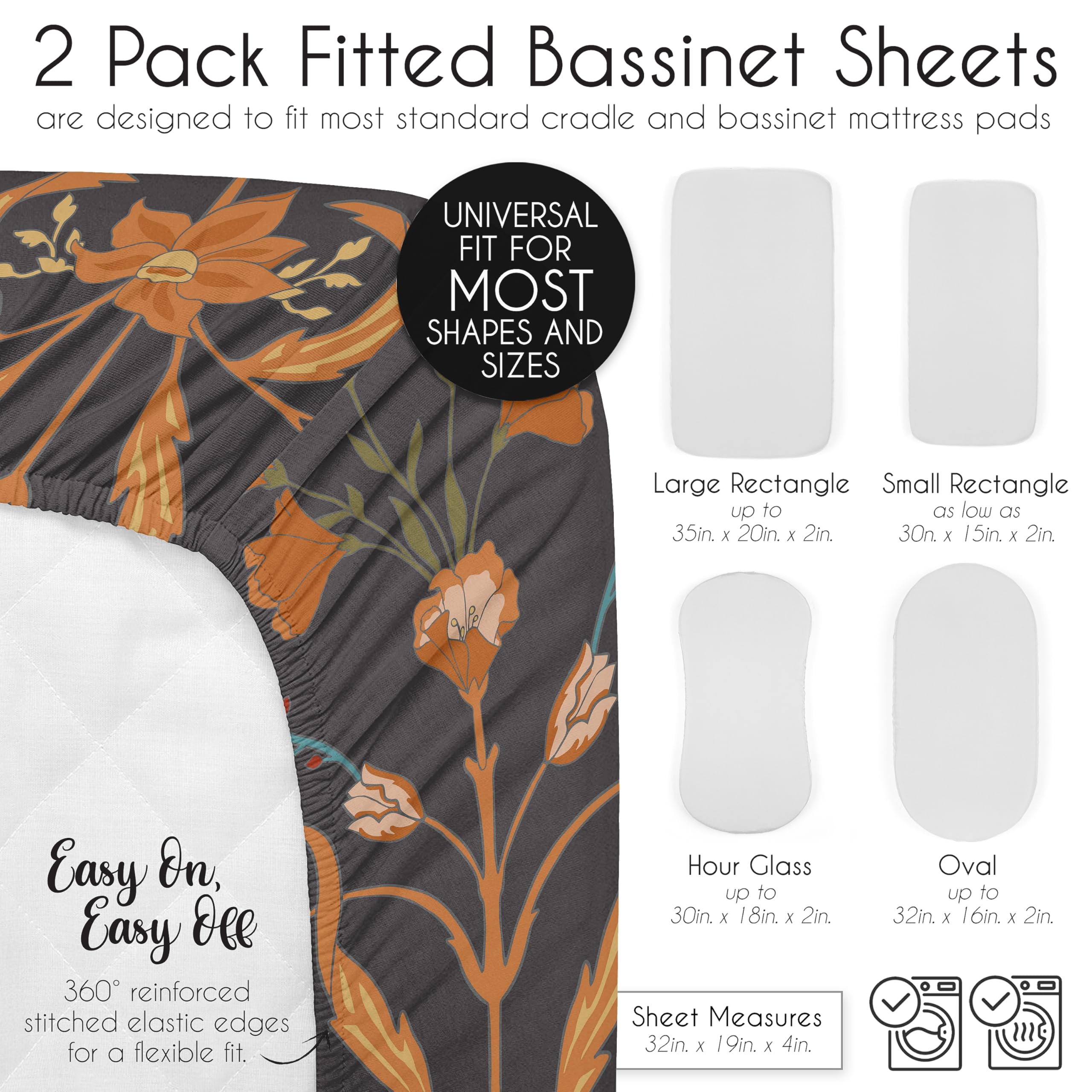 2 Pack Bassinet Sheet Set: 32in. x 19in. x 4in. each. WILL NOT FIT STANDARD SIZE OR MINI CRIBS