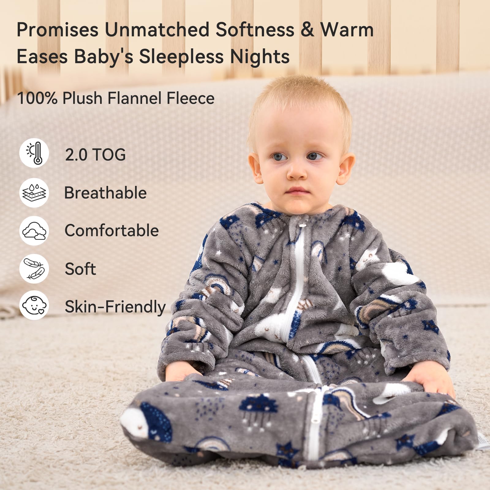 Softer & Warmer - Our 2.0 tog sleep sack is suitable for indoor temperatures of 64-70°F (18-21°C) during the fall and winter. This flannel sleep sack has a fine, soft surface fleece with a delicate, rich feel and a soft, while the interior fleece is soft and long, helping your baby lock in the warmth.