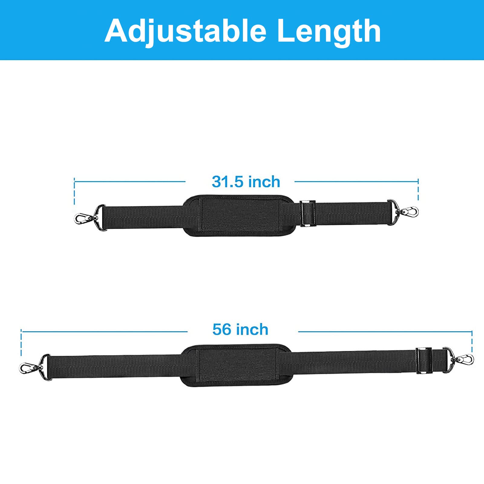 The comfort padded shoulder strap can be adjusted between 31.5 inch to 56 inch (80cm to 142 cm) in length, 1.5 inch in width. The easy adjustment in length allows for the perfect fit.