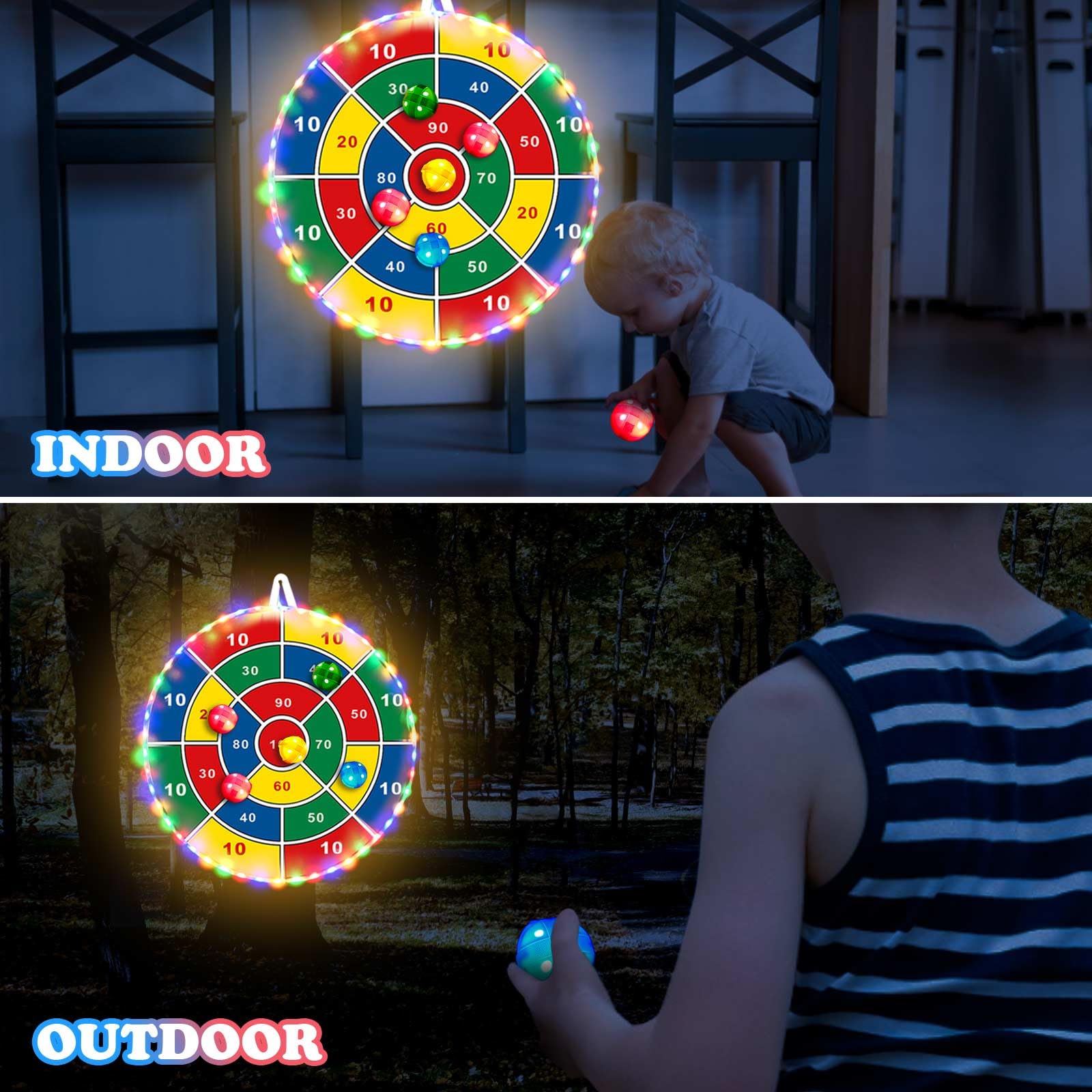 đź’•Large Size with 16 LED Sticky Balls:The kids dart board's diameter is 29"/in 4 colors, 1 hooks and 16 sticky balls, almost twice as size as regular dart board(14in). Extra large size available for more target area and friendly to kids or beginners. Multiple lighting modes and impact-activated LED dart balls allow you to enjoy the game and play day and night.