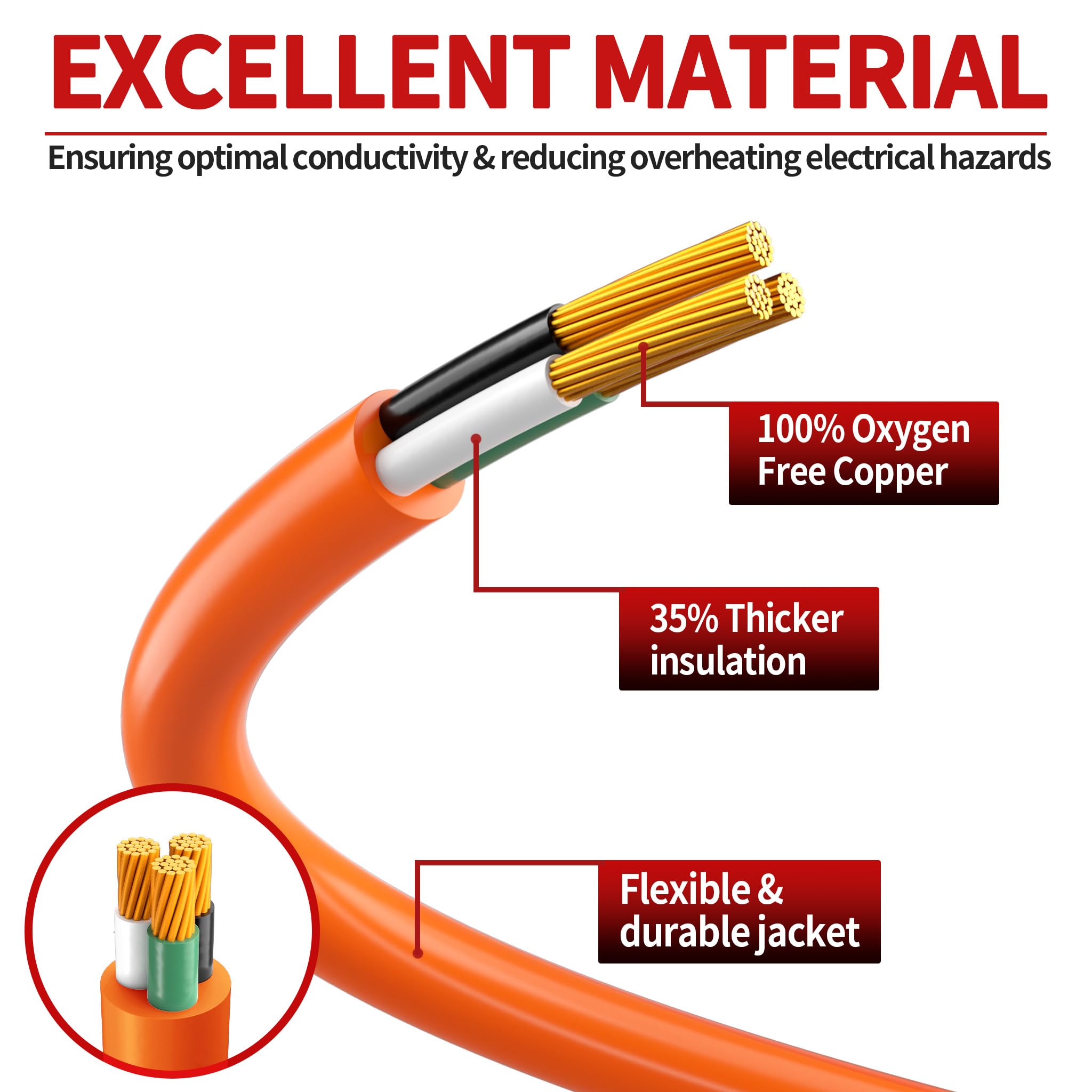 Durable Construction: Orange outdoor extension cord are made of 3 strands of pure copper core with thicker insulation in the middle and IP65 vinyl outer jacket; The pins of the 14 awg extension cord 6 ft male plug are made of special material that will not rust or corrode; The vinyl outer jacket is flame retardant, IP65 waterproof, -58°F cold and corrosion resistant