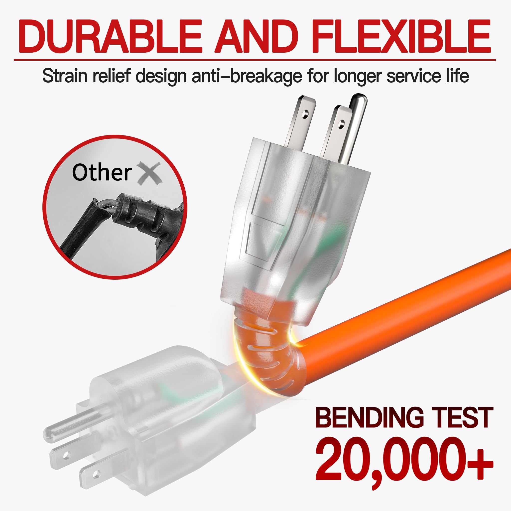 Indicator Light End: The LED indicator on the 6 ft outdoor extension cord 14 gauge illuminates when powered; 14awg extension cord illuminated end provides visibility in dark areas, effectively preventing tripping hazards in unlit work zones; each 14 awg outdoor extension cord undergoes 1500 volt high voltage testing to ensure electrical safety