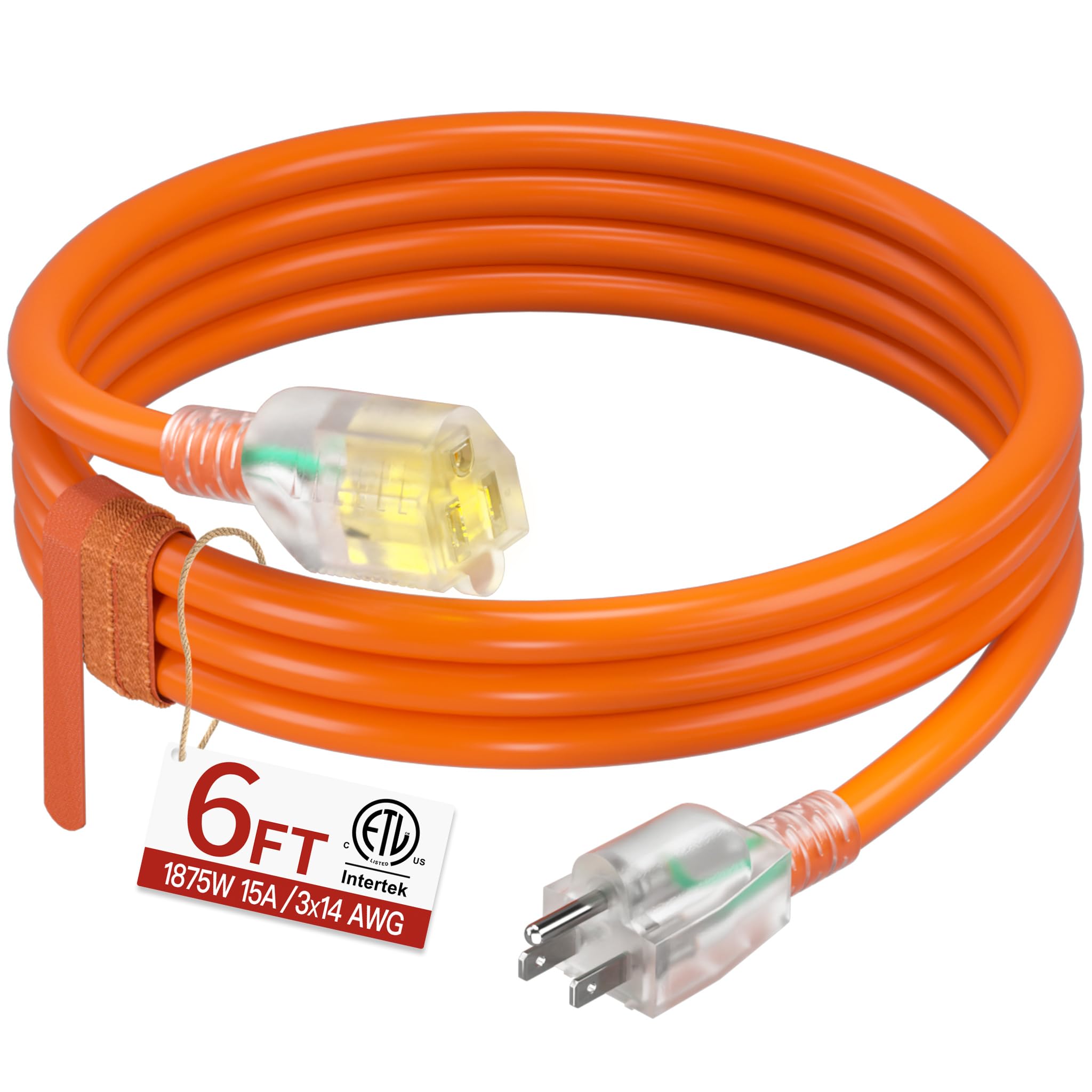 ETL Listed and Trusted: Heavy duty extension cord 6 ft rated 15 Amps, 1875 Watts and 125 VAC; Male NEMA 5-15P and female NEMA 5-15R; It is ETL/cETL Listed; ensuring its compliance with strict safety standards; Each outdoor extension cord passes a 2500V high voltage test before leaving the factory to ensure safety; Reliability and efficiency outdoor extension cord waterproof are capable of meeting most electrical needs