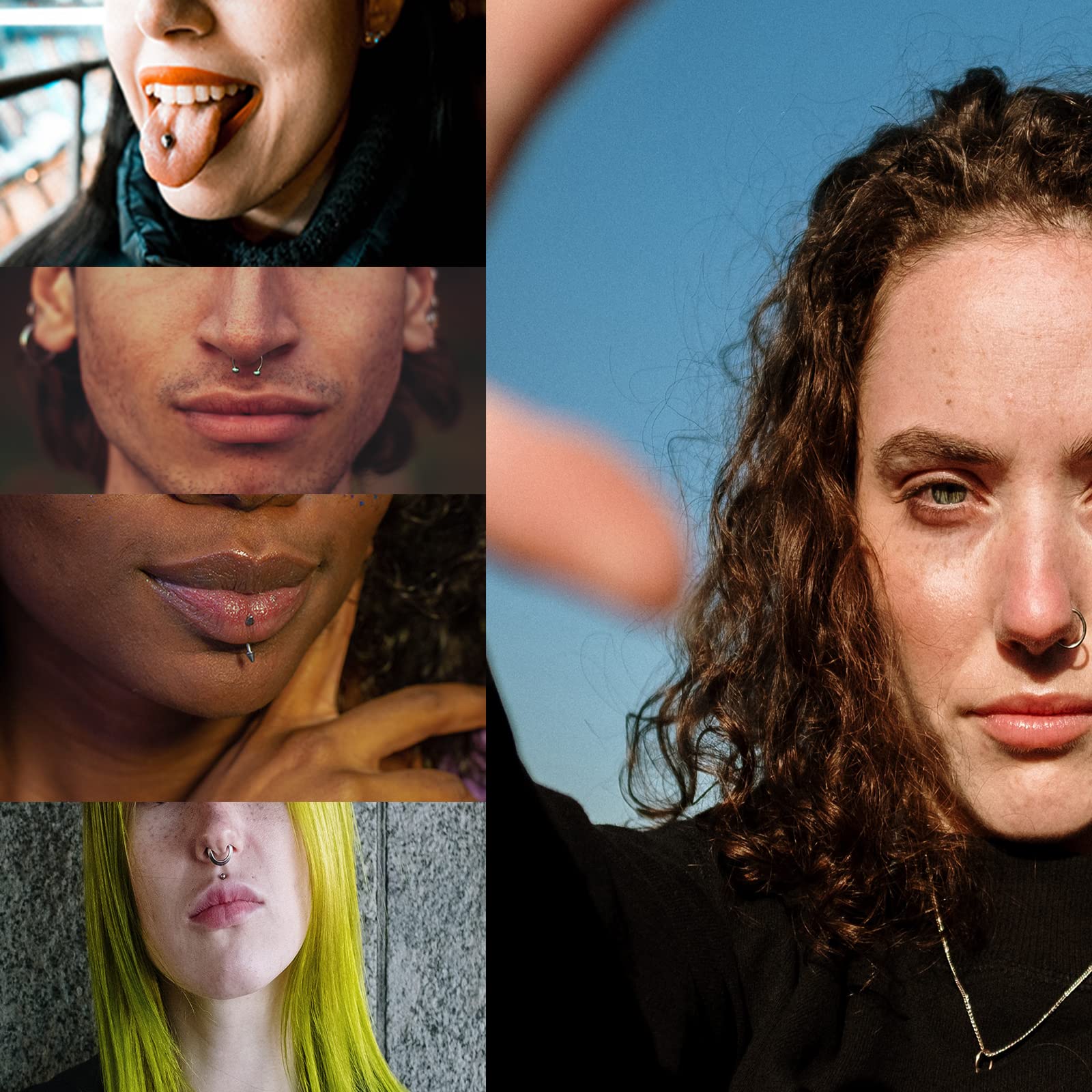 Body Jewelry Set Size: 10PCS 16G ear tragus ring with ball, 10PCS 16G captive bead ring, 20PCS 16G circular horseshoe barbells, 20PCS 16G labret lip studs with ball cone, 20PCS 16G eyebrow ring with ball cone, 10PCS 16G twist ring with ball, 10PCS 14G tongue barbell, 10PCS 14G belly button ring, 20PCS 14G industrial barbell with ball cone, 10PCS 14G nipple ring, 10PCS 20G seamless ring