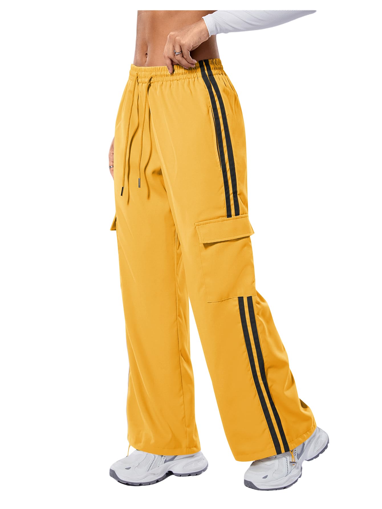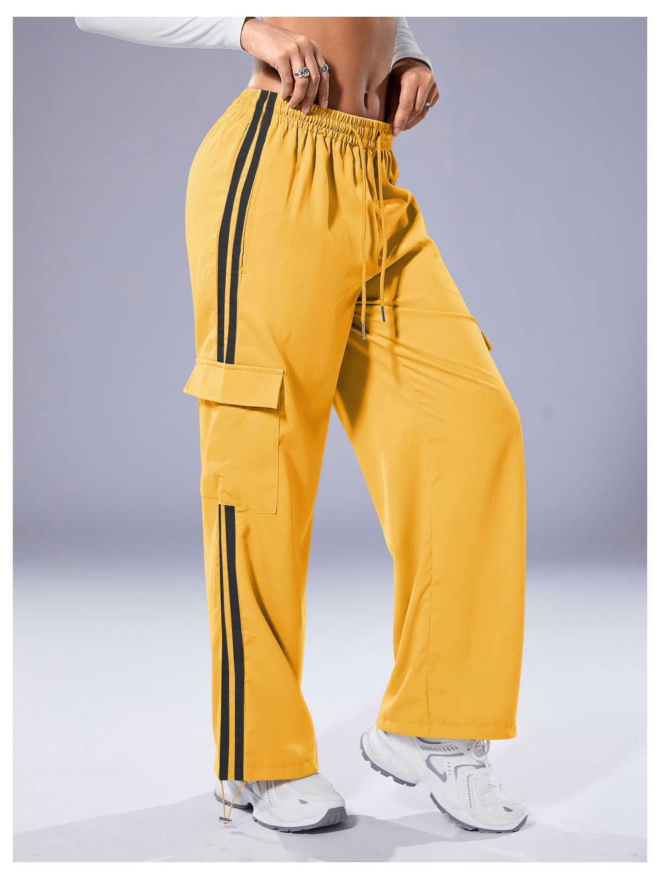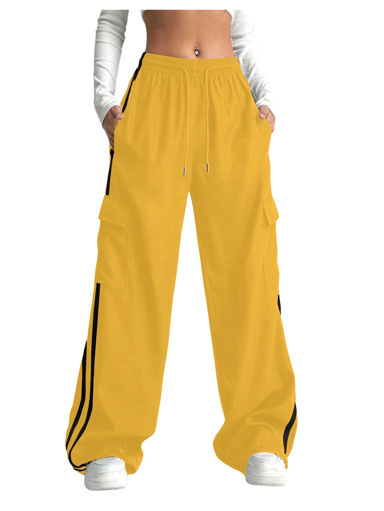Drawstring Front and Hem, Elastic High Waist, Cargo Pocket Side, Straight Leg, Patched Stripes, Casual Long Pants
