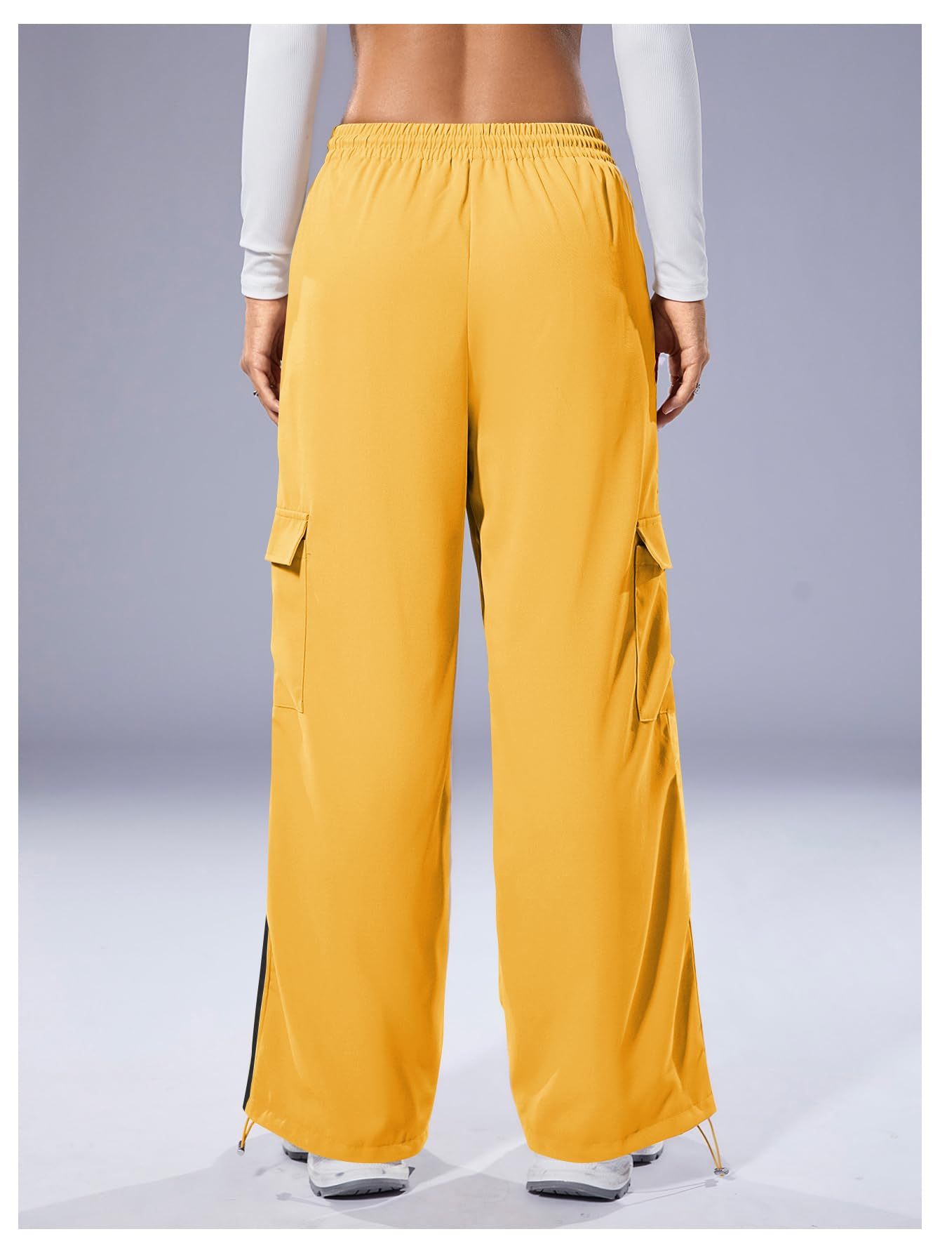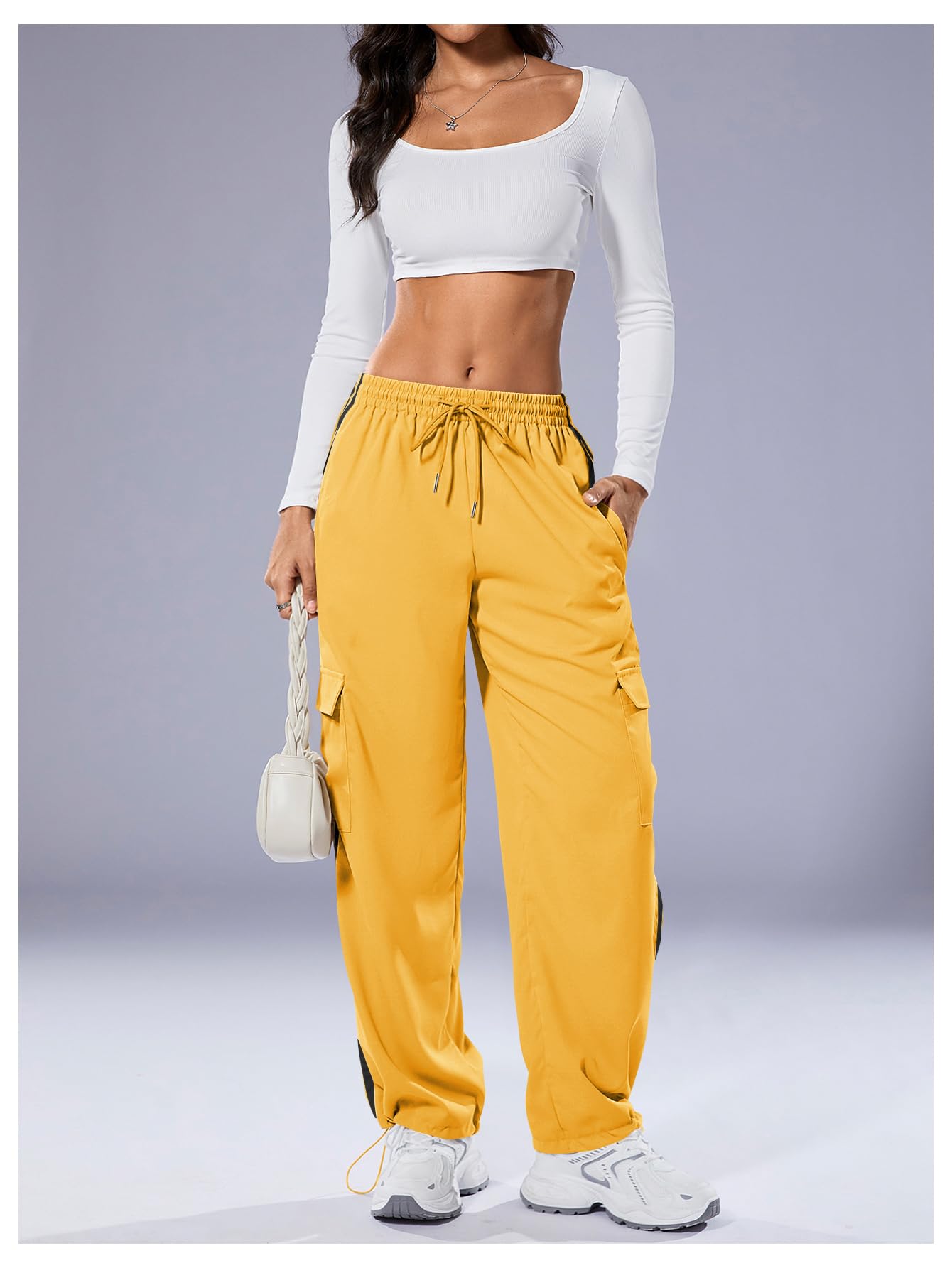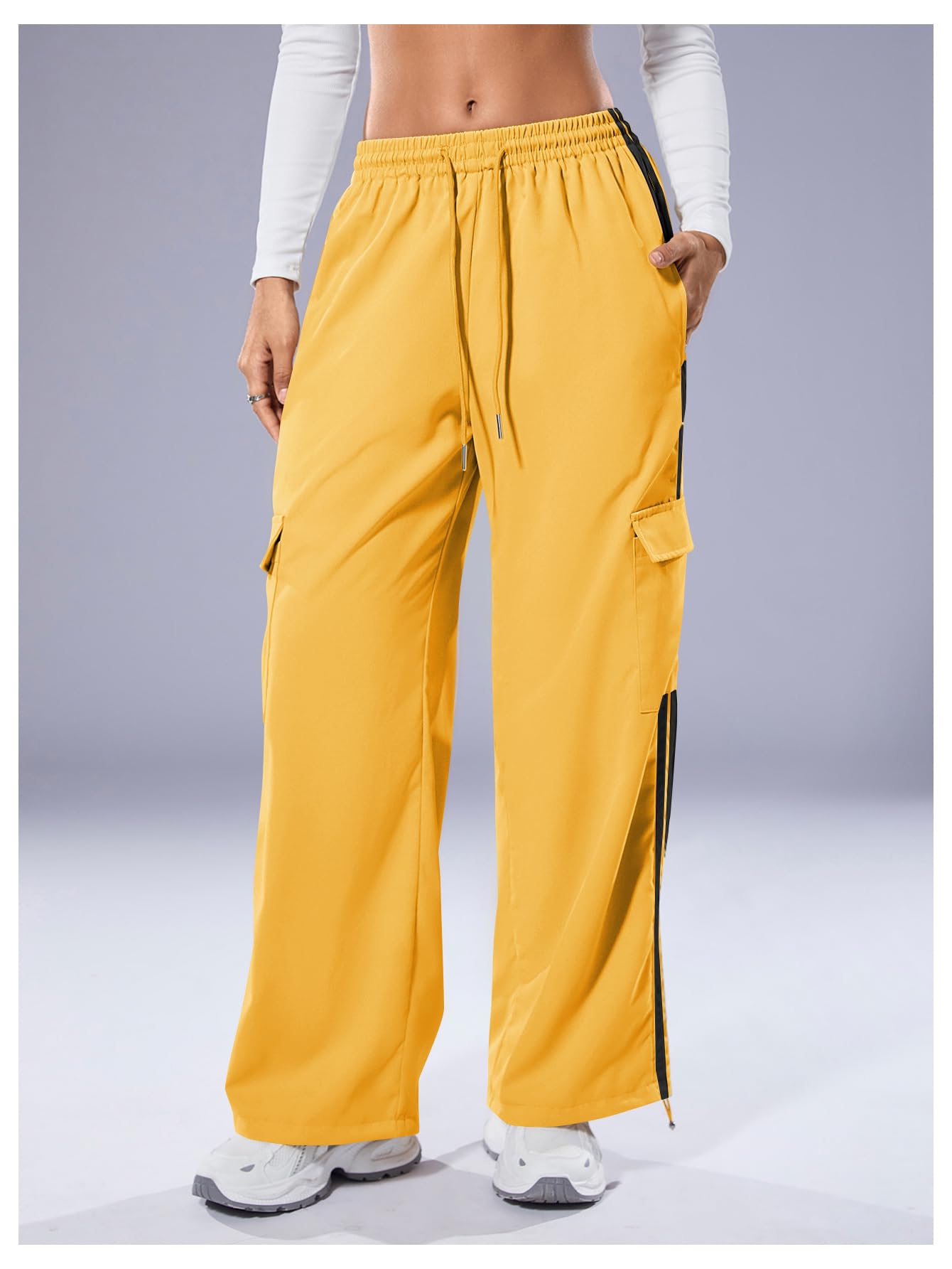 Drawstring Front and Hem, Elastic High Waist, Cargo Pocket Side, Straight Leg, Patched Stripes, Casual Long Pants