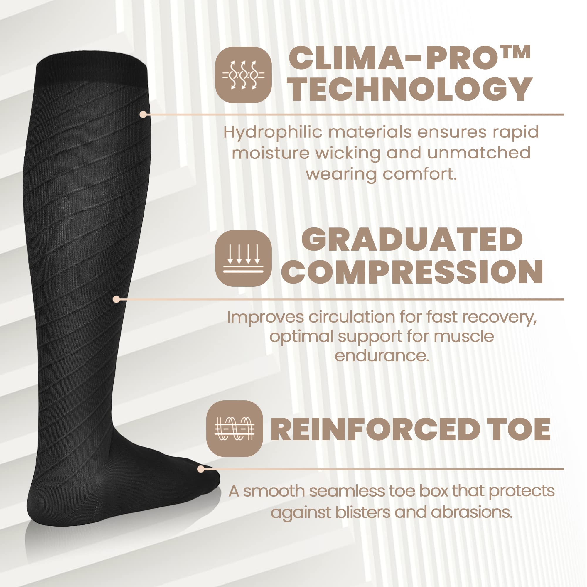 【FIBER CONTENT】Newzill CLIMA-PRO Graduated Compression Socks are comprised of 35% Spandex 65% Polyamide and they are Latex Free